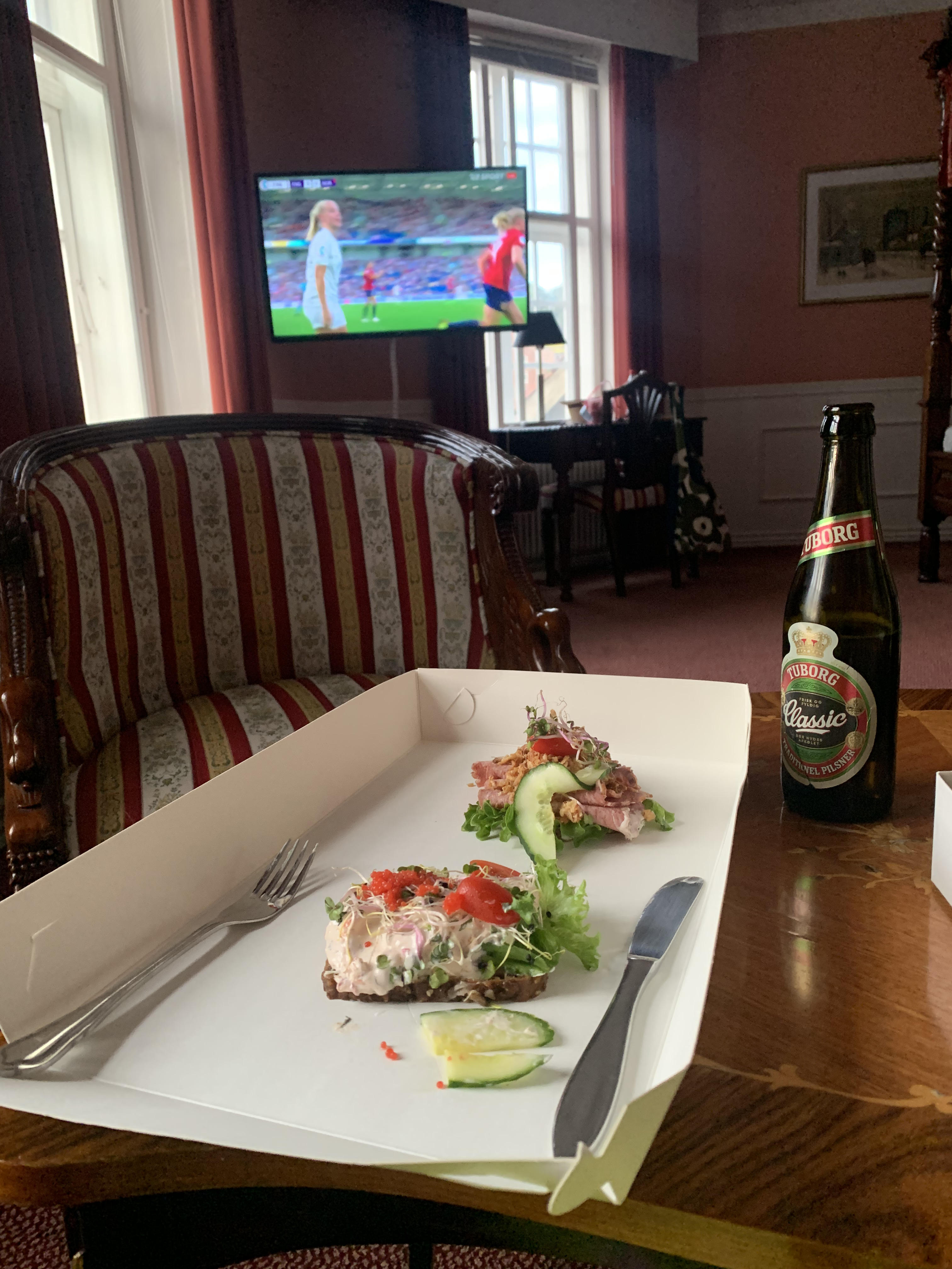 Vi låter oss väl smaka och underhålls av matchen, den häpnadsväckande mellan England och Norge (8–0). Z försöker locka in mig i ett danskt antikprogram, men gubben är gammal och trött, kroknar efter en intensiv dag med bilkörning och det hela. Jag somnar. Det gör hon också. Men senare.