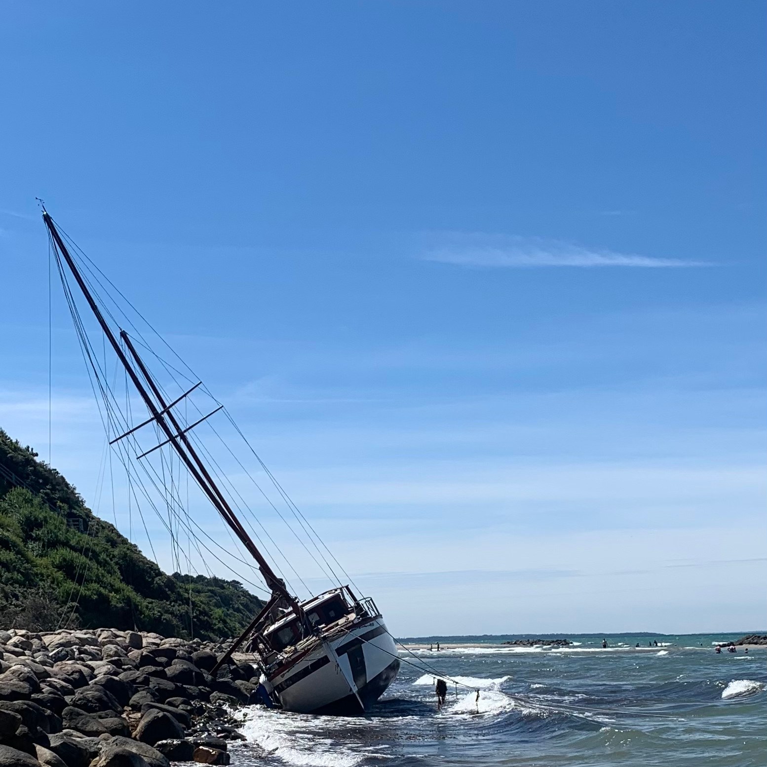 Vi är sena på beachen, men det finns plats denna soliga, om än lätt blåsiga dag. Vi går västerut, lägger oss i hyfsat lä och kan konstatera att ett tiotal meter från oss ligger ett segelfartyg som strandat. Vi får senare reda på att det är en båt som några inte så seglingsvana ungdomar precis köpt och efter att ha lämnat Hundested inte klarat av att bemästra seglen då motorn kärvade. Nu väntar en dyr bärgning och lagning av det sönderslagen skrovet. Trist.