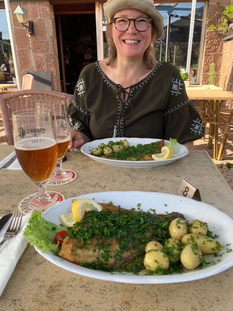 Vi nöjer oss efter ytterligare bad och tar den branta vägen uppför igen. Packar bilen och kör ut ur skogsdungen och på nya snirkliga vägar söder och senare nordost ut. Kommer så småningom till tillbaka till Liseleje, okynnesparkerar bilen, går ned mot den överbelamrade stranden, tillbaka igen och stannar slutligen på restaurangen Le Papillon för en stekt rödspätta med potatis, smörsås och rikligt med persilja, en Tuborg Classic till. Efterrätt den tungvrickande rätten rødgrød med fløde.