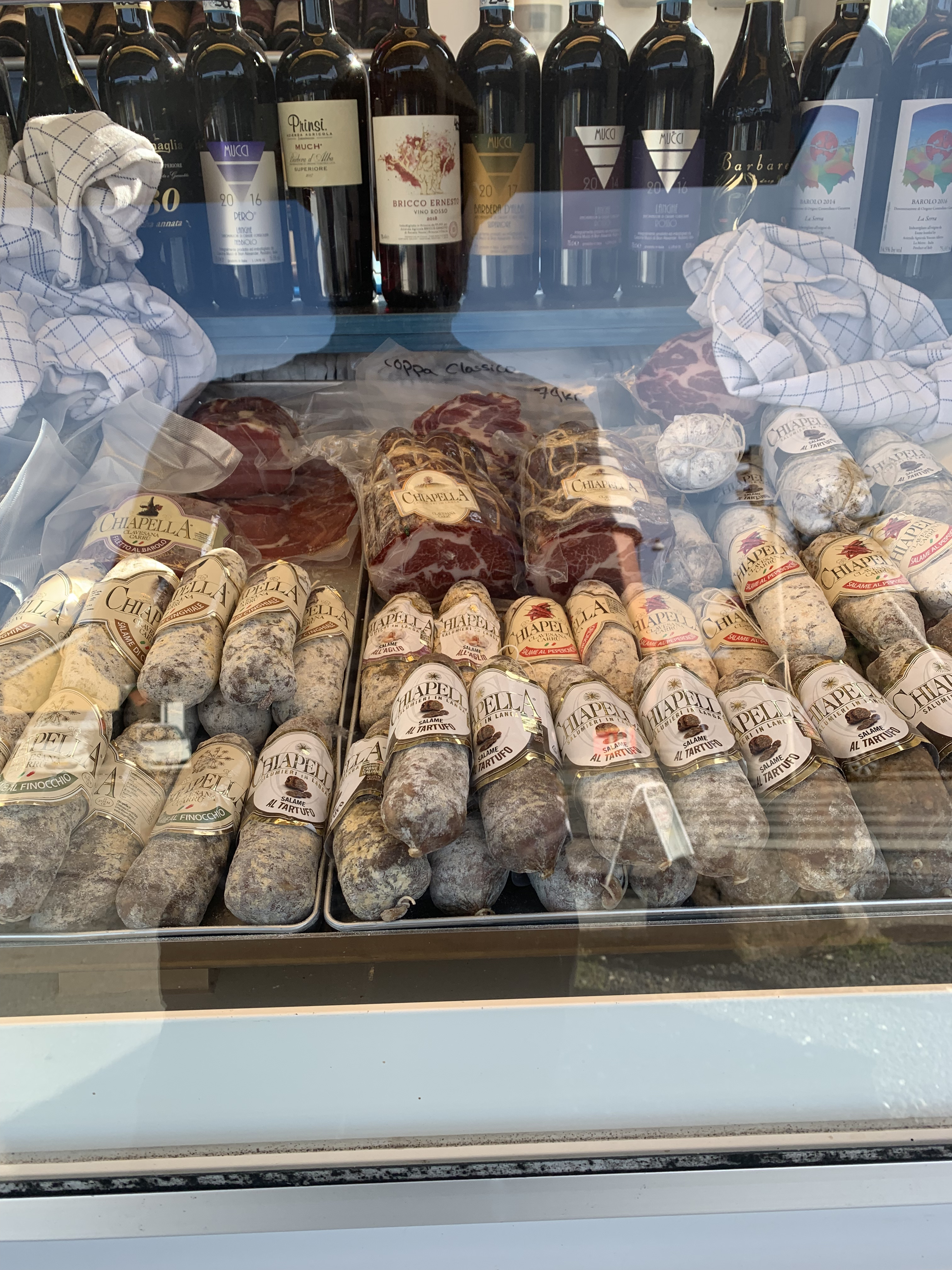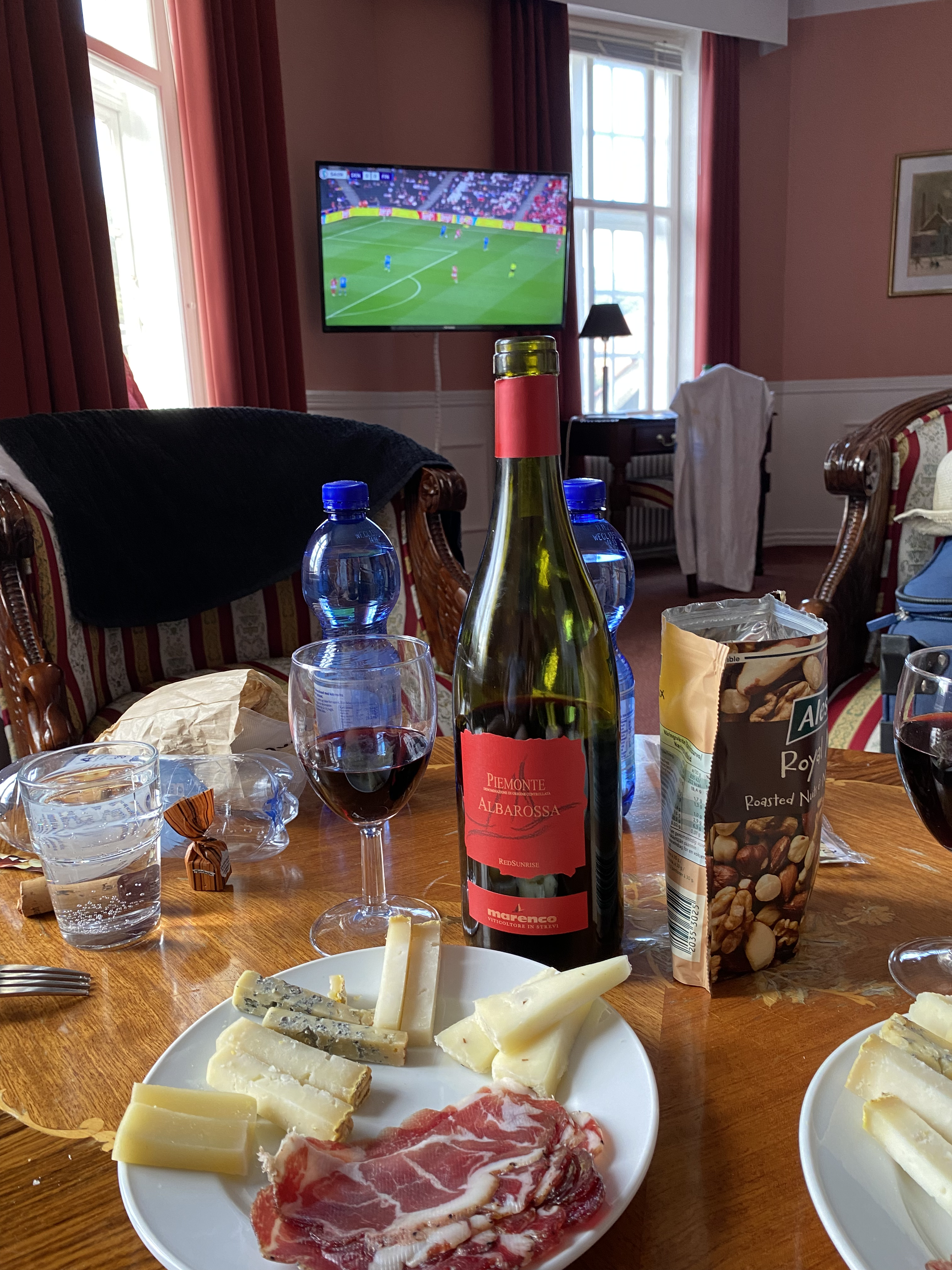Bilen står kvar. Olappad. Vi kör tillbaka mot hotellet. På vägen passerar vi, denna gången på rätt sida, kiosken med italienska delikatesser: viner, ost, charkuterier… Vi stannar. Provsmakar. Får ihop en försvarlig mängd ostar och salami samt en flaska Piemonte Albarossa (185 dkr). Dyrt, men förhoppningvis gott framför kvällsmatcherna i EM. Lite längre fram stannar vi vid Lidl för bubbelvatten och kex. Nu ska vi klara kvällen där vi missar delar av Danmark–Finland (1–0) och ser hela Frankrike–Spanien (2–0).