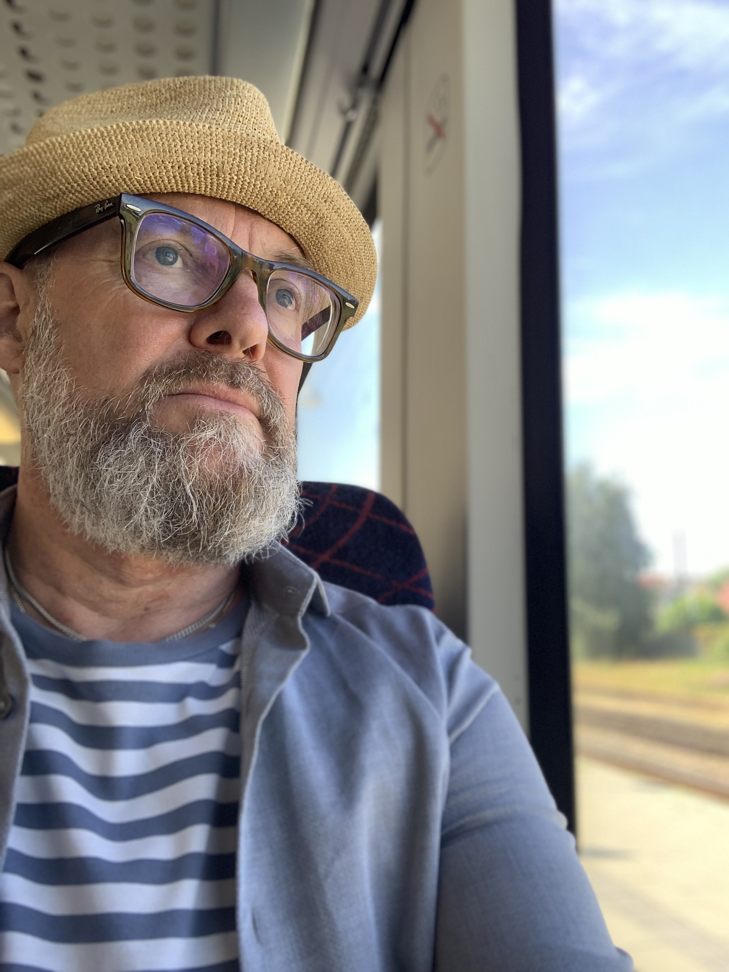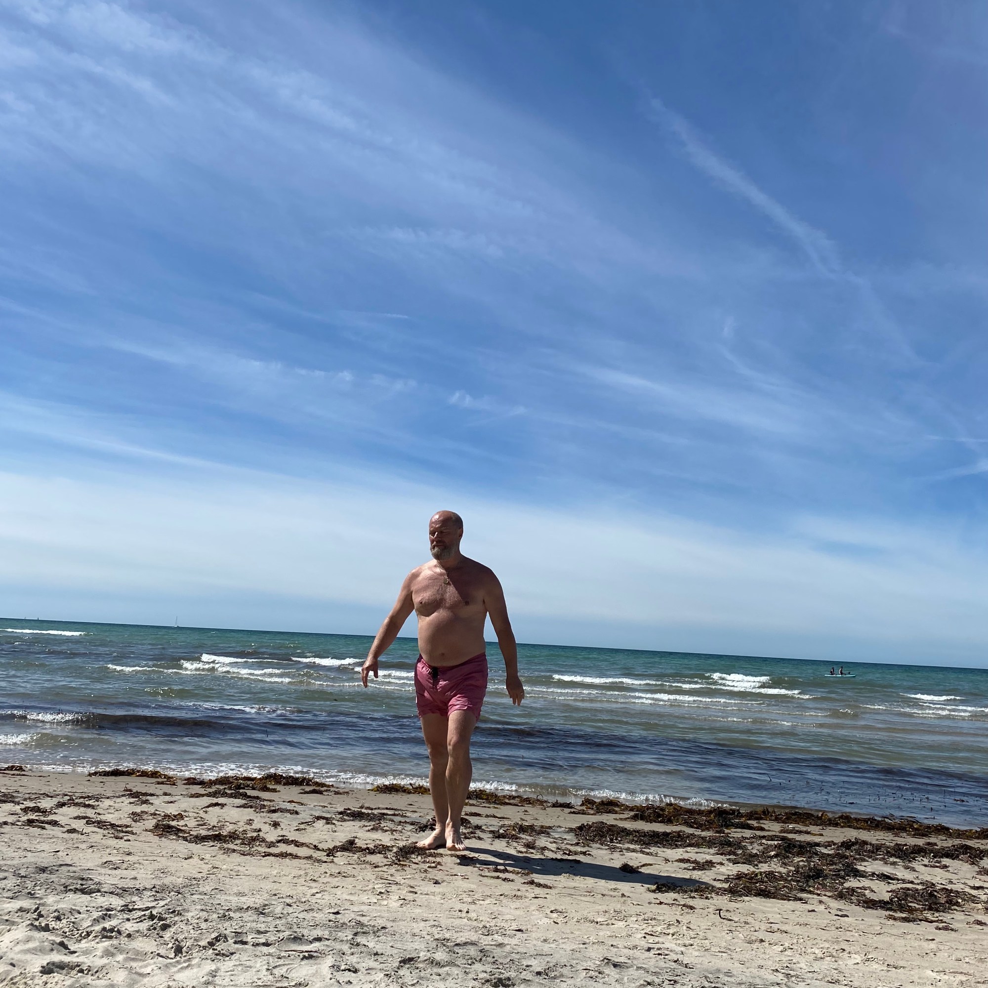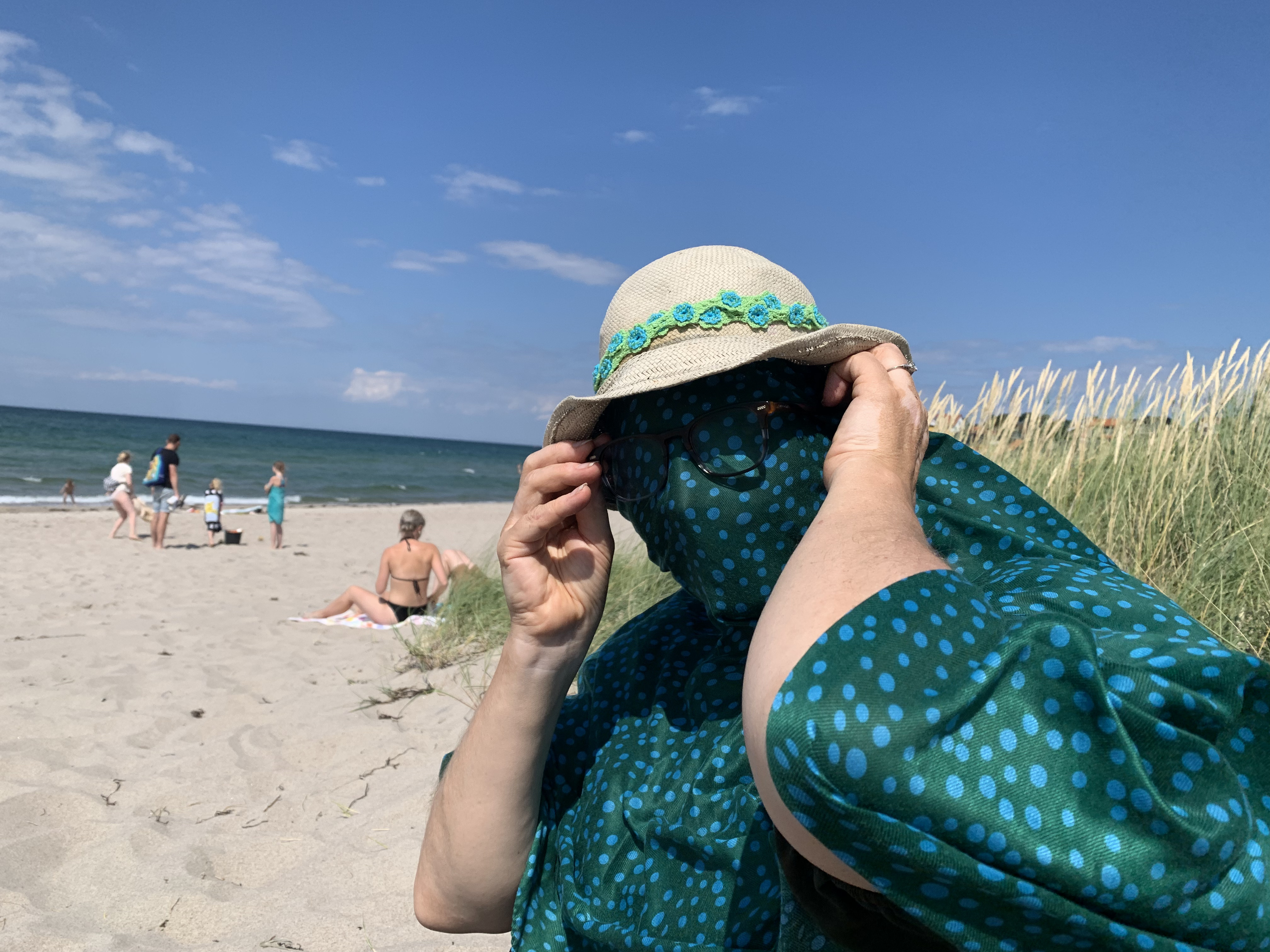 Vi positionerar oss. Z lyckas, med krångel, veckla ut parasollet i den svåra blåsten. Jag badar, vi äter den medhavda maten och drycken. Sanden far in, knastrar gott mellan tänderna när vi tuggar. Men det går. Z badar. Vi skiftar ställe, men då vi kommer dit med fler av våra saker har två unga, sköna tyskor tagit plats någon meter från oss. Vi, blekfeta. De perfekt gyllenbruna med vältränade kroppar. Jag kikar hänfört, men diskret och väljer att fortsätta läsa Kire Nilssons ”Naturens drottning” innan jag åter badar. Väl tillbaka har nymferna valt att bryta upp; jag kan andas ut.