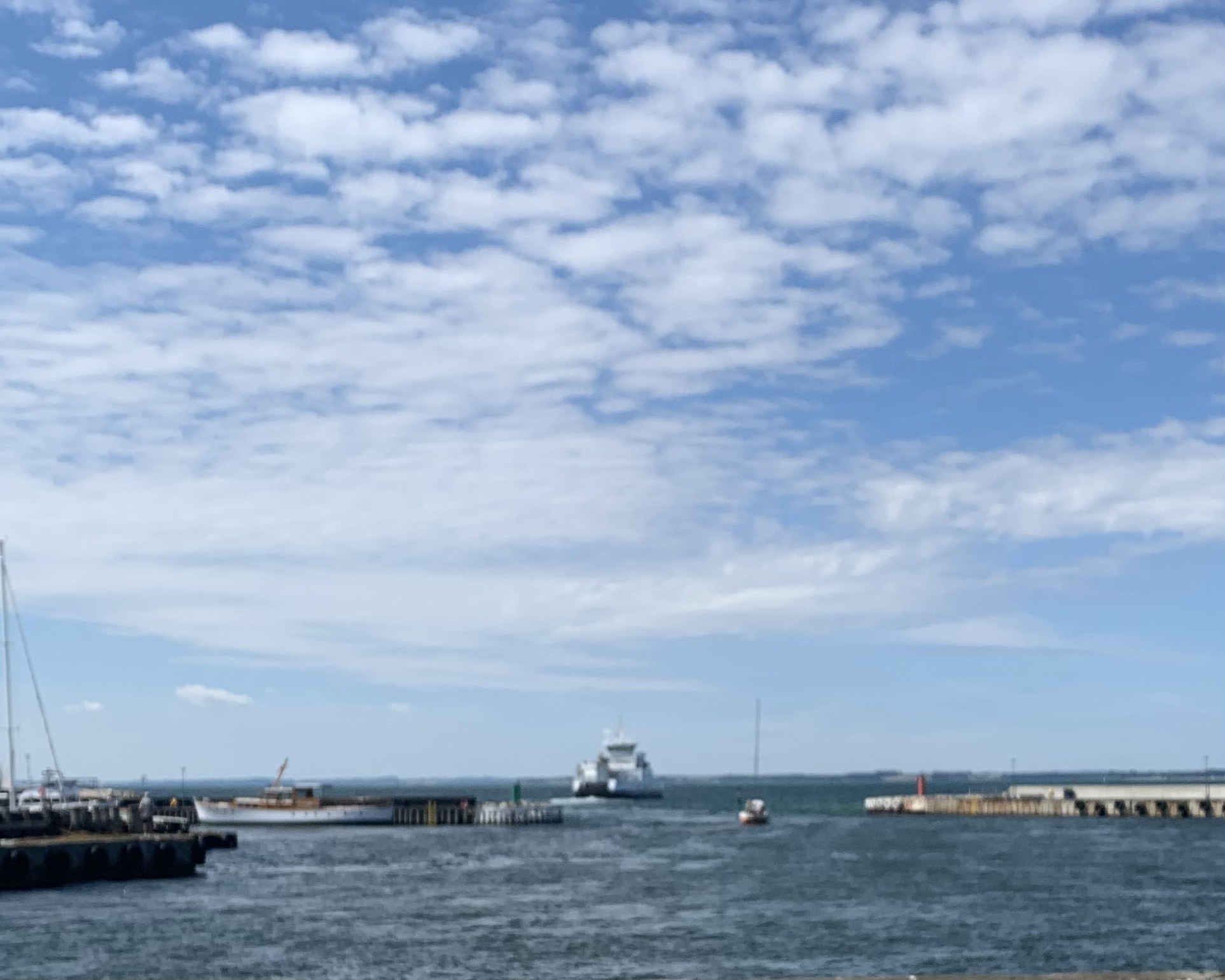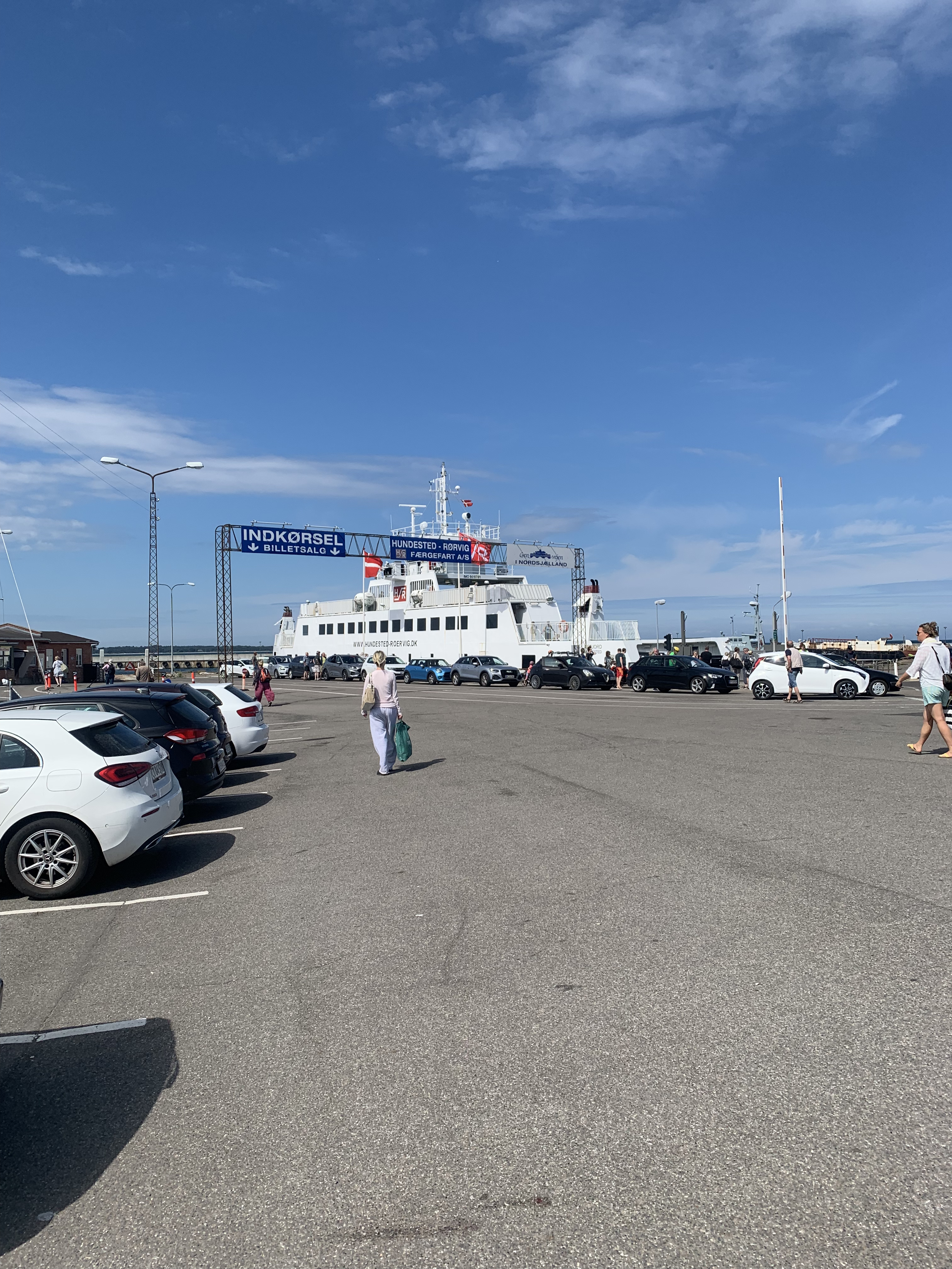 Det är en fin resa med stopp om kanske 20 minuter, en halv timme och det stannar i Hundesteds hamn, där färjan pilar mellan hamnstaden och Rørvig (en resa vi tidigare har gjort). Vinden är ihållande och vi stirrar mot stranden – å ena sidan – och hamnområdet – å andra sidan.