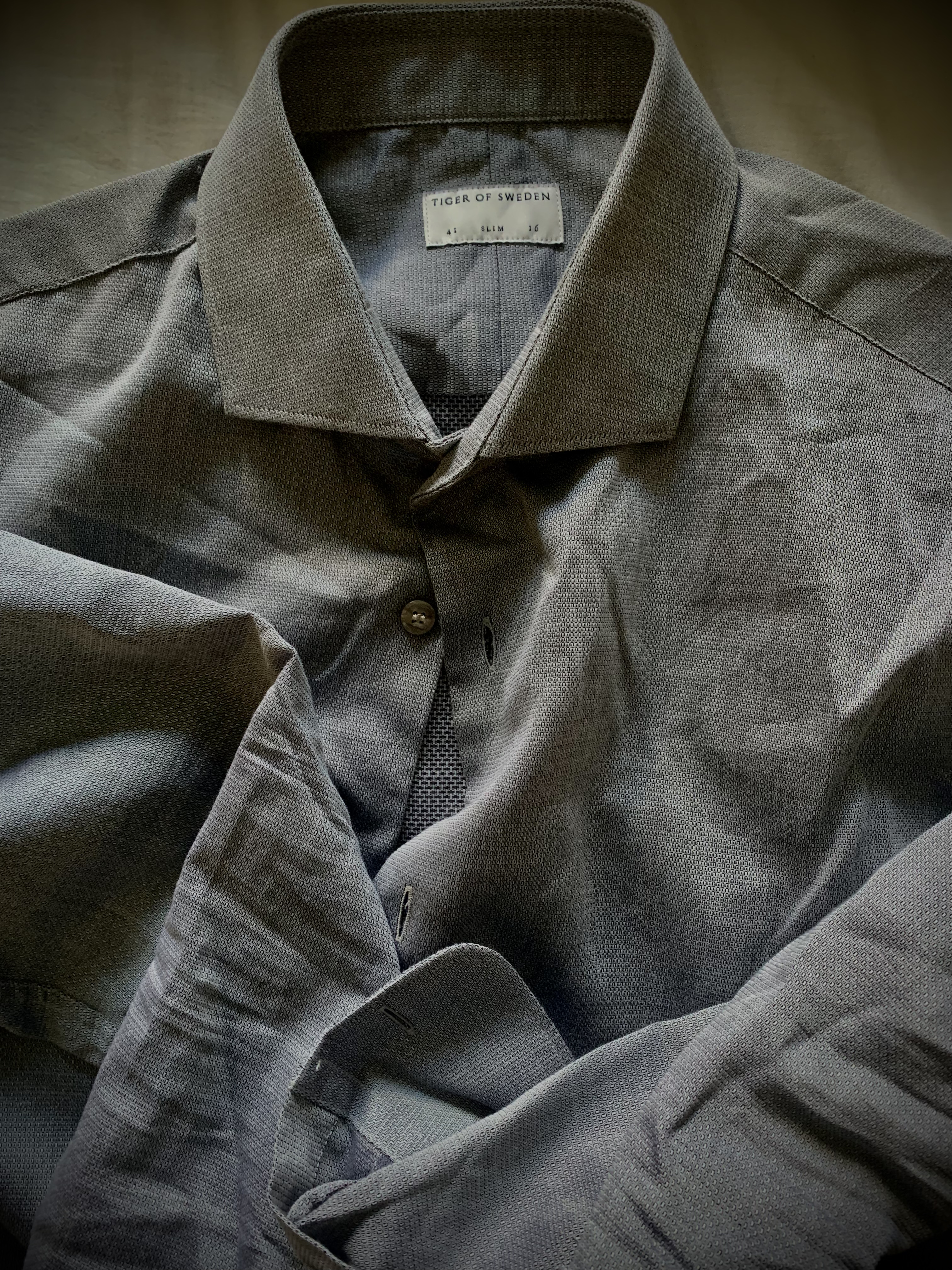 Solen lyser stark och klar på en blå himmel. Vi ska ta tåget från Frederiksværk till Hundested. Våra bleka skinn är aningen brända, så vi går till intilliggande Kirkens genbruk. där jag redan tidigare spanat in en Tiger of Sweden-skjorta. För 30 dkr fungerar den väl som solskydd för brända axlar, dess gråa ton matchar dessutom min Samsøe Samsøe-tischan jag köpte i våras. Jo, skjortan är slim och blir därmed för tajt för att knäppa, men bärs stilfullt öppen, fladdrande i den ihållande vinden. Z hittar en sjal för sina axlar. Vi är redo för stationen och kommer som av en slump i perfekt för det annalkande tåget.