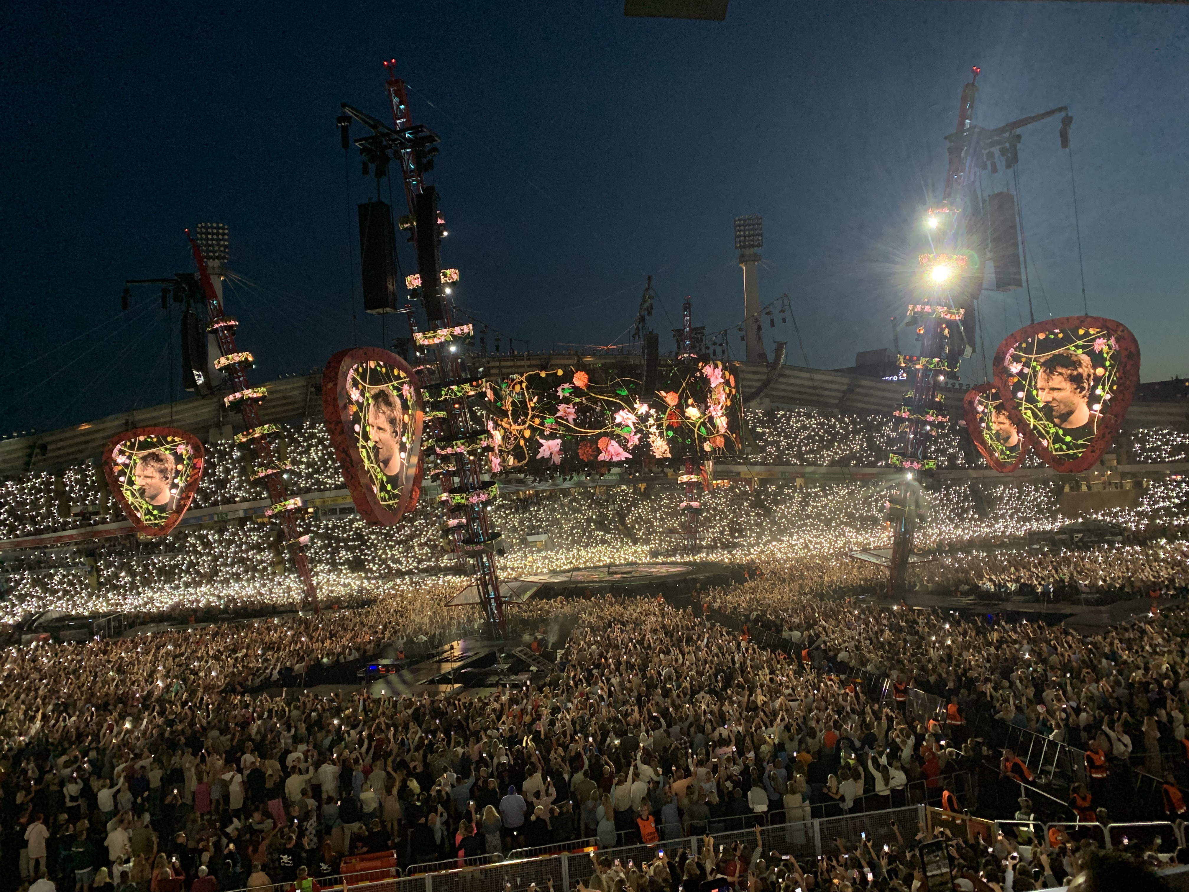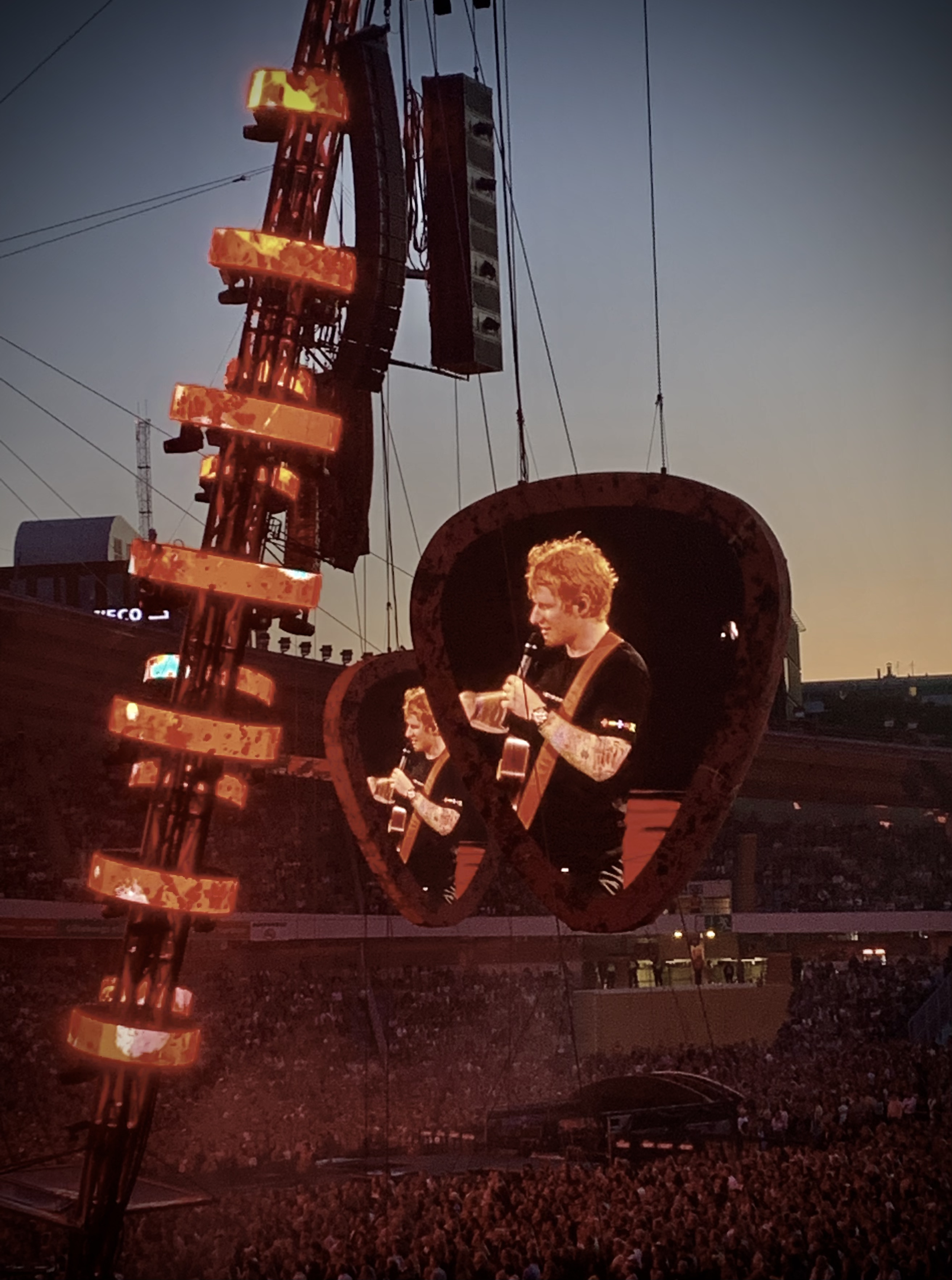- Scenbygget. Med scenen centralt placerad bjuder Ed Sheeran in publiken från alla håll. Med masterna, som bland annat håller de väldiga plektrumen som också är videoskärmar, får man visualiseringar som både visar artisten på scen, men som också smyckar extra lullull och videosnuttar. Scen snurrar emellanåt som en vinylskiva (utan pickup) med tre (om jag räknade rätt) looppedalstationer förutom den som står centralt placerad på det höj- och sänkbara podiet. Hastigt räknat vet jag bara några få artister som använt centralt placerade scener i arenasammanhang: Whitney Houston (vid publikrekordet på 14606 i Scandinavium 29 maj 1988, Justin Timberlake 25 juni 2007 i samma arena, Prince, som jag såg i Johanneshov under ”Lovesexy”-turnén 1988) och U2 360-gradersturnén, som landade i Ullevigrytan sommaren 2005.