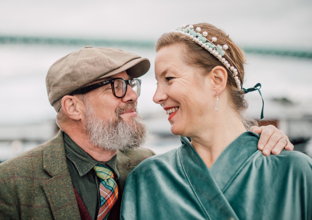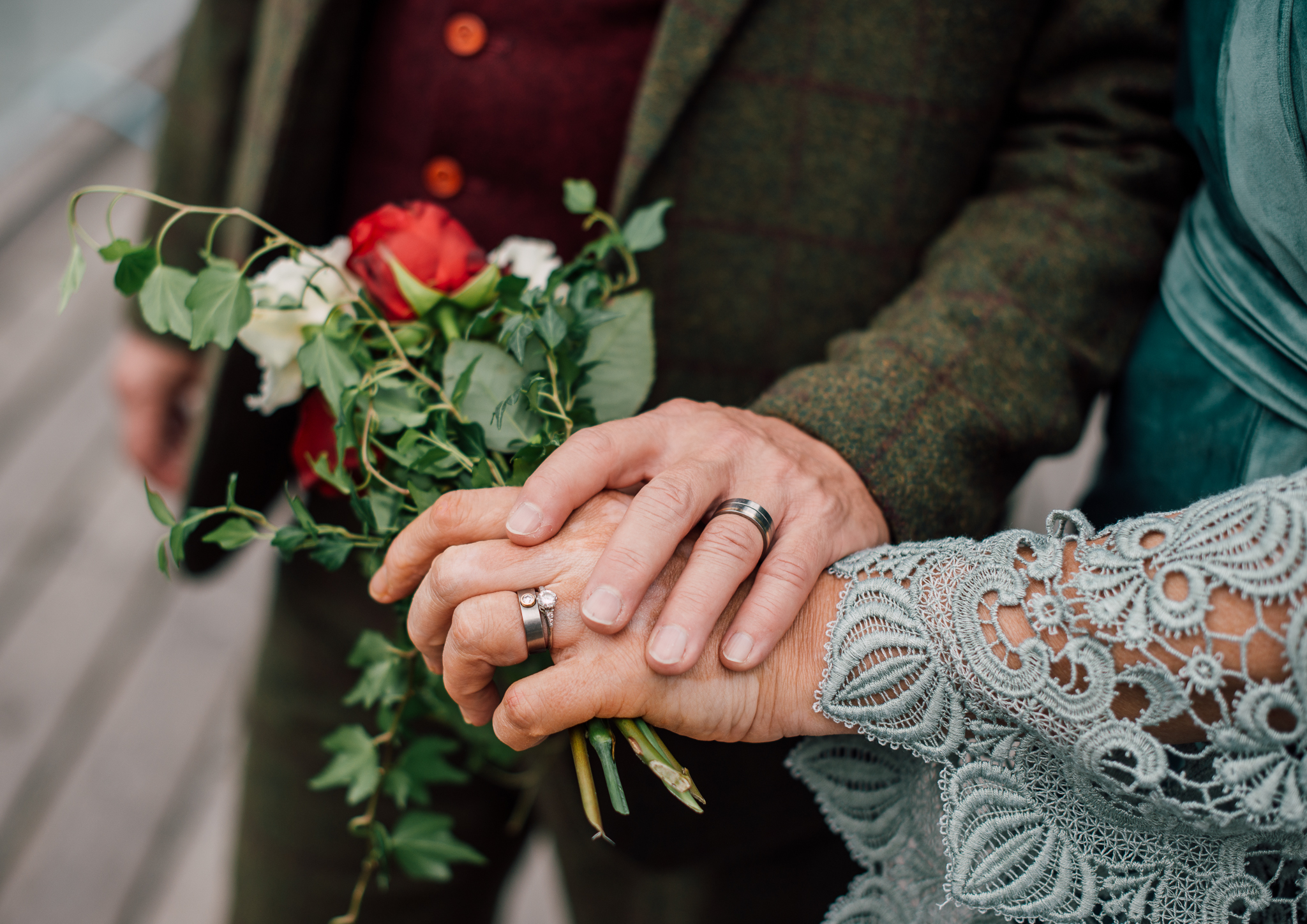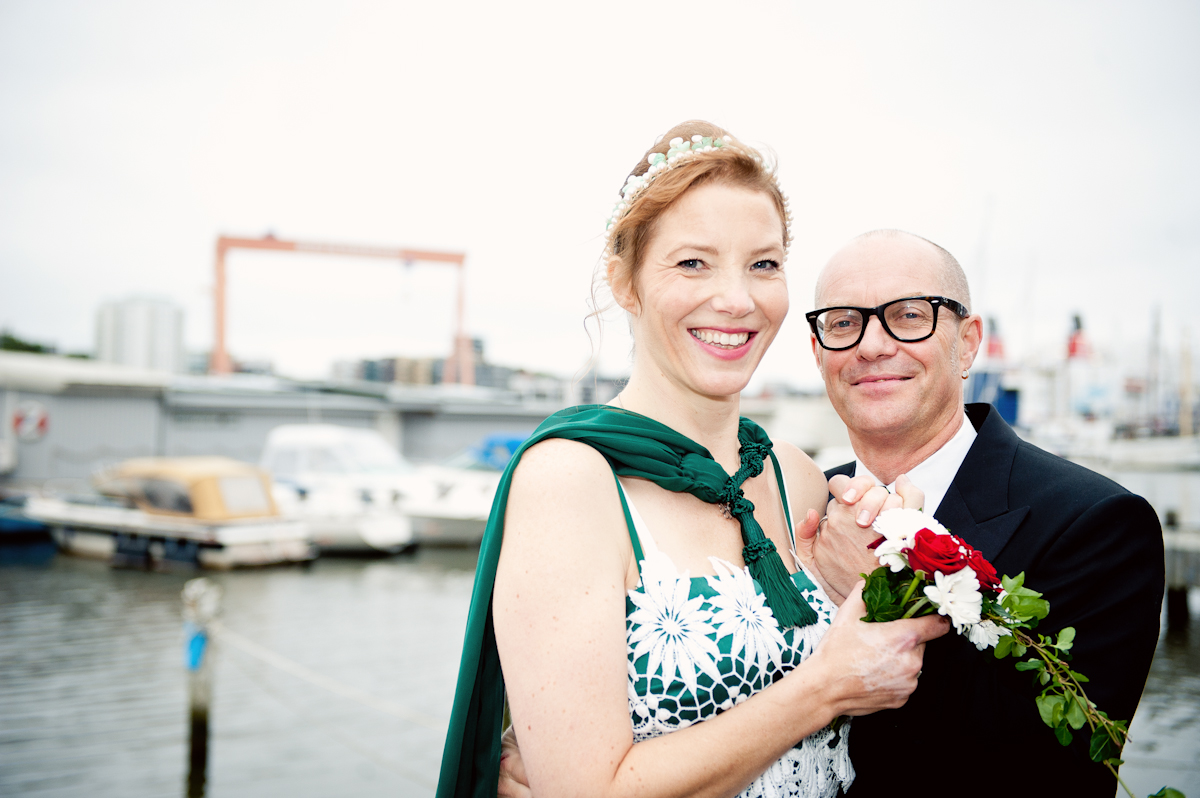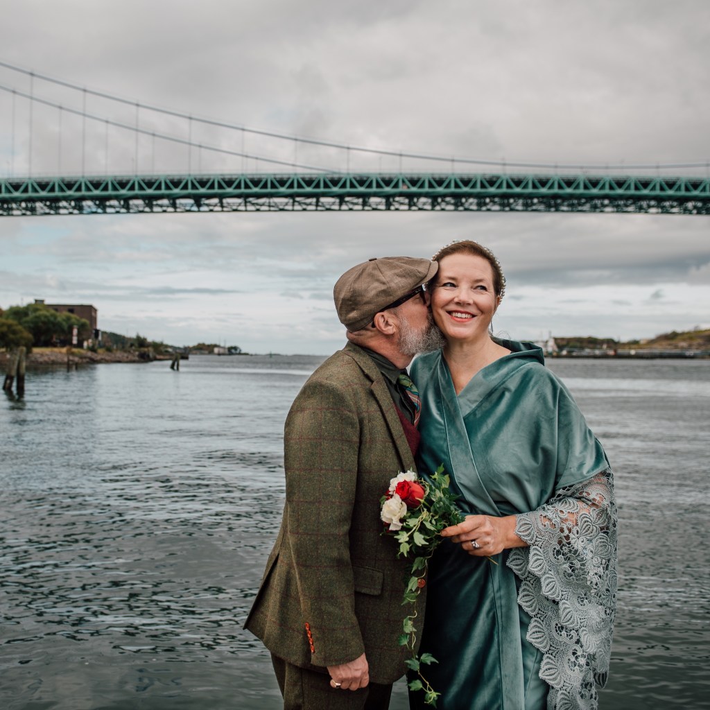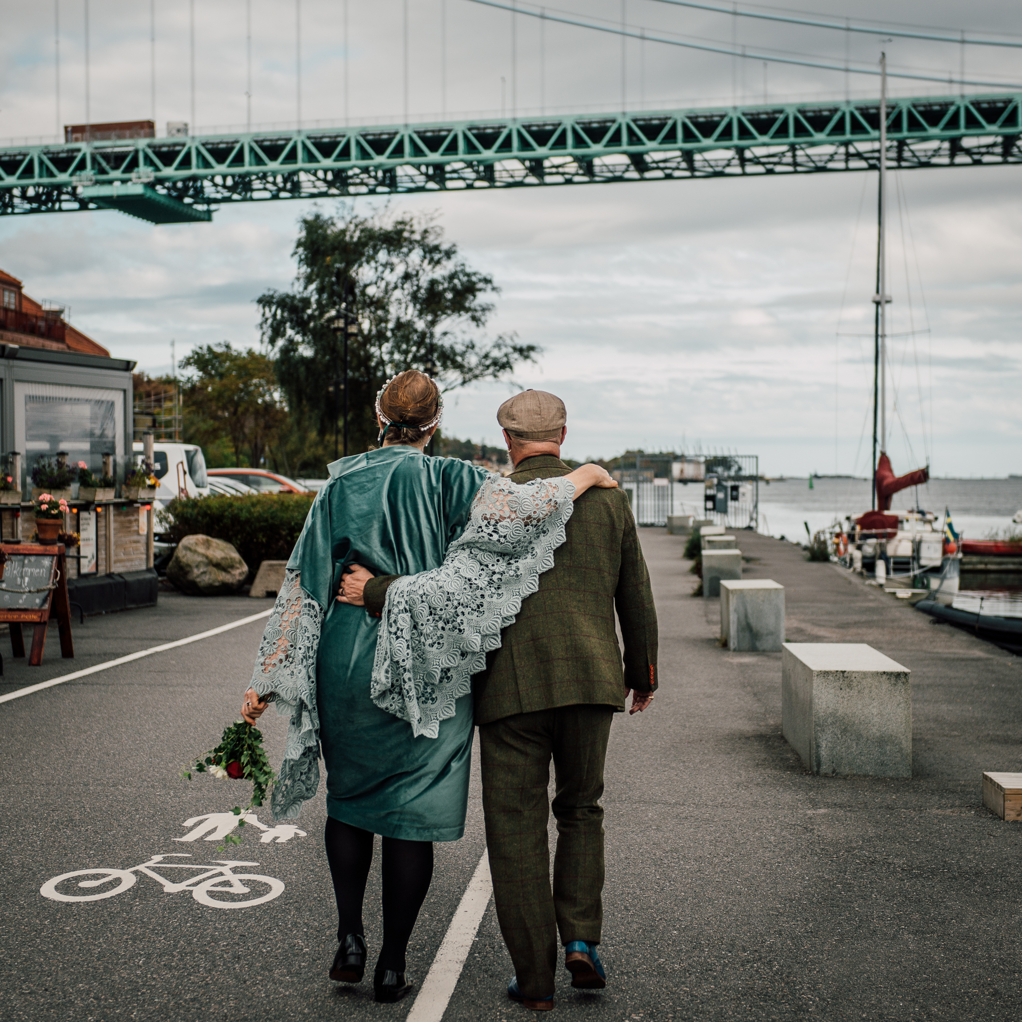 Z och jag har alltid varit noga i vår relation, att hylla kärleken, se varandra, fira om så det lilla och göra en grå vardag till fest. Nu firar vi tio år som gifta. Hade någon idé att resa bort, men det stannade vi att fira med våra barn med respektive och barn med middag på kvällen. Kanske skulle vi vakna vid hotellet vid älven…? Nej, vi nöjde oss med frukost där och efter att den inmundigast hade vi stämt möte med fotografen från då, Jonas Eklöf, som nu skulle ta bilder på oss som en reflektion av de tio år som då. Vädret var som av en slump ungefär detsamma; den blå himlen vek undan för gråa moln, som gav en dramatisk kuliss och goda förutsättningar för fotograferingar på kajen.