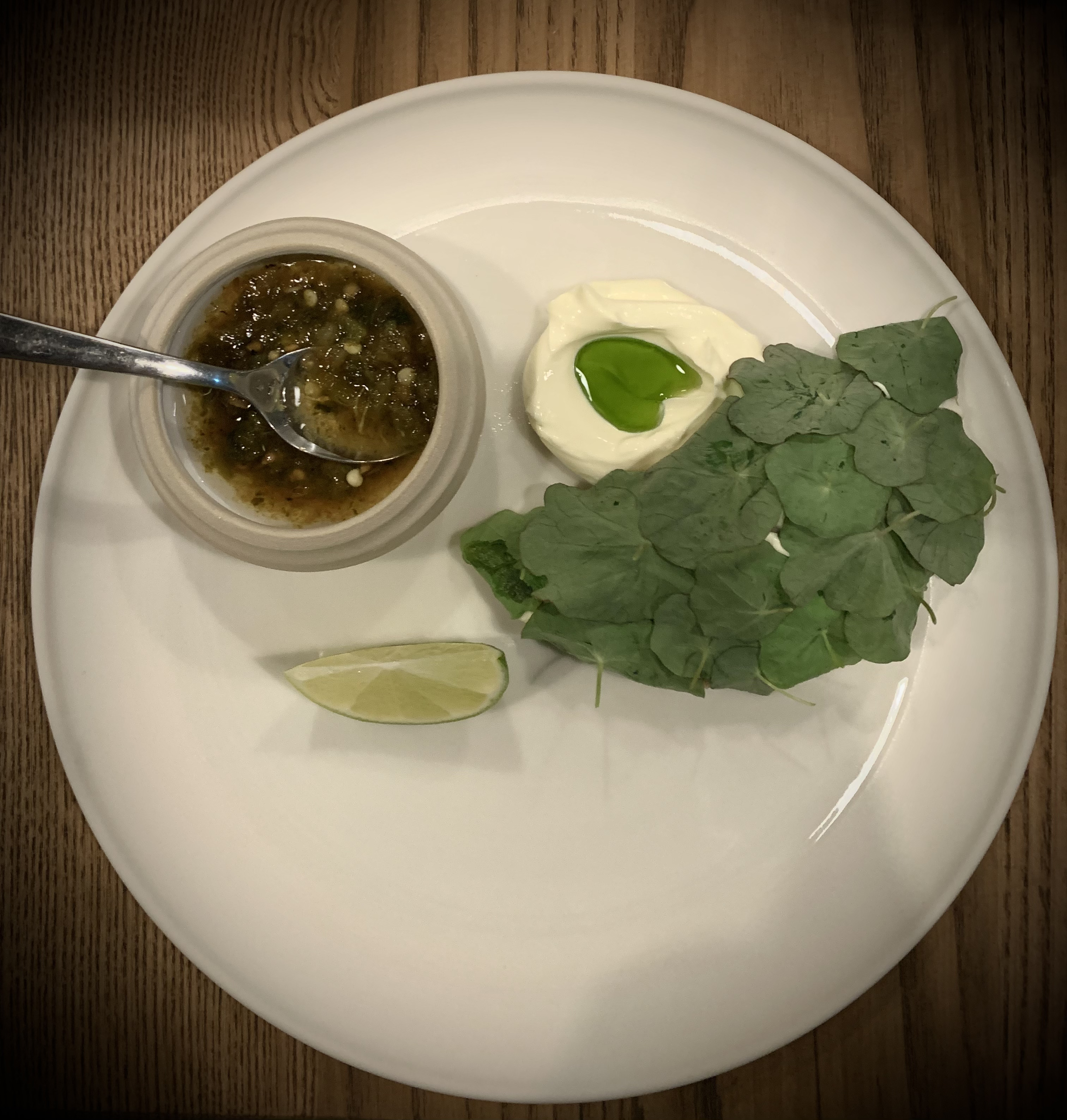 Inledningsvis kommer en majsskum, en lättare slags gröt toppas med ost och chili. Till det en Paloma-cocktail, som serveras (likt de andra drinkarna) med en rejäl isbit som mot slutet prickar näsan. Smakerna harmonierar och entrérätten är överraskande mild, men smakrik. Rätt två är en Quesadilla med ost, svampen ”huitlacoche”och tagetas tillsammans med en salsa och en bit lime. Fräscht och fortfarande med en försiktig smak, trots salsan som inte hettar så mycket. Men allt gifter sig i gommen på samma sätt som det gör för blotta ögat. Margaritan biter ifrån och sältan från saltkransen runt glaset är frisk.