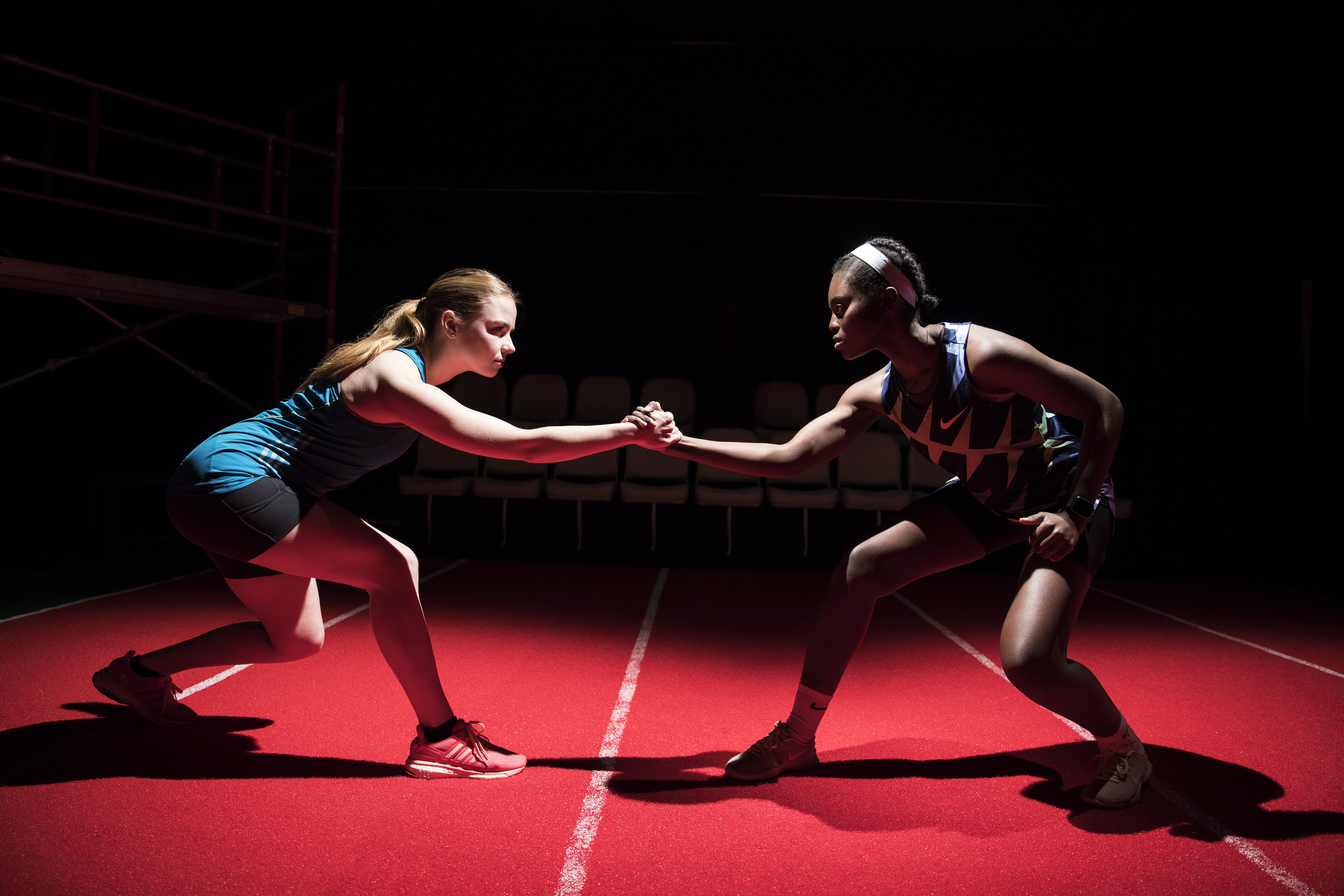 Duell och vänskap med utmaningar. Lotti Brogan och Susan Akintomide spelar elitlöparna som utmanar varandra, men som också bygger upp en vänskap som sätts på prov i ”Fair play” på Gothenburg English Studio Theatre. Foto: LINA IKSE