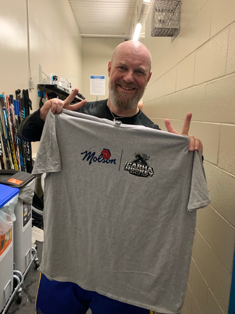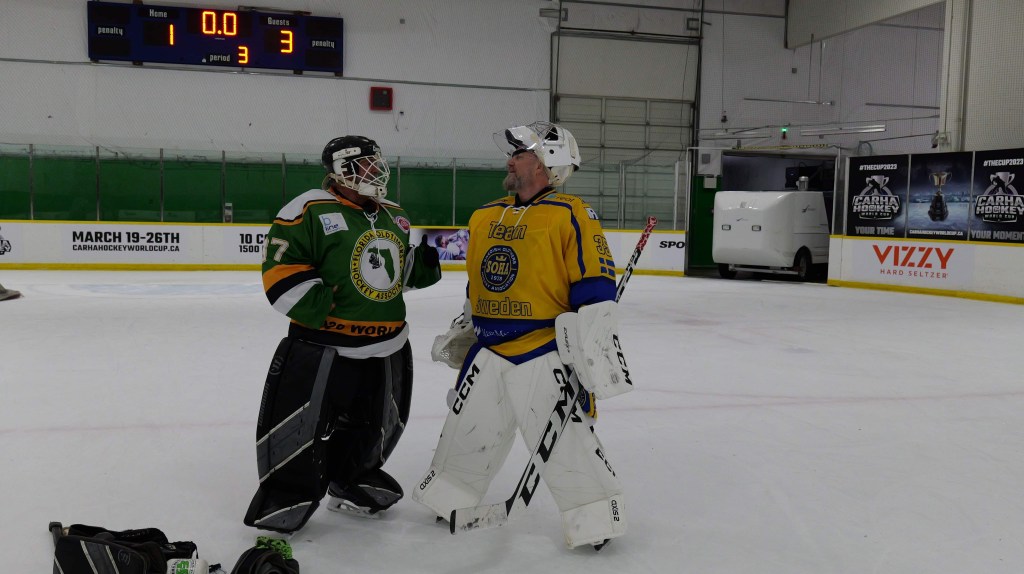 Jag engagerar min målvaktskollegas son W, som är med på resan för att i förstone dokumentera sin fars fantastiska resa över Atlanten och vidare västerut för att som snart 75-åring spela ishockey. Men han ställer upp då jag ber honom slå några hastigt slagna rutor på motståndarmålvakten, som jag senare lär känna en smula och delar kontaktuppgifter med, Charlie Holland och yours truly.