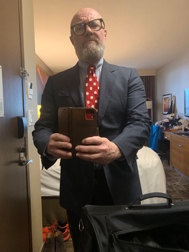 Vi är ett knappt stenkast från hotellet, går tillbaka dit för lite vila innan det är dags att svida om till banketten. Jag har med en Armanikostym, som tillsammans med downbottom Ljung-skjorta (ljusblå) och en röd silkesslips med vita prickar, som får utgöra min secondhandstass för kvällen. På fötterna ett par Paul Smithskor, även de secondhand. Jag är stukad, men redo för festkvällen.
