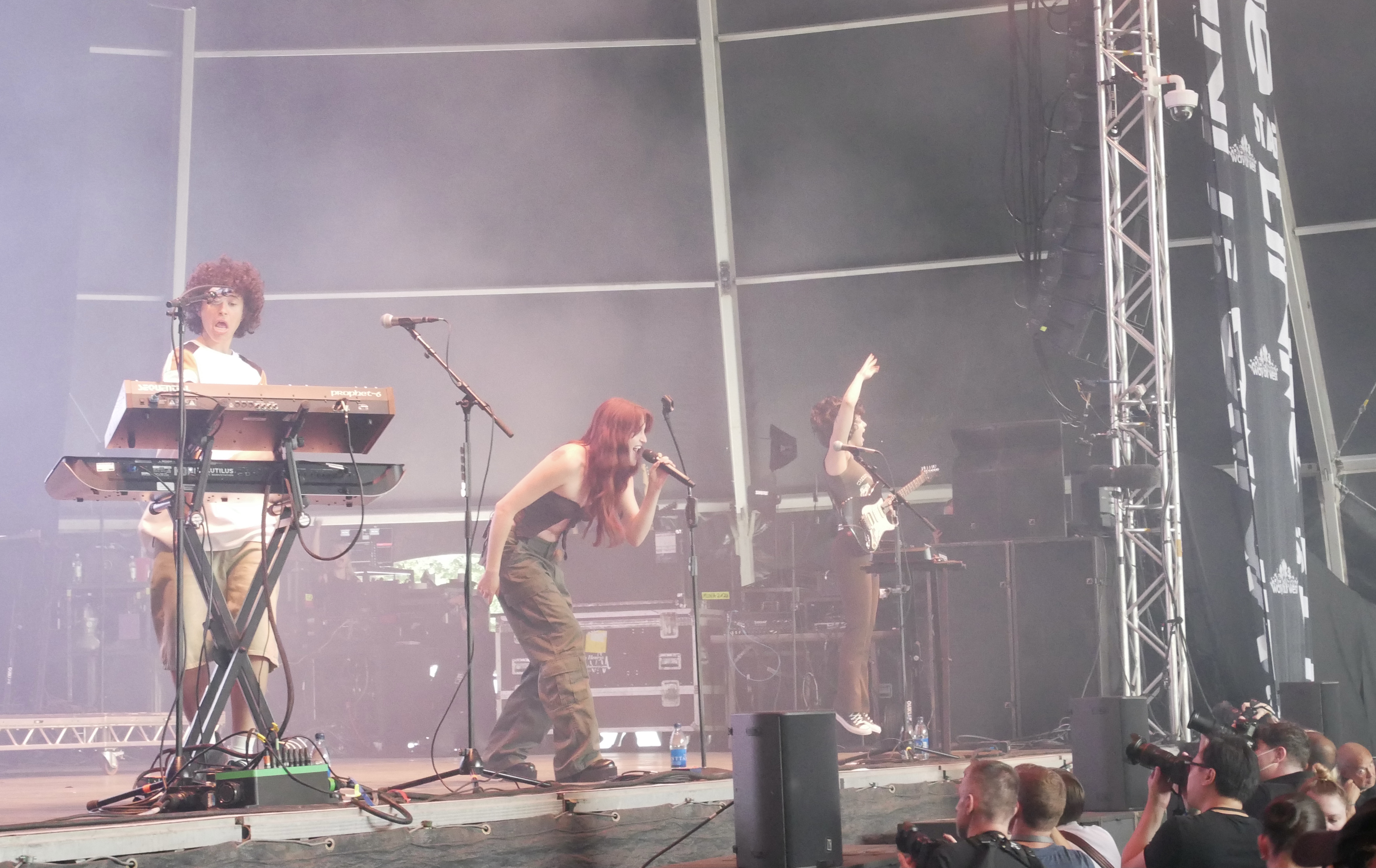 Katie Gavin, sång, Josette Maskin, gitarr, och Naomi McPherson, keyboard/gitarr, är den dynamiska trion som i sak utgör LA-bandet Muna. Med övriga bandmedlemmar – bas och trummor – försitter de inte chansen att ta scenen i besiktning. Det är intensivt från start med stark utstrålning. Hade jag inte sett glädjen i den här trion kvinnors ansikten hade jag klassat det som något slags emopop. Nu blir det mindre genrebestämt, men i längden också aningen tradigt.
