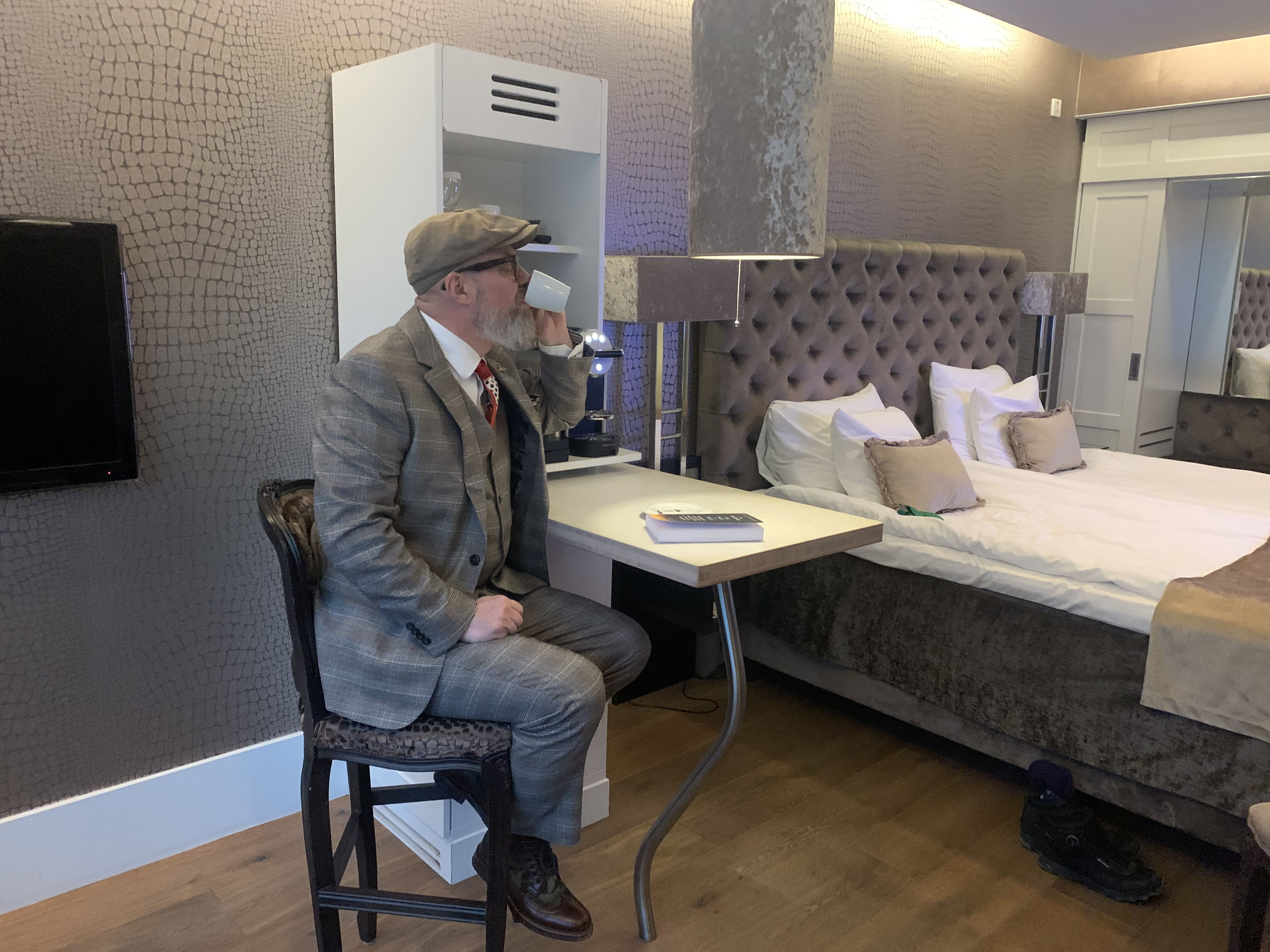 Vi har kommit ner en smula försent för min smak. Men en missuppfattning ställde oss inför detta faktum. Så jag dressar om, min nyköpta tredelade kostym (det gick väl sådär med köpstoppet, men kanske stannar jag vid detta plagg 2024… jag vill ju ändå vara pragmatisk) kommer till pass. Till det Paul Smith-skjortan som jag köpte på Extraloppan i Reykjavik i somras och en sidenslips från något av alla andra secondhandköp som jag har gjort. Jag känner mig klädd. Jag känner mig stilig. Med tålamod tar jag på mig de bruna kängor i läder och camouflagesmärting som jag köpte på Erikshjälpen i november. Skohornet från garderoben klarar inte belastningen och viker sig därför. Det enda negativa med rummet. Jag får snöra upp ordentligt. Inga genvägar här inte.