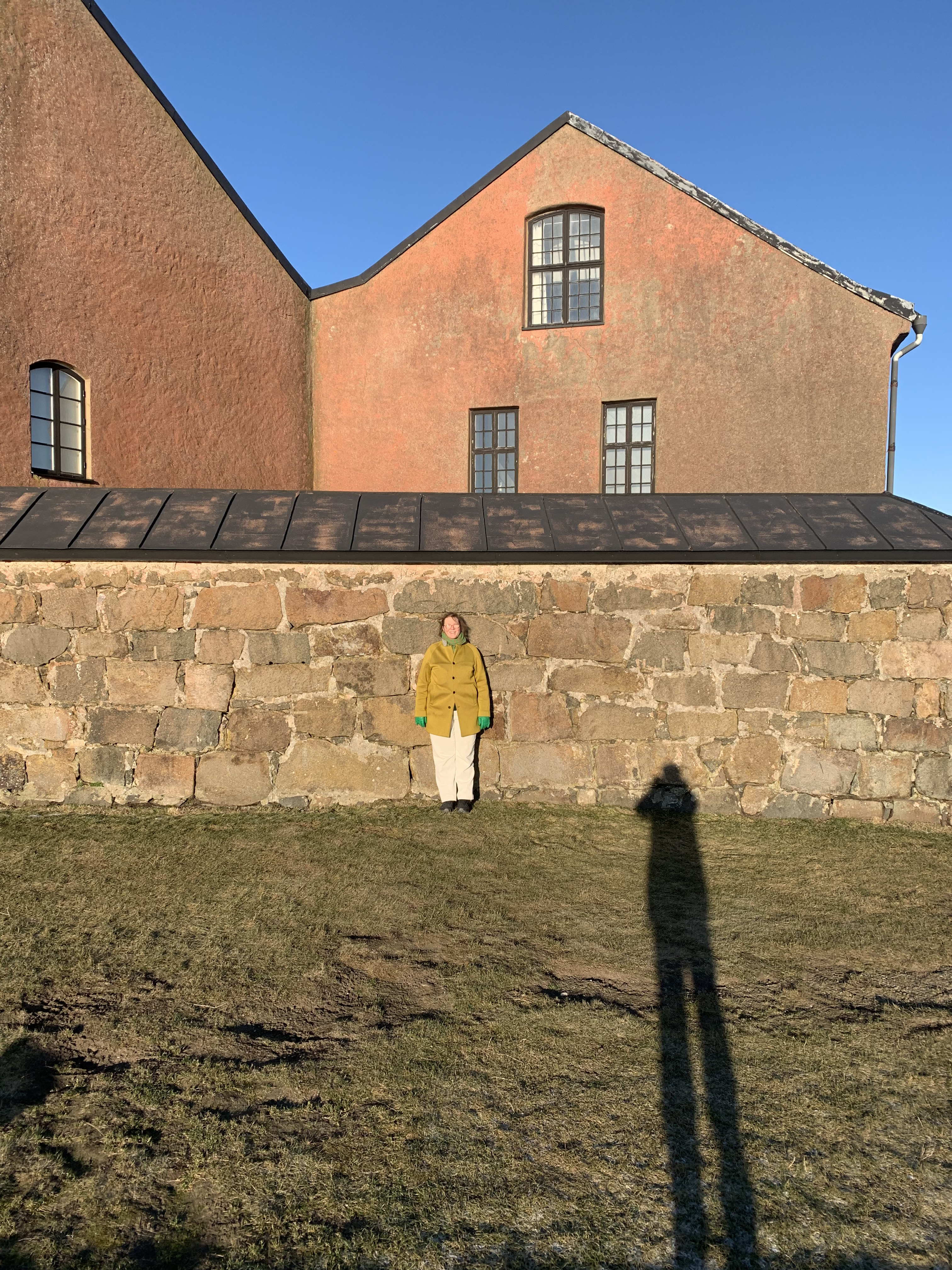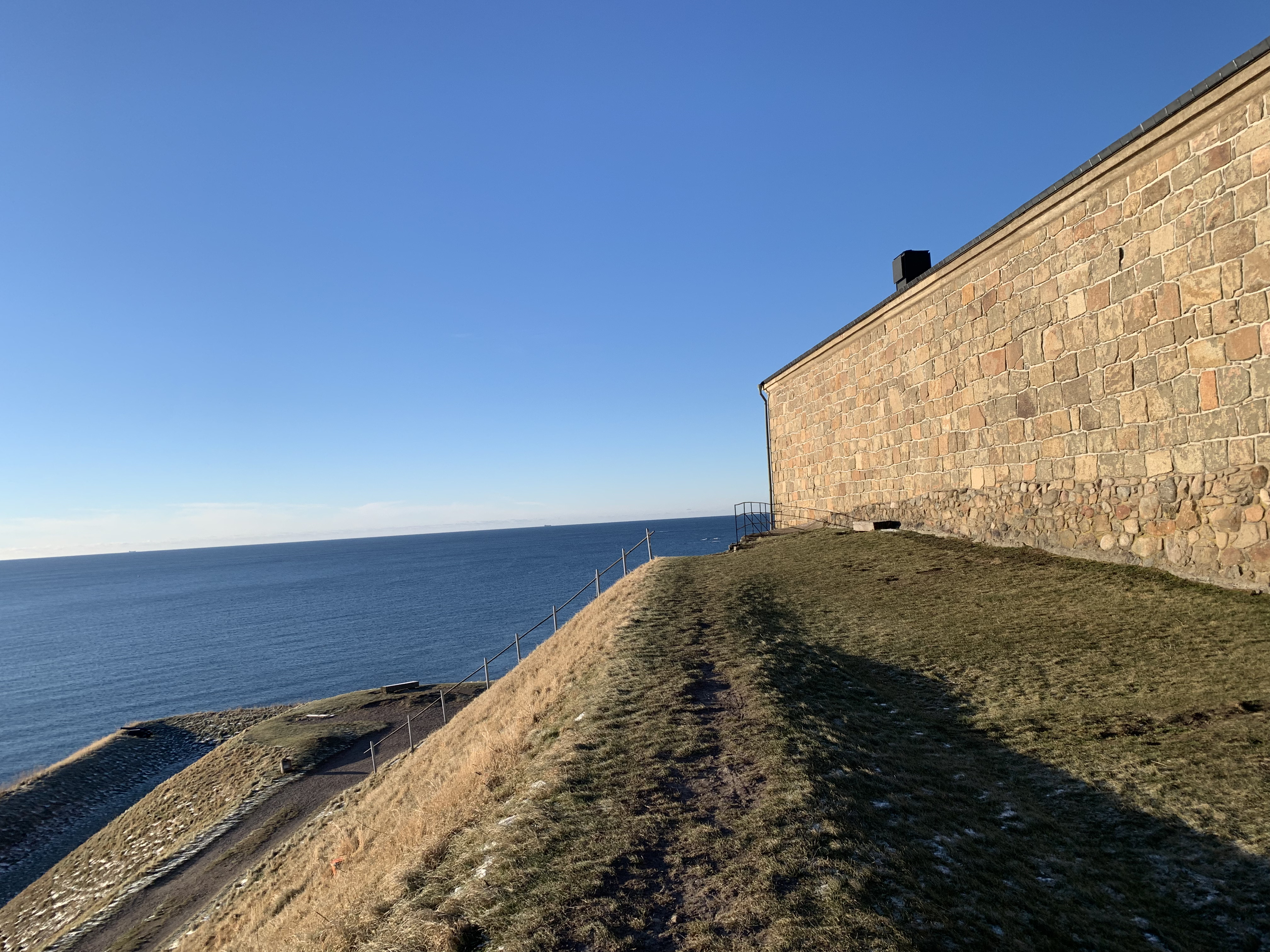 Vi styr mot Varbergs fästning, det väldiga fortet med anor från 1200-talet, som reser sig på sin kulle. I Vallgraven är vattnet fruset. Familjer prövar isen, några åker skridskor. Vi går ut mot fortifikationen, den jag aldrig – skam till sägandes – har besökt. Vi går in i portar, in på borggården, upp på vallarna med sina kanoner och sin hänförande utsikt. Varberg är vackert även på vintern och västerhavet ligger stilla som en flört. Men det är bitande kallt.
