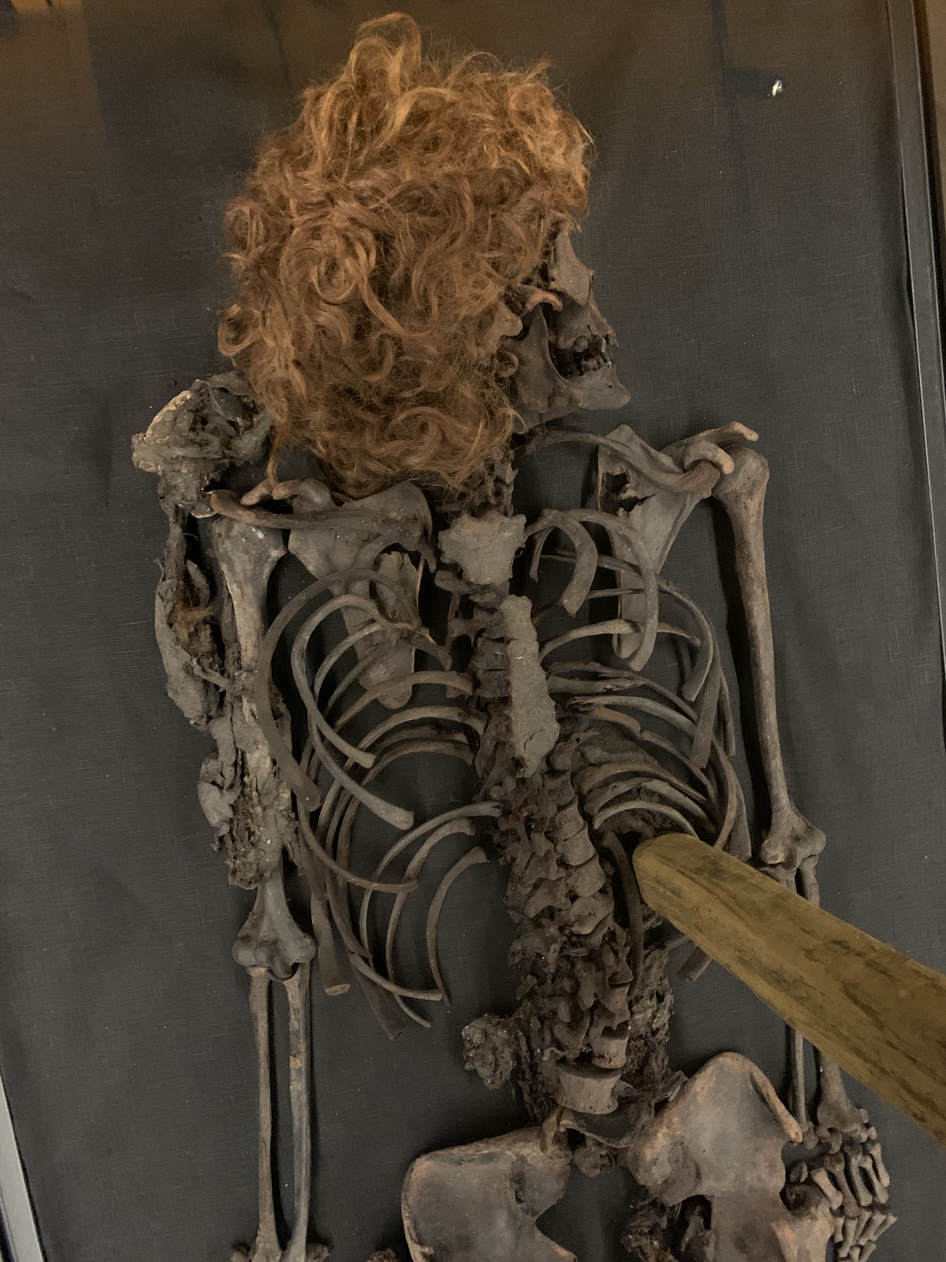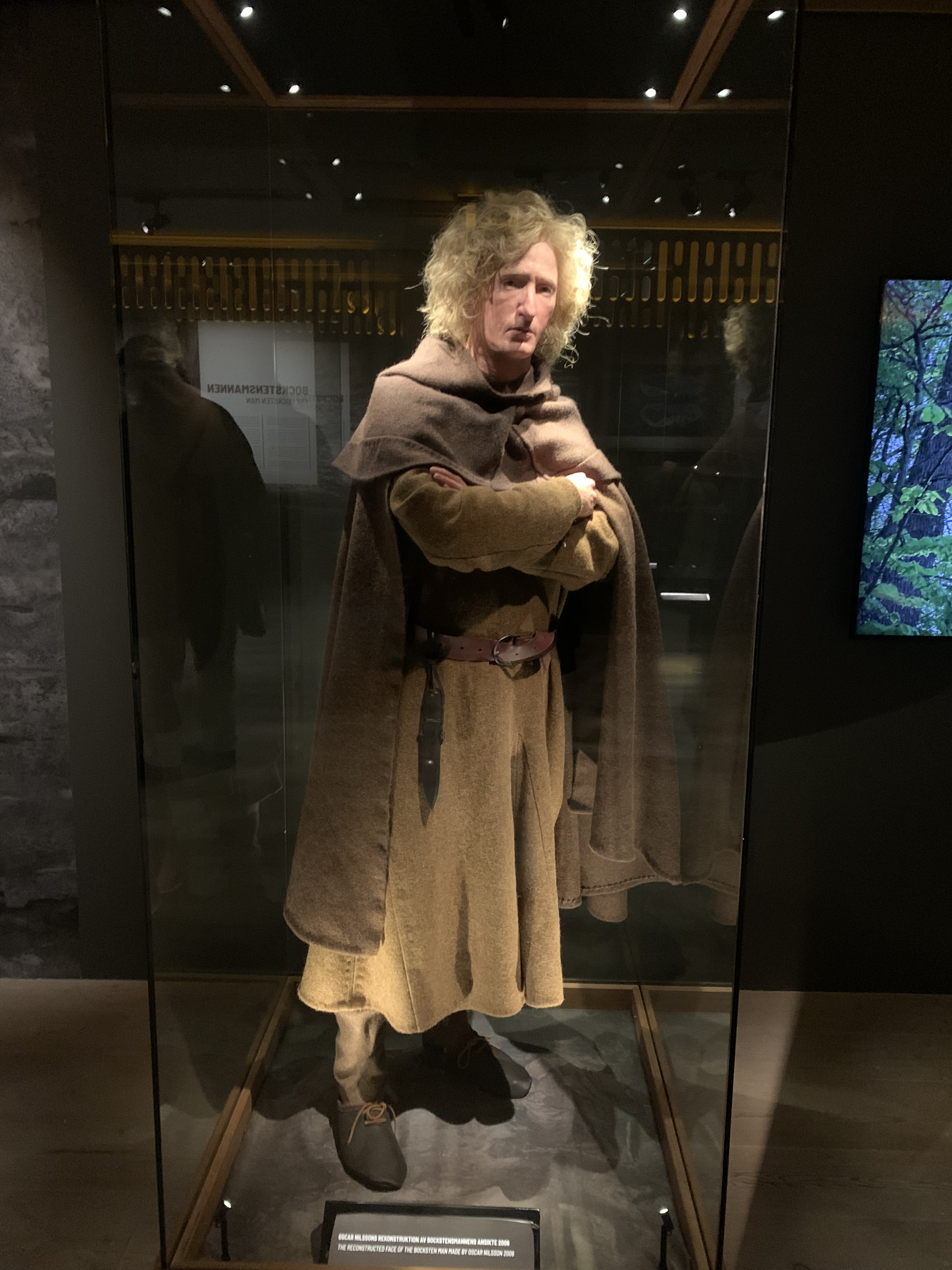 Vi går in i museet för att hälsa på Bockstensmannen. Den vackra, unga museireceptionisten tar emot min betalning – en vuxen och en pensionär. Jag hör mig säga att jag nästan är lika gammal som Bockstensmannen. Hon skrattar åt mitt skämt och jag inser att jag är som min pappa. Han hade kunnat ha sagt precis samma sak.