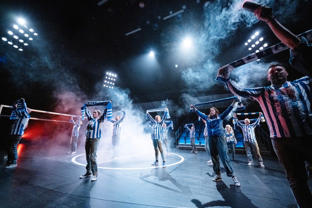Scenen är listigt byggd med arenaläktare i fonden, där en del av publiken sitter. Det är alltså upplagt för hejaramsor och mycket riktigt kommer ett ”Andra sidan är ni klara?” från salongen med ett blygt ”Jajamänsan fattas bara” från scenen innan pjäsen tar sin början.