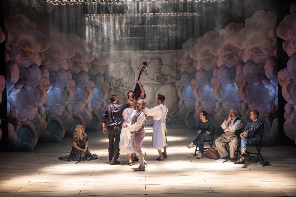 I skuggorna smyger Mozart (Andrea Edwards) som en spefull och gäckande figur, som fyller regissörens fantasi. Han som är totalt gränslös och otyglad i sin ambition i kontrast mot den konservativa ensemblen och ledningen med sin ekonomiskt strama tyglar.