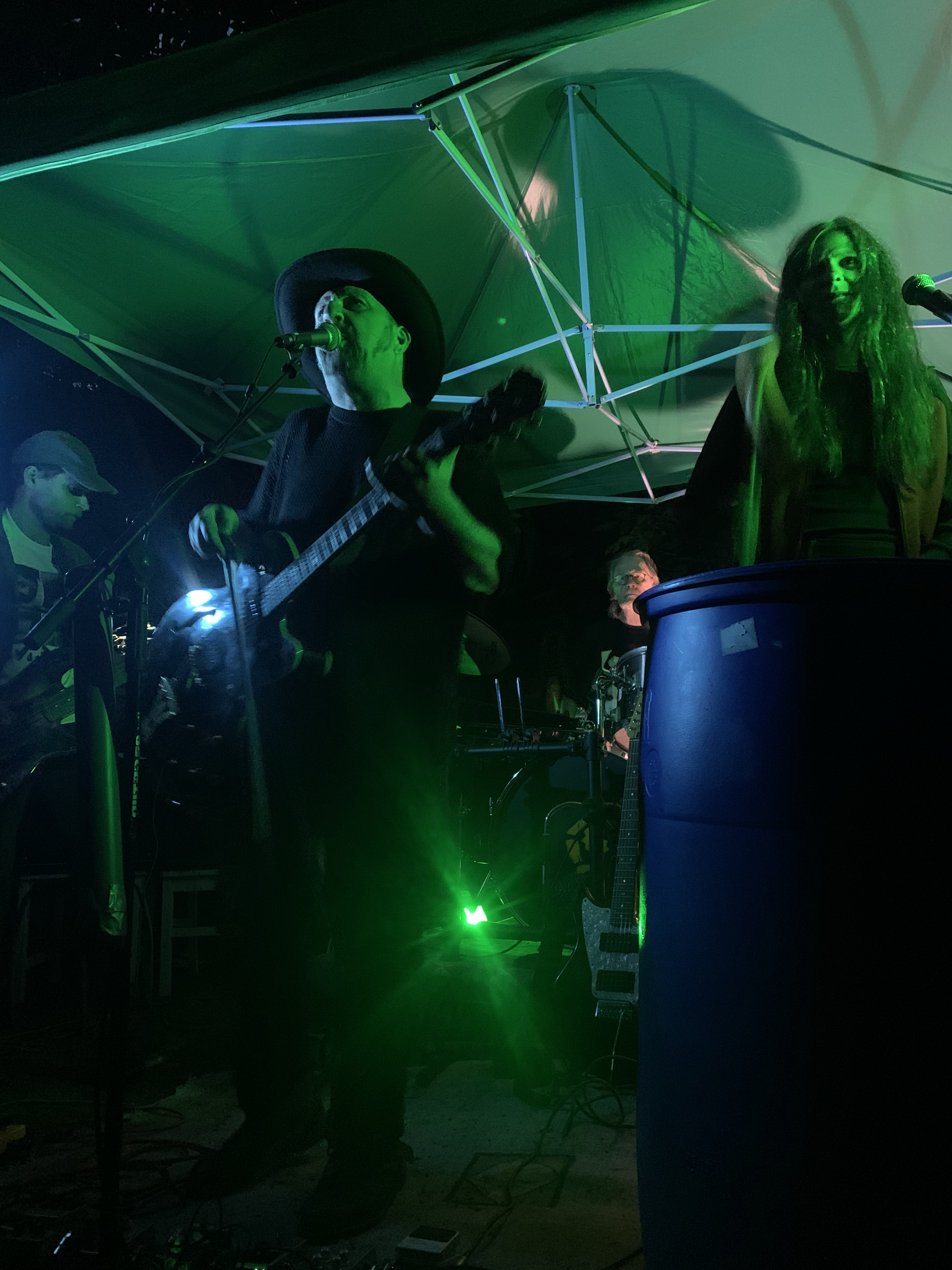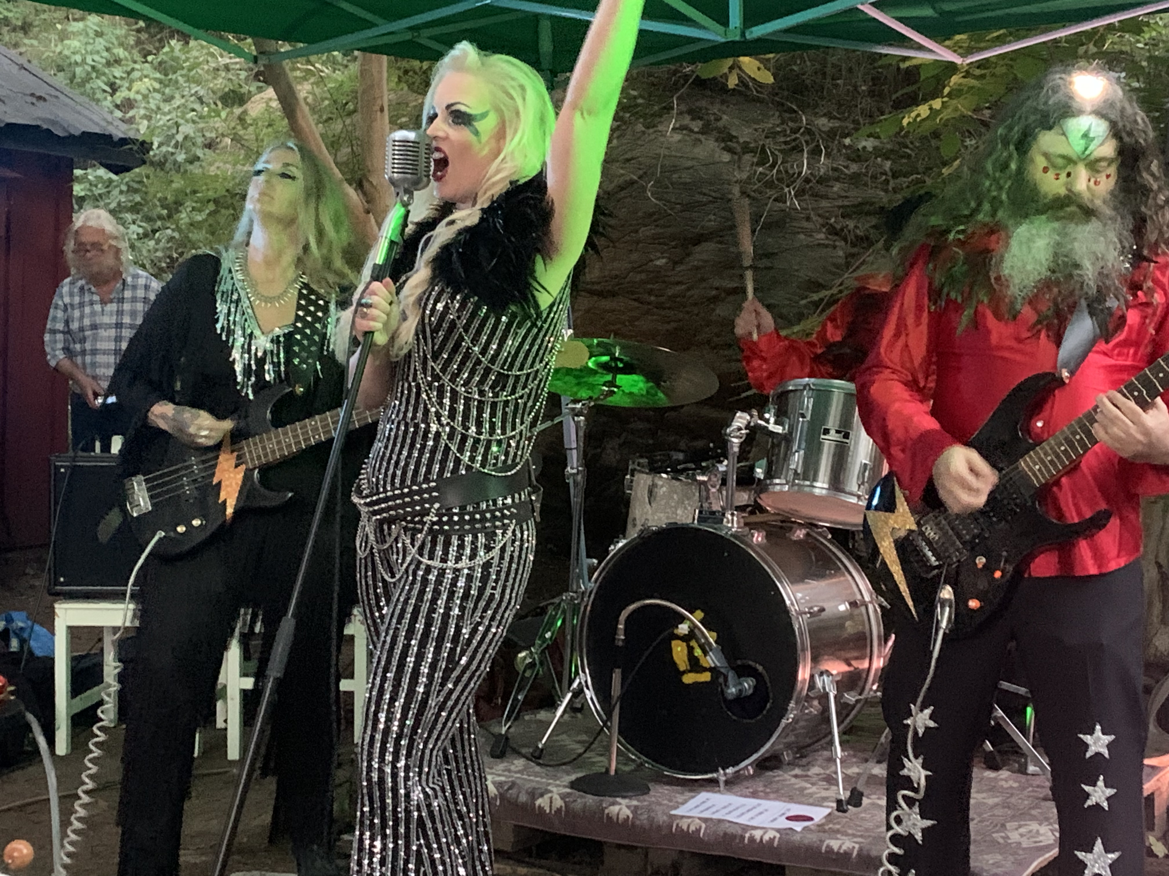 Klockan tickar och mörkret flaggar för sitt intåg. Plötsligt dyker ett sällskap upp som vore de hämtade från Roy Wood och hans Wizzard. Glammiga kläder, stjärnor och ansiktsmålningar. Spännande. På detta stampade jordgolv placeras en matta, på mattan två cirkelrunda plattor, svarta med en blixt sprakande ditmålad. Bandet har det klockrena namnet Avantgarbage och har sångerskan Jessica Åhman. En färgstark sångerska med röstresurser. Och, ja, bandet bygger sin musik på influenser från glameran för 50 år sedan. T Rex, Roy Wood, men väver också in en version av Runaways ”Cherry bomb”. Det är ett band som ännu är mer för ögat än örat. Men jag älskar pretentionerna, gesterna och att man hamnar på en ”scen” i dödsskuggans dal någonstans i Majorna.