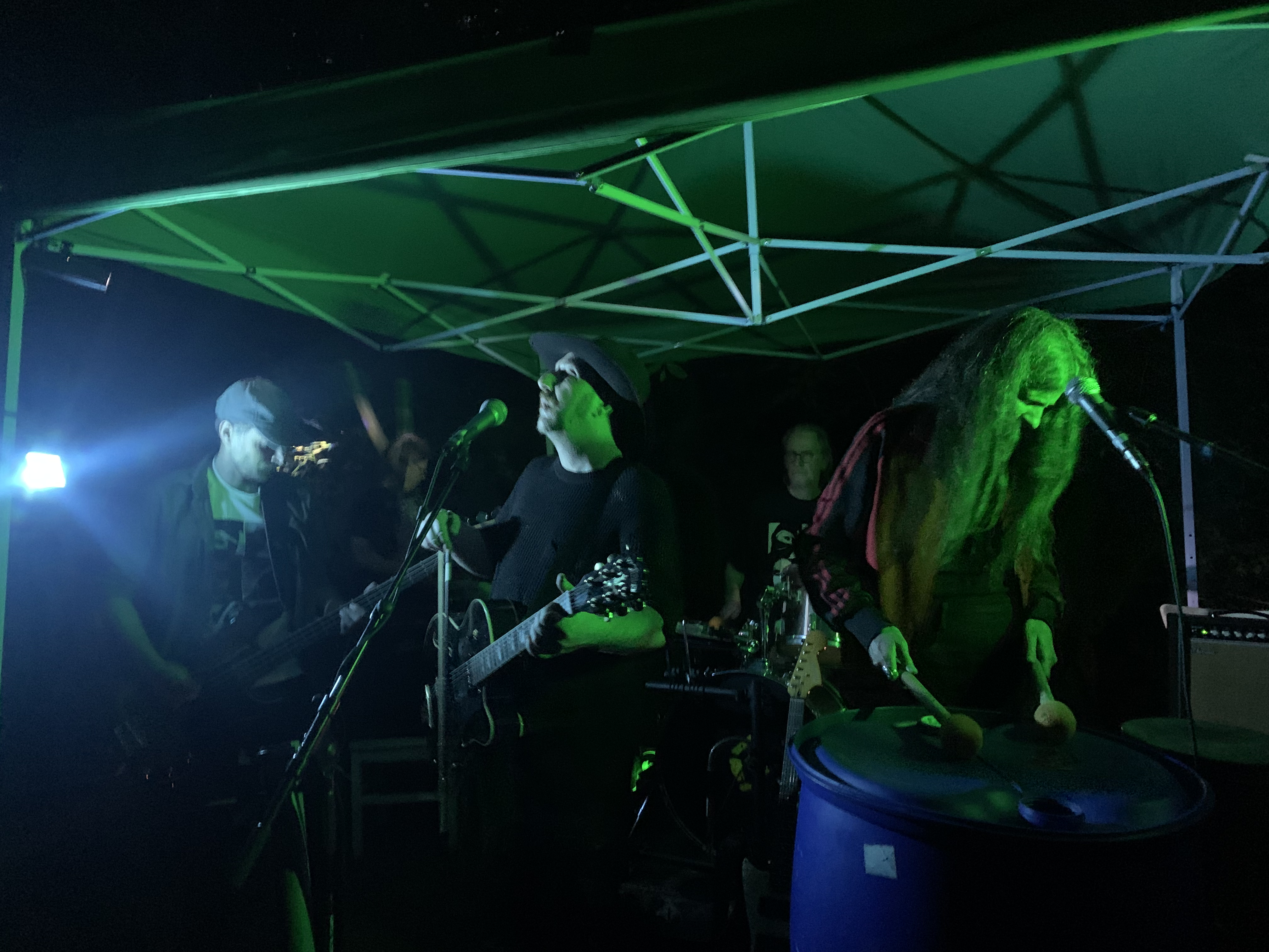 På plats band med förhoppningar och skilda uttryck. Ett enkel PA, instrument, ett partytält till skydd för ljus och mörker, kanske regn.