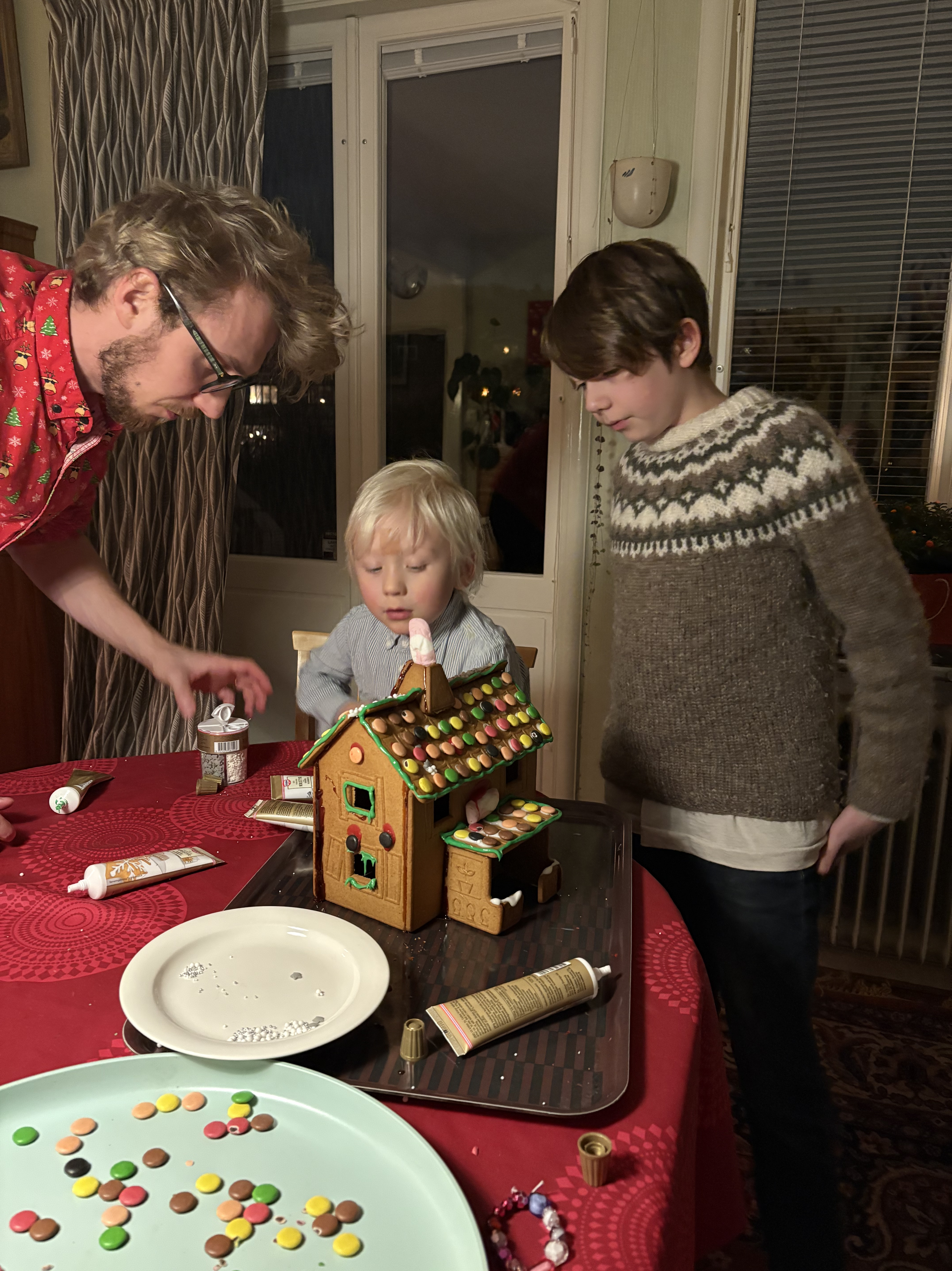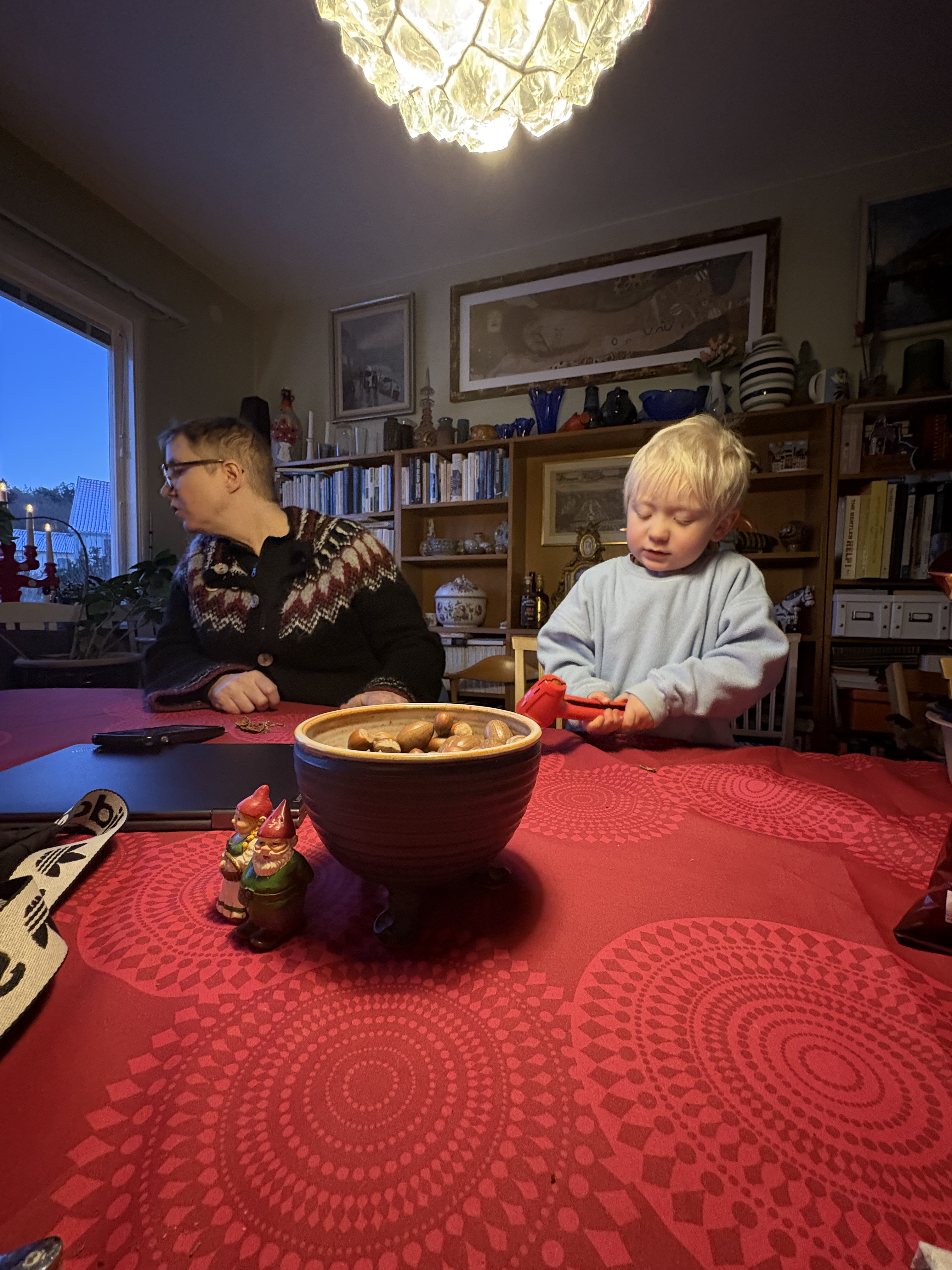 Så hem sent, men räddade av yngste sonen som hämtar. Tillbaka till vardagen. Z till jobbet. Jag till mitt. Farfarstorsdagarna drygas ut med lite fler träffar. Snön har fallit, så en pulkatur blir det i en klent snöig backe. Jag köper en duffel av en vän och före detta GT-kollega. Han använder den inte; jag kommer att göra det mycket.Det blir några teaterföreställningar, några utställningar och, förstås, julpyssel på första advent innan månaden stängs.