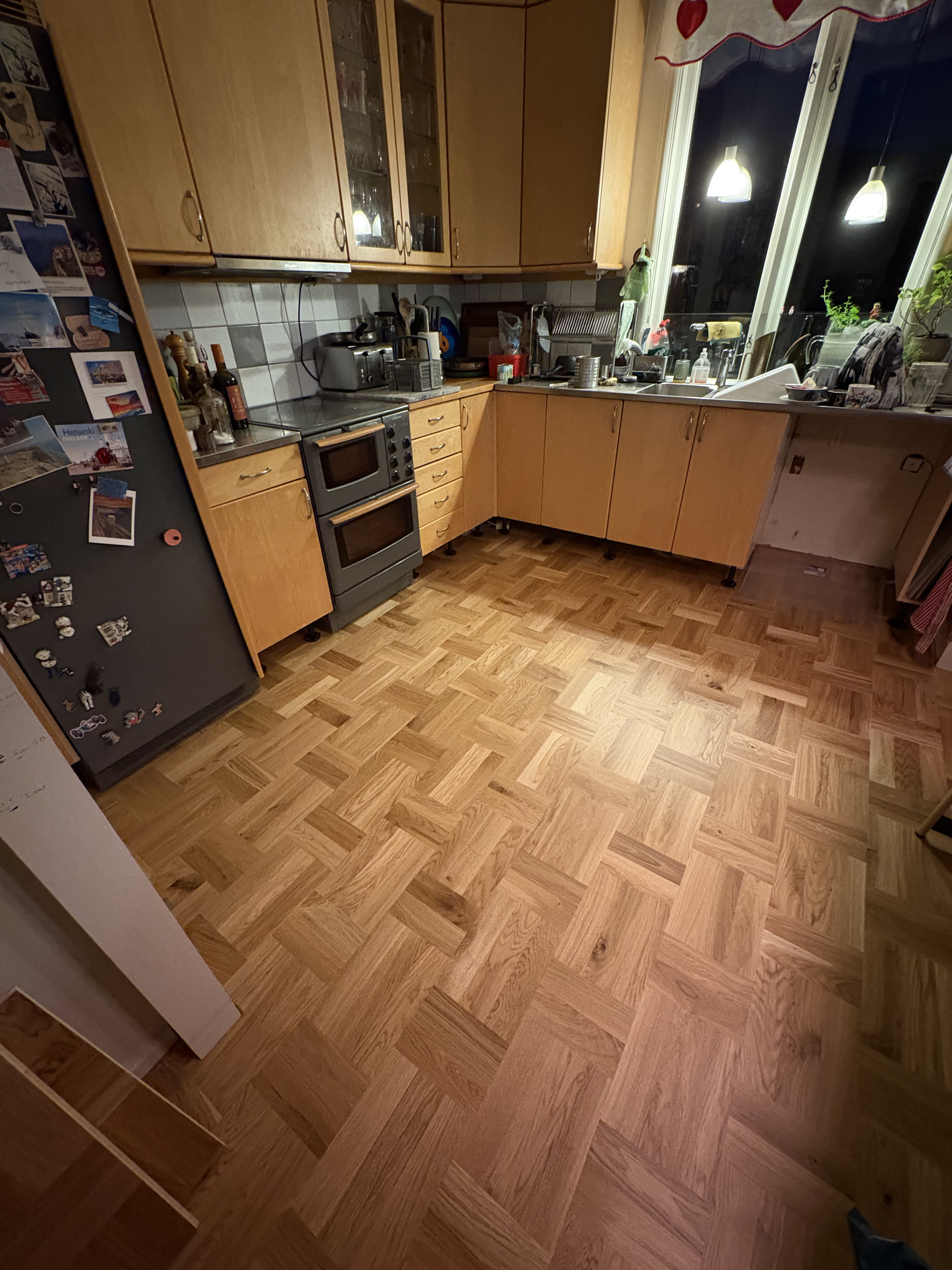 Sakta har det sipprat. Droppe för droppe. Vi har inte varit vaksamma nog. Kylskåpet har läckt och fördärvat parketten, som lades nytt och fint förändra 26 år sedan samtidigt som det nya köket byggdes. Nu skulle golvet väck, försäkringsman komma och kika. ut med det gamla, in med det nya. Det blev ett annorlunda julstök, men det blev fint när det var klart och dessutom i god tid innan jul.