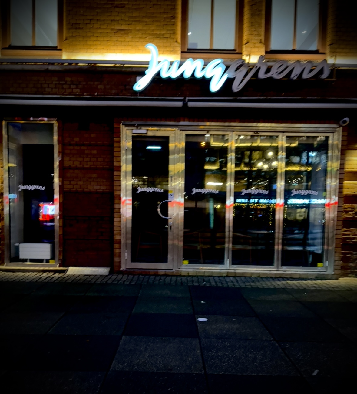 Klassiska Jungans på Avenyn gick i konkurs. Som ett tecken på det slocknade några bokstäver i neonskylten så att det bara blev Jung. Skrev ett aprilskämt i bloggen (läs det här), som fortfarande lockar till läsning. Bäst av allt att jag lyckades lura den förra ägaren, som trodde på det jag skrev.