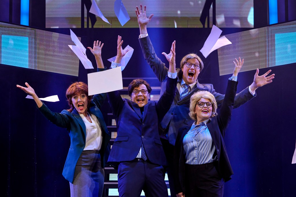 För så är det. Gänget i Falkenbergsrevyn är så kompetent. Här samsas avancerad koreografi med stämsång i toppklass. Avslutanden numret i första akten – ”Hemliga dokument” om alla regeringens sjabbel under året med viktiga handlingar – är ju ett musikalnummer på högsta nivå.