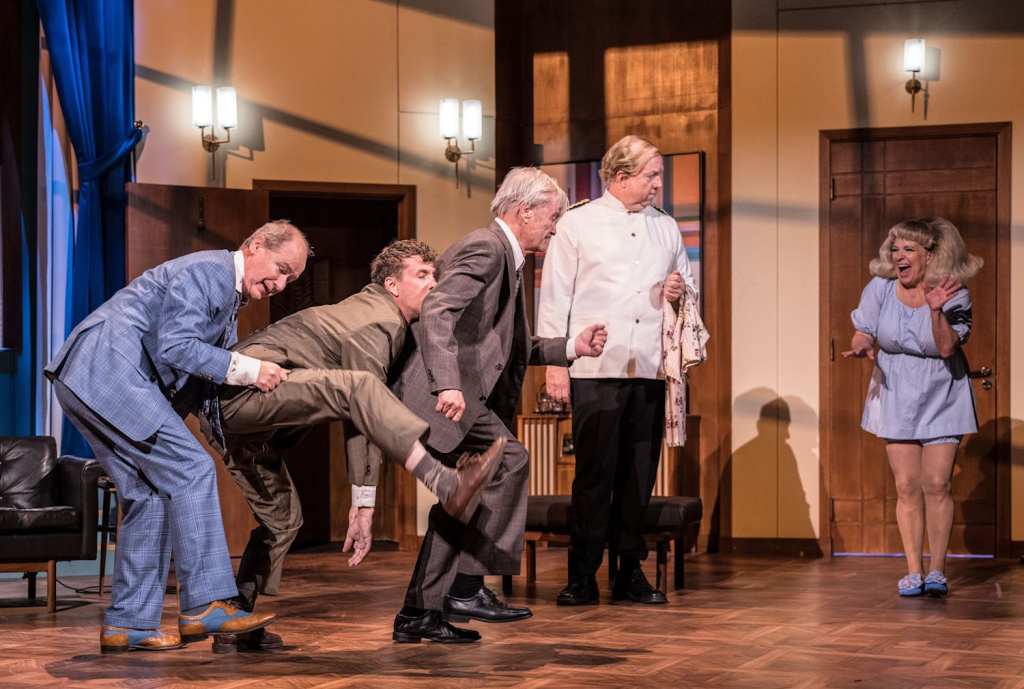 Ja, här får Ola Forssmed utnyttja sin fantastiska slapstickmotorik till fullo. Inledningsvis har han inga repliker. Det är kroppsspråket som får tala och som han gör det. ja, jag har sett honom otaliga gånger i dråpliga roller, men det här går utanför allt annat. Han är fullkomligt briljant. Lägg till detta en Robert Gustafsson i stormform och perfekta roller för de andra i ensemblen, som har man en fars som jag förstår har blivit en succé.