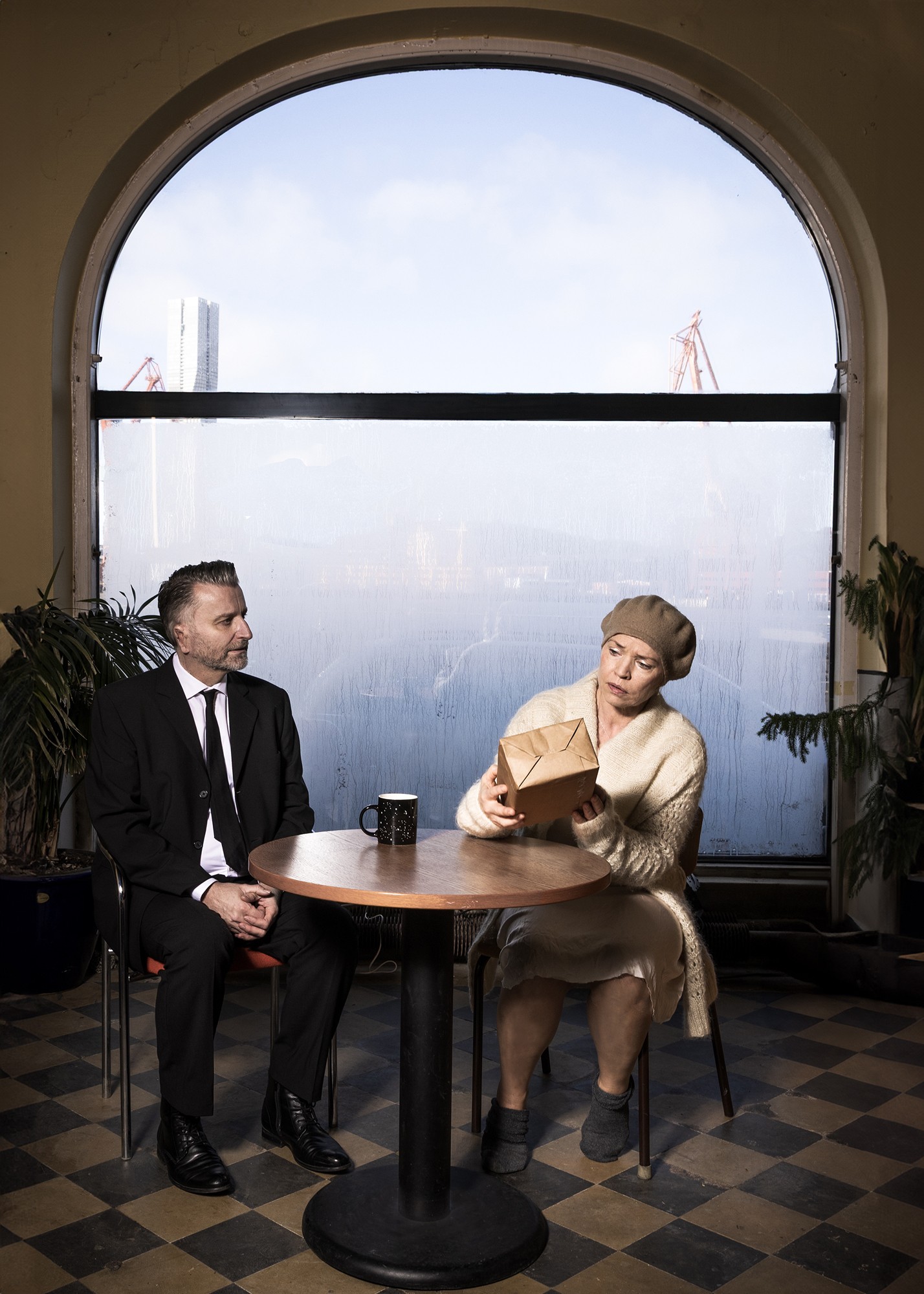 En man glider sakta in i salongen, som leder han en begravning. Vad han egentligen gör är att skrida in i sitt rum efter döden. Tystnaden omsluter honom, prydligt klädd i svart kostym, vit skjorta, svart slips, svarta skor, ansat skägg och stilfull frisyr, noga lagd. Som om ingenting berör. Han är tillfreds i intigheten.Ingenting yttre stör. Ett bord, en temugg, två stolar. En sparsam inredning. Så liksom flyter en kvinna in i bilden och i rummet. Tar plats i mannens sfär. Bryter tystnaden. Hon talför. Han kärv. Hon anklagande, frågande. Han defensiv.
