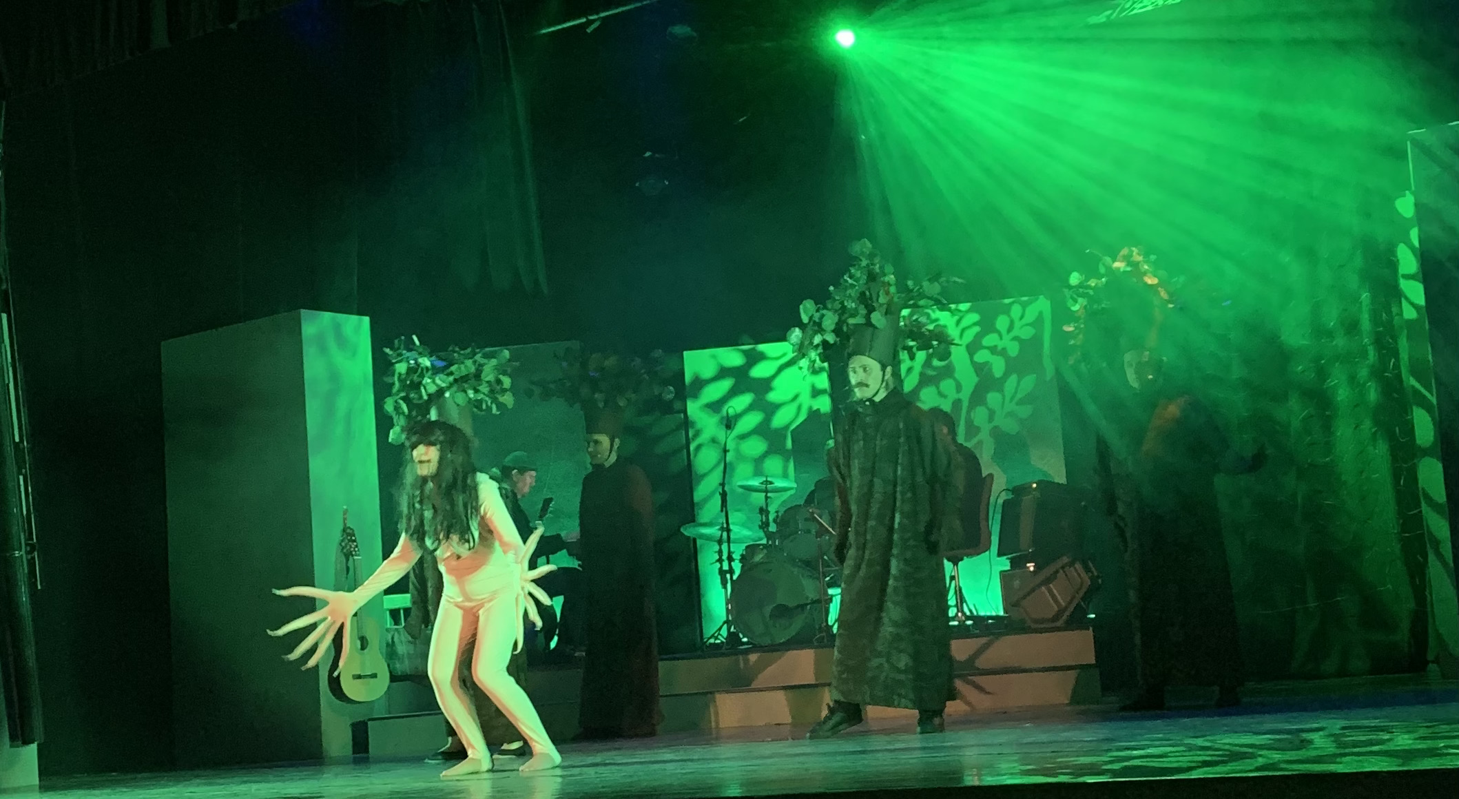 Starka prestationer. Balettakademins uppsättning av musikalen ”Häxorna i Eastwick” bjuder på stronga insatser av de medverkande. Här Alice Höök, Jesper Cameron, Aurora Reed Jenssen och Johanne Misser. Foto: PONTUS JOHANSSON