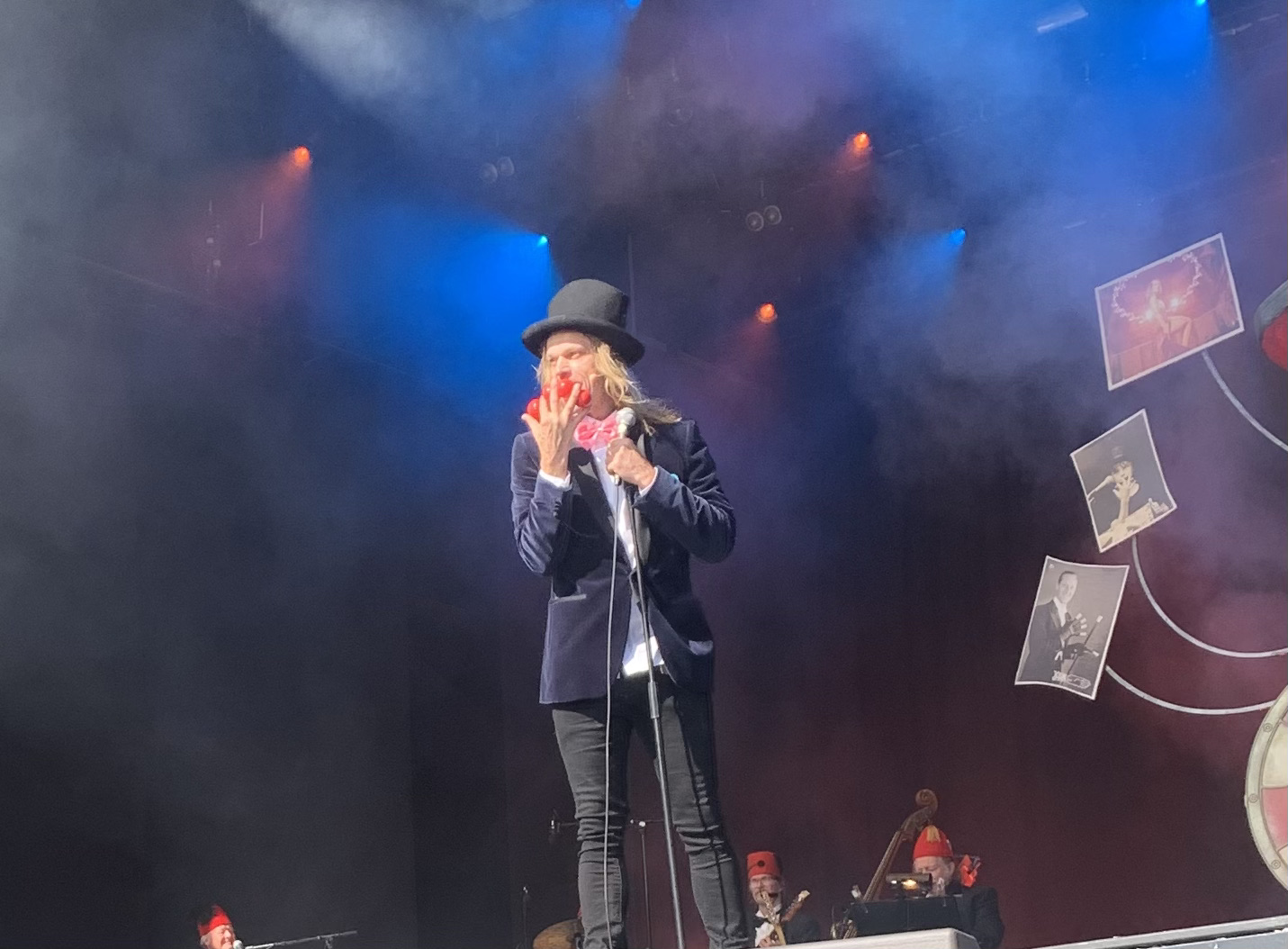 Det låter skevt och vint, galet och otyglat. Bandet livar olika scenkaraktärer med något slags piratlook blandat med Tobias Wiklunds trollkarlsoutfit med stor, toppig lila hatt och en matchande fotsid mantel. David Nyström antar utmaningen att köra något slags 1700-talslook med en vit peruk på huvudet som han, imponerande, klarar att bära hela den intensiva spelningen igenom.
