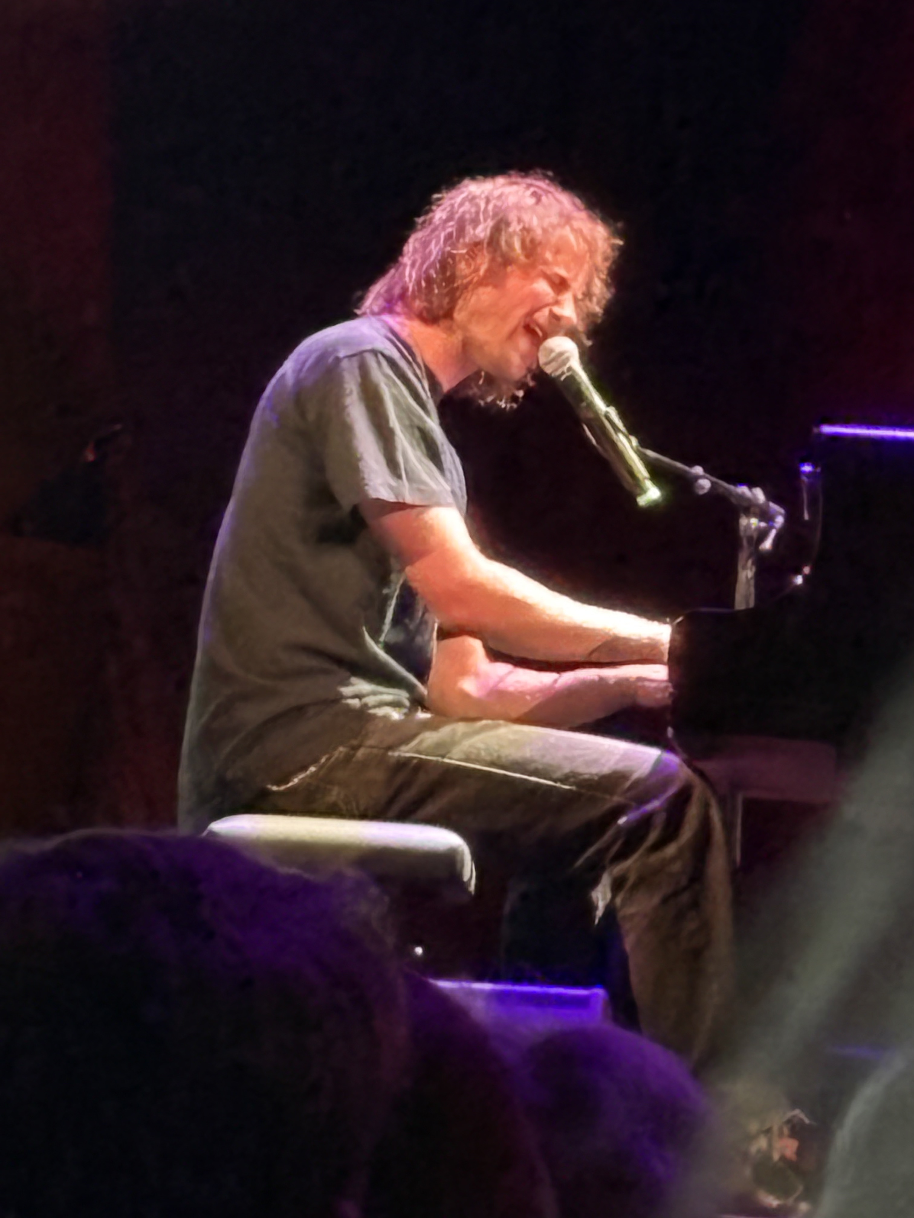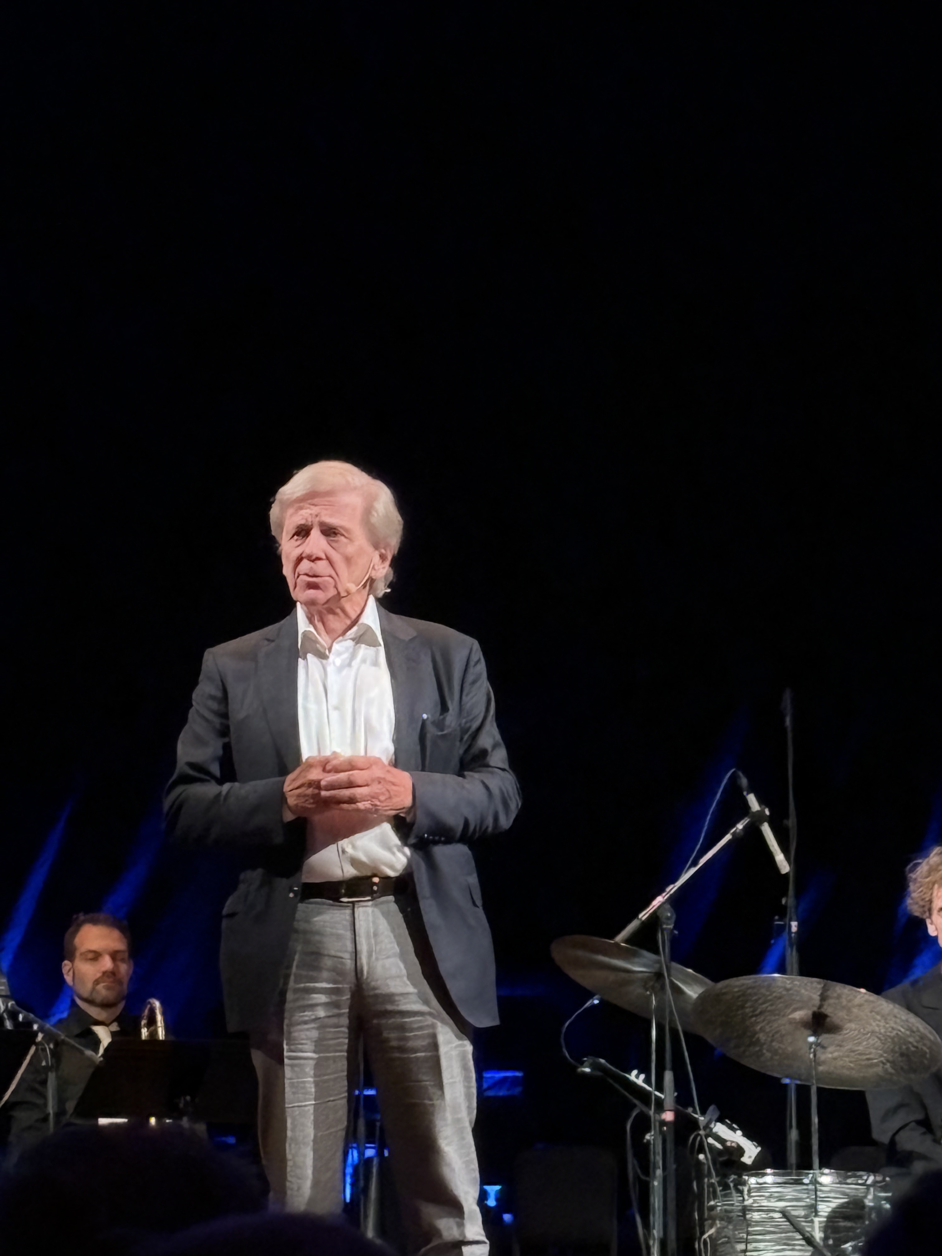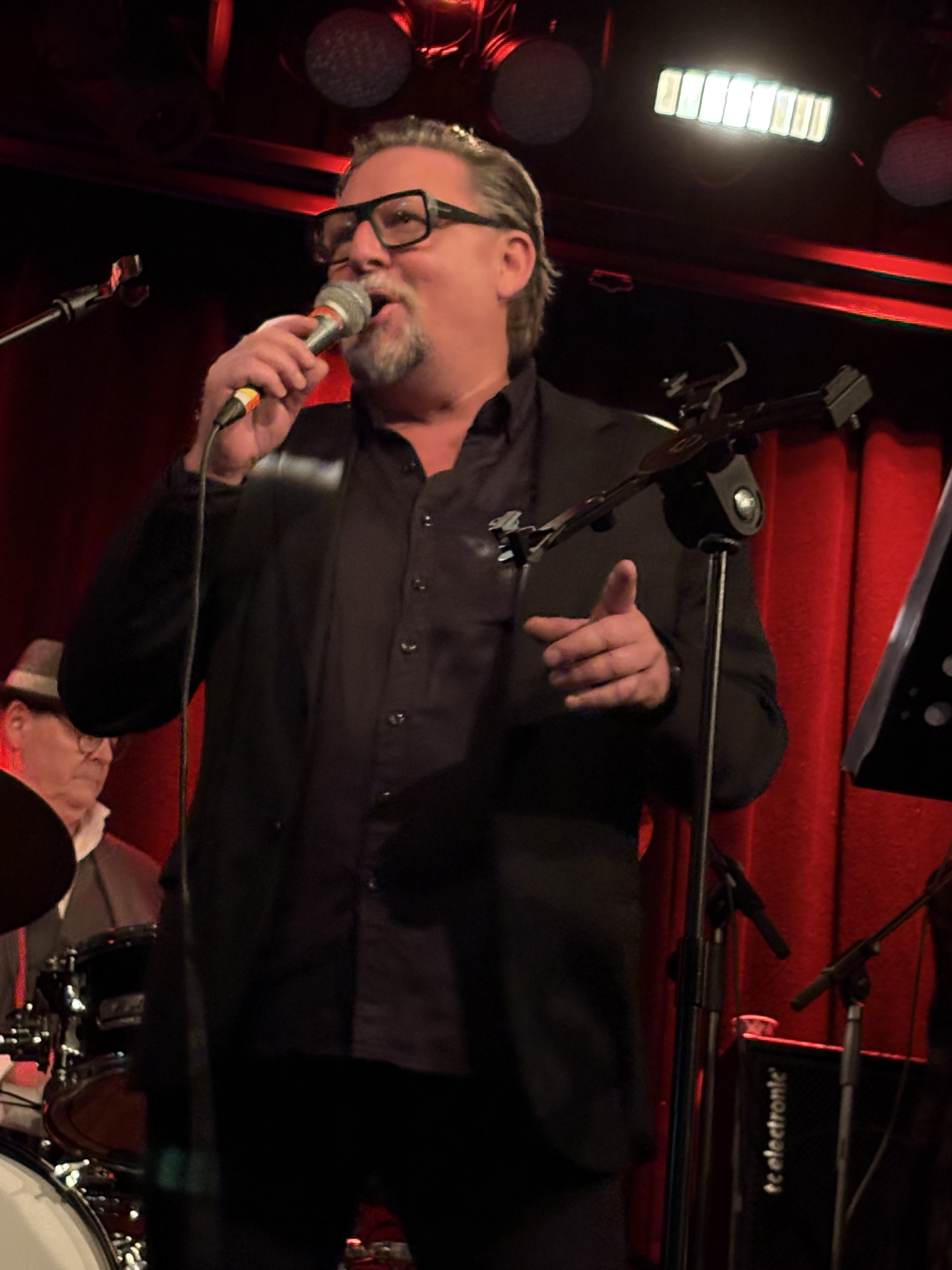 Nu är han alltså åter ensam på scen, men är snabb att invitera den utspridda publiken som prydligt sitter vid matsalsborden med en distans som vore det fortfarande pandemiska restriktioner.