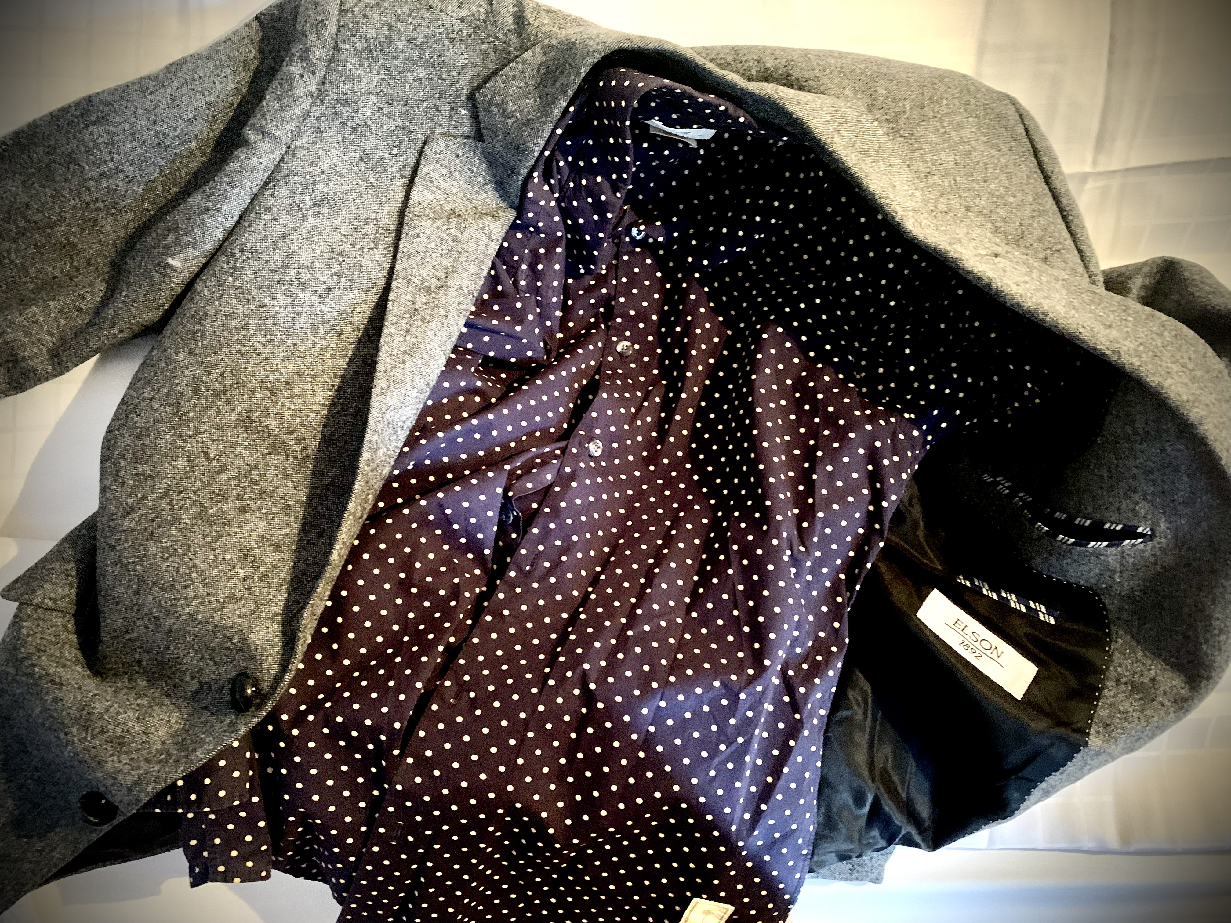 På andra sidan Gammel Kongevej ligger så första Røde korsbutiken, som har stängt! Men… innanför huserar en expedit, som snart kommer och öppnar. Det visar sig att hon som frivilliganställd inte fått tiden att räcka till. Uppgifterna om öppningstider får man helt enkelt ta med en nya salt. Vi kliver in. Kollar en vända. Stannar vid herrkläderna. Z hittar en tredelad kostym, som verkar vara fint skräddad och av utmärkt kvalitet, ylle. Priset står inte utsatt. Jag kikar vidare medan Z dividerar med expediten, får priset 350 DKK och där vidgas mina öron. Jag googlar inte märket, men sättet kostymen är sydd på gör att jag köper den. Storleken…? Ja, den passar definitivt inte mig. Men kanske mina söner. Det blir en vinröd manchesterkeps av okänt märke för 50 DKK innan vi går ut med en stor bärkasse. Senare kollar jag upp Magee 1866 och inser att det är ett bra köp. Surt att jag vuxit till mig genom åren. Men, men, men…