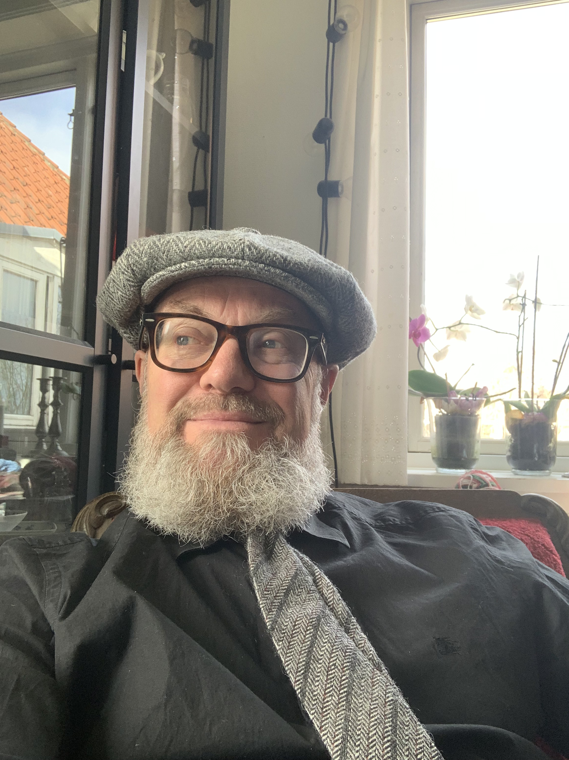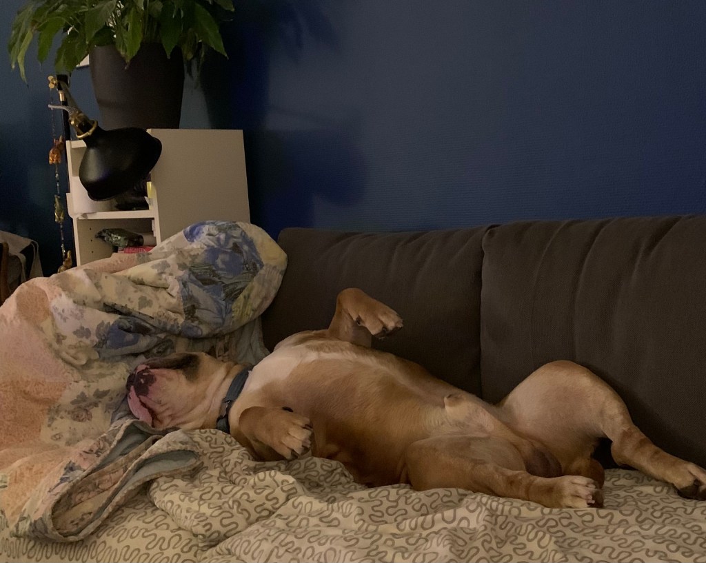 Det går snabbt att installera sig hos T där Max, den glada jycken, överfaller oss i sin entusiasm. Jag håller honom kort. Är förtjust i honom, men inte i hoppandet. Men han lugnar ner sig, blir klappad. Vid bjuds på aftonspisning med smørrebrød med pålägg av det som bjuds i huset. Det blir bra. Vinet likaså. Vi bygger oss. har kvällen med ro. Kikar lite på teve innan vi ändar en lång dag.