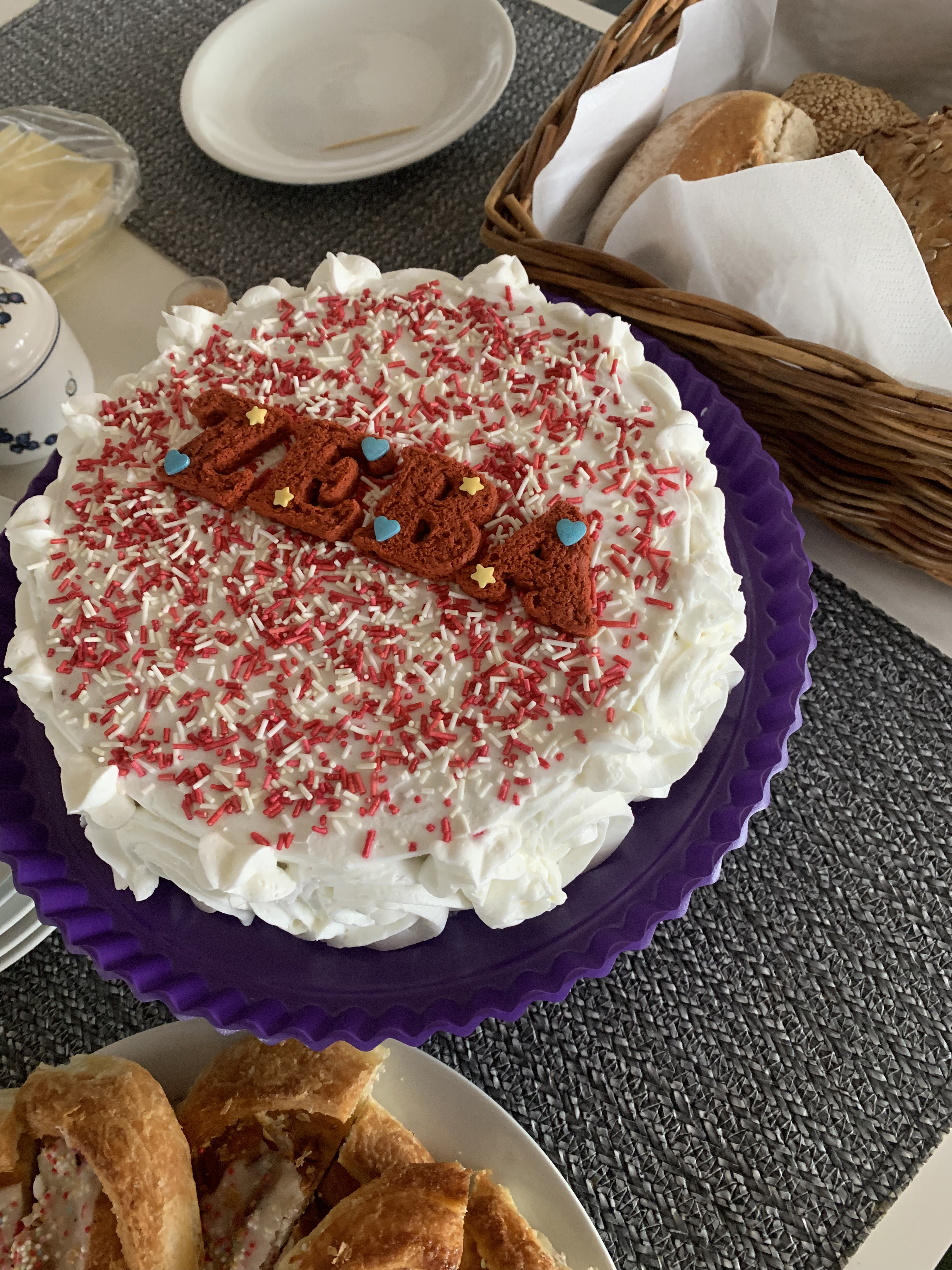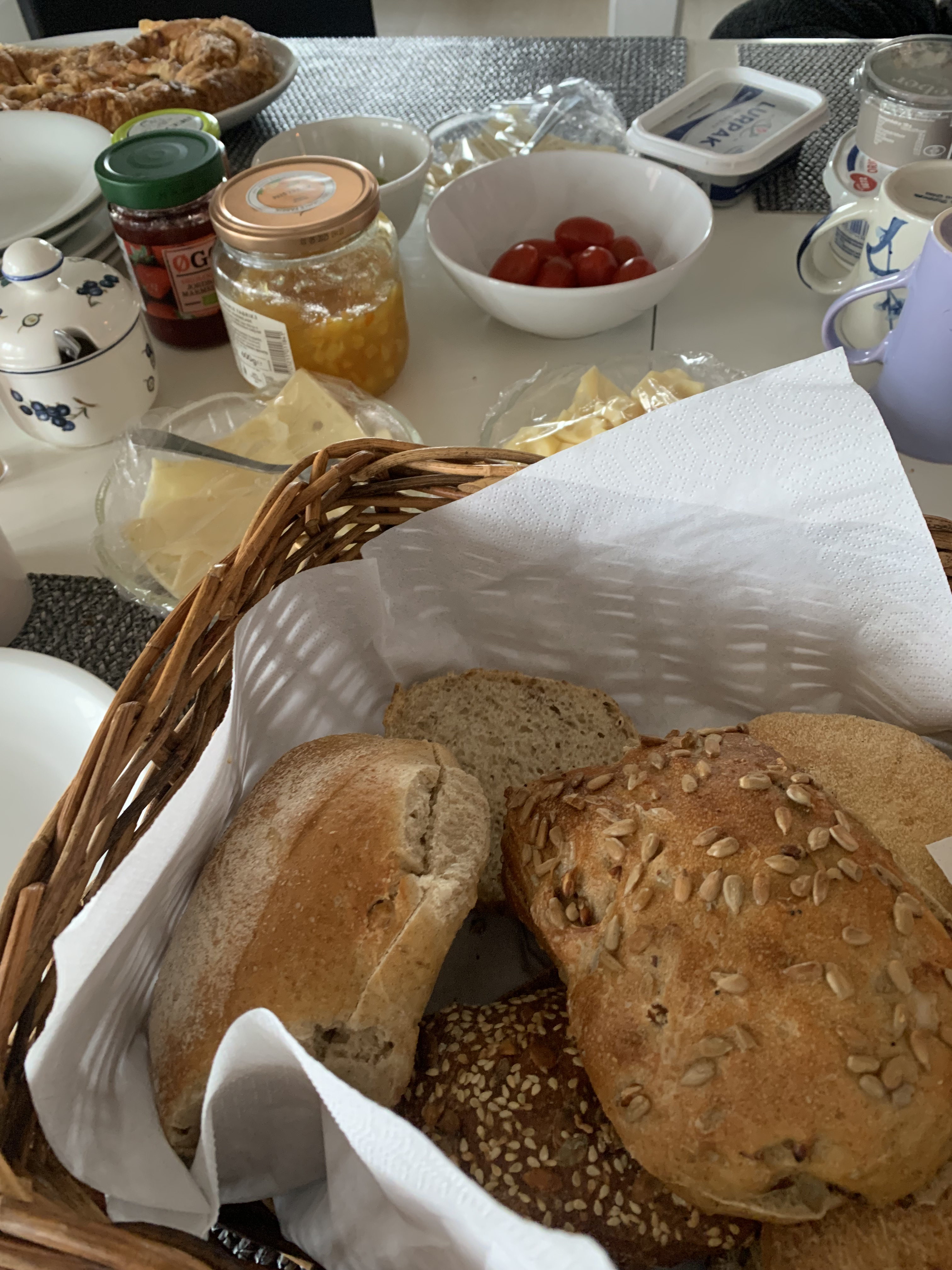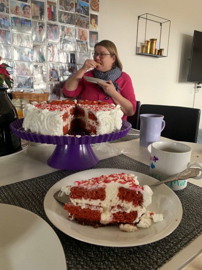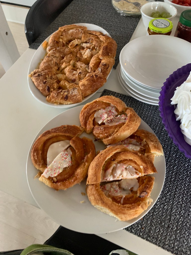Så kalas i Ølstykke med kaffe, bröd, ost och bullar. Vi lyckas pricka in alla N:s barn, som kommer i omgångar och det blir en mindre släktträff till Z:s stora glädje. Lillasyster I har bakat en kaka, trots Z:s förmaningar om att hon har köpt bakverk; en fin, danskt välsmakande.