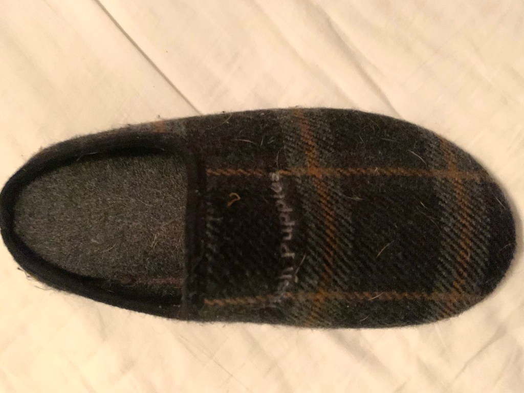 Tiden lider och snart är vi på väg norröver. Ett stopp vid Prøvestenen och Kvickly för dansk proviantering och med en fullastad bil kör vi på färjan och av densamma. Några timmar senare, efter en resa i regn, är vi hemma. Där konstaterar jag att min ena Hush Puppie-toffla har slunkit ur bagaget. Den finns inte i Bagsværd, inte hemma, inte i bilen eller utanför densamma. Någonstans finns den. Men var…?