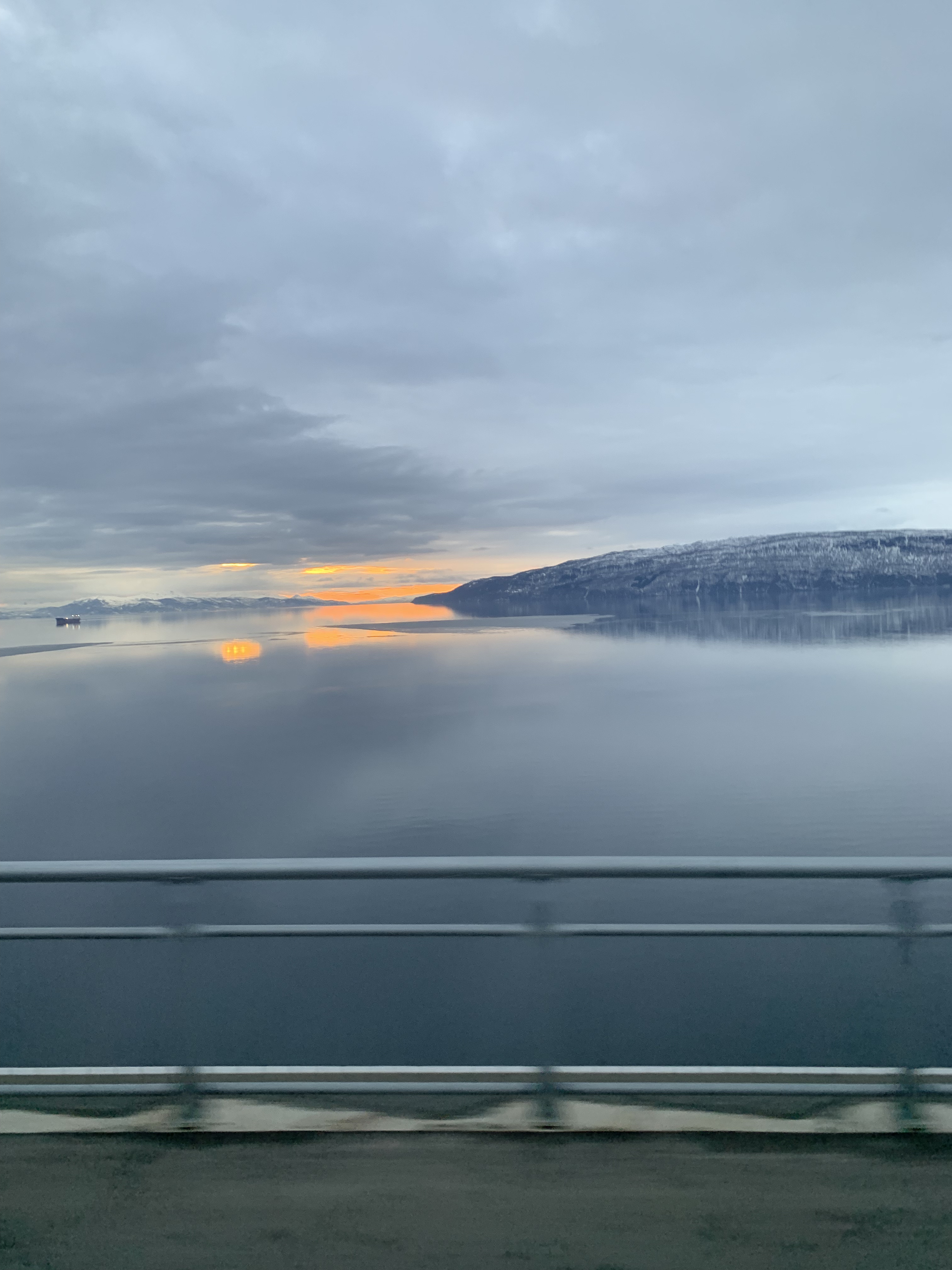 Tiden går och flygbussen kommer. Jag kliver på som första och så här långt enda passageraren. Men vid nästa busstopp, nere Narvik busstatjon fylls det på med råge utan att bussen blir helt full. Vi styr ut efter stopp vid Grand Royal ur Narvik, passerar den korta tunnel som sedan bjuder den Håloglandsbroa – som stolt och vackert spänner drygt 1500 meter med 40 meters segelhöjd över Rombaksfjorden – för vidare färd västerut mot flygplatsen vid Evensmarka.