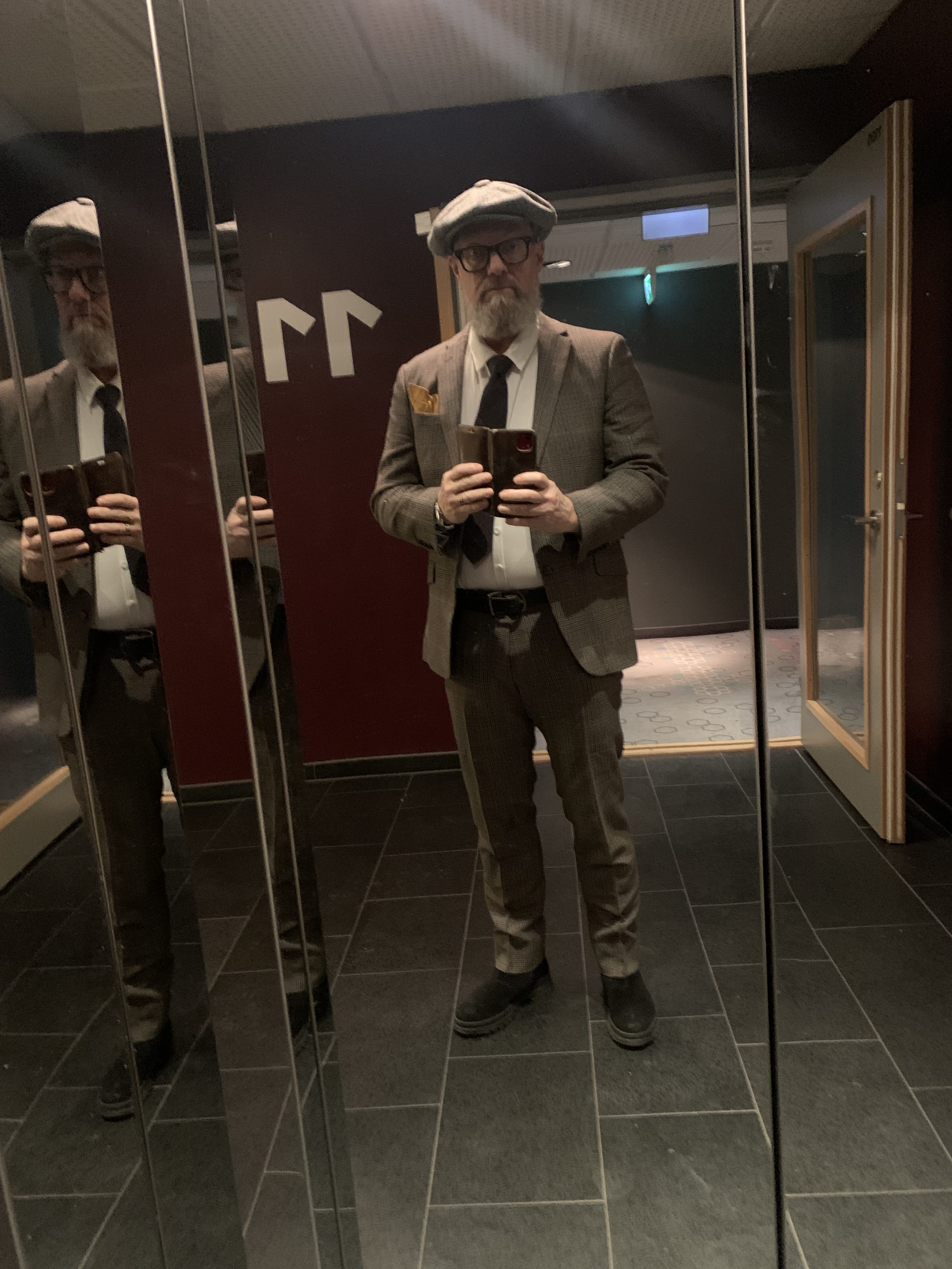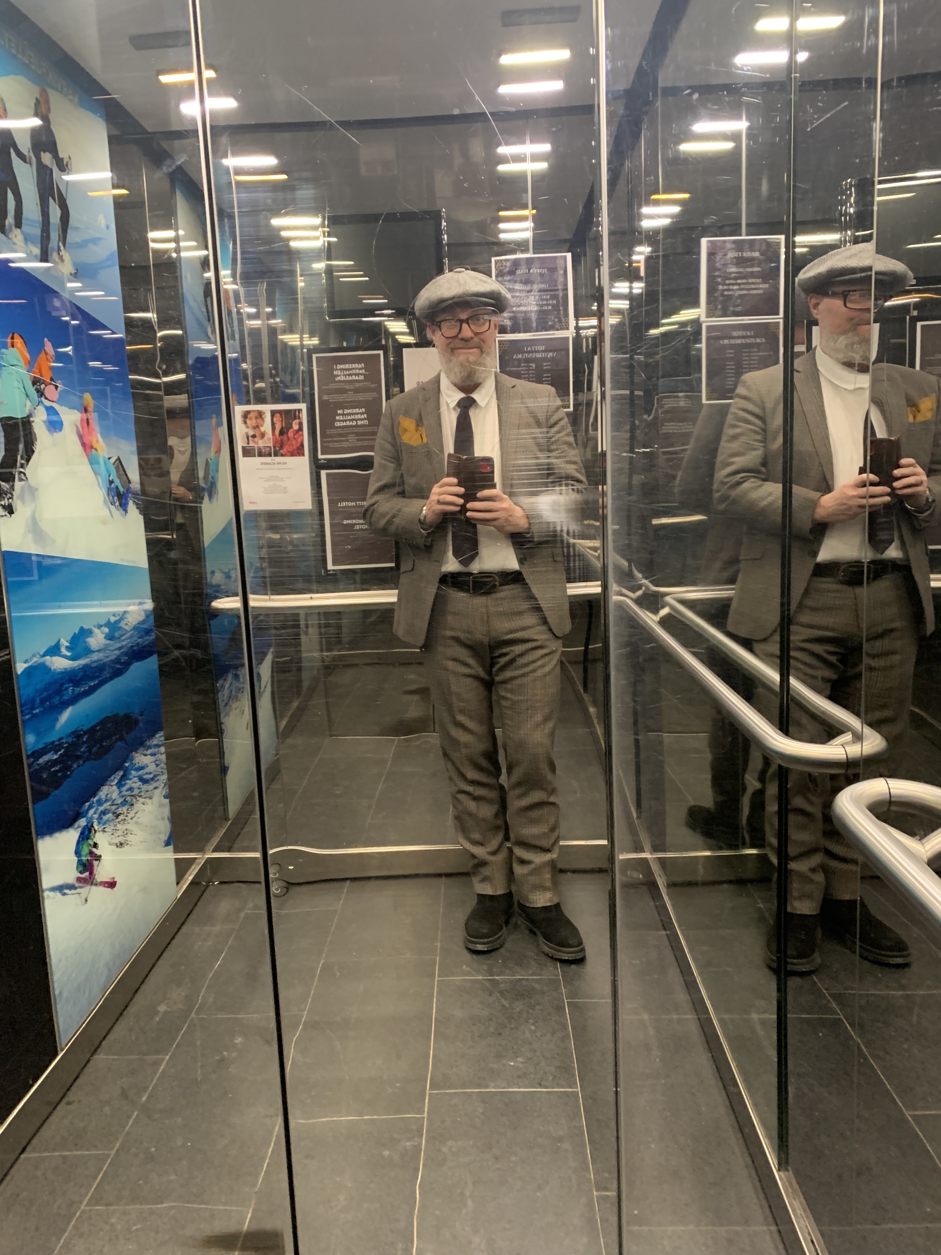 Jag läser vidare i boken, kollar folk i foajén efter att jag krånglat mig ur utcheckningen från en nyanställd. Men det löste sig. Folk kommer. Folk går. Jag smygtittar. Kollar in en man som är häftigt extravagant klädd. Ser en kvinna, som nära på är likadant klädd. Smygfotar.