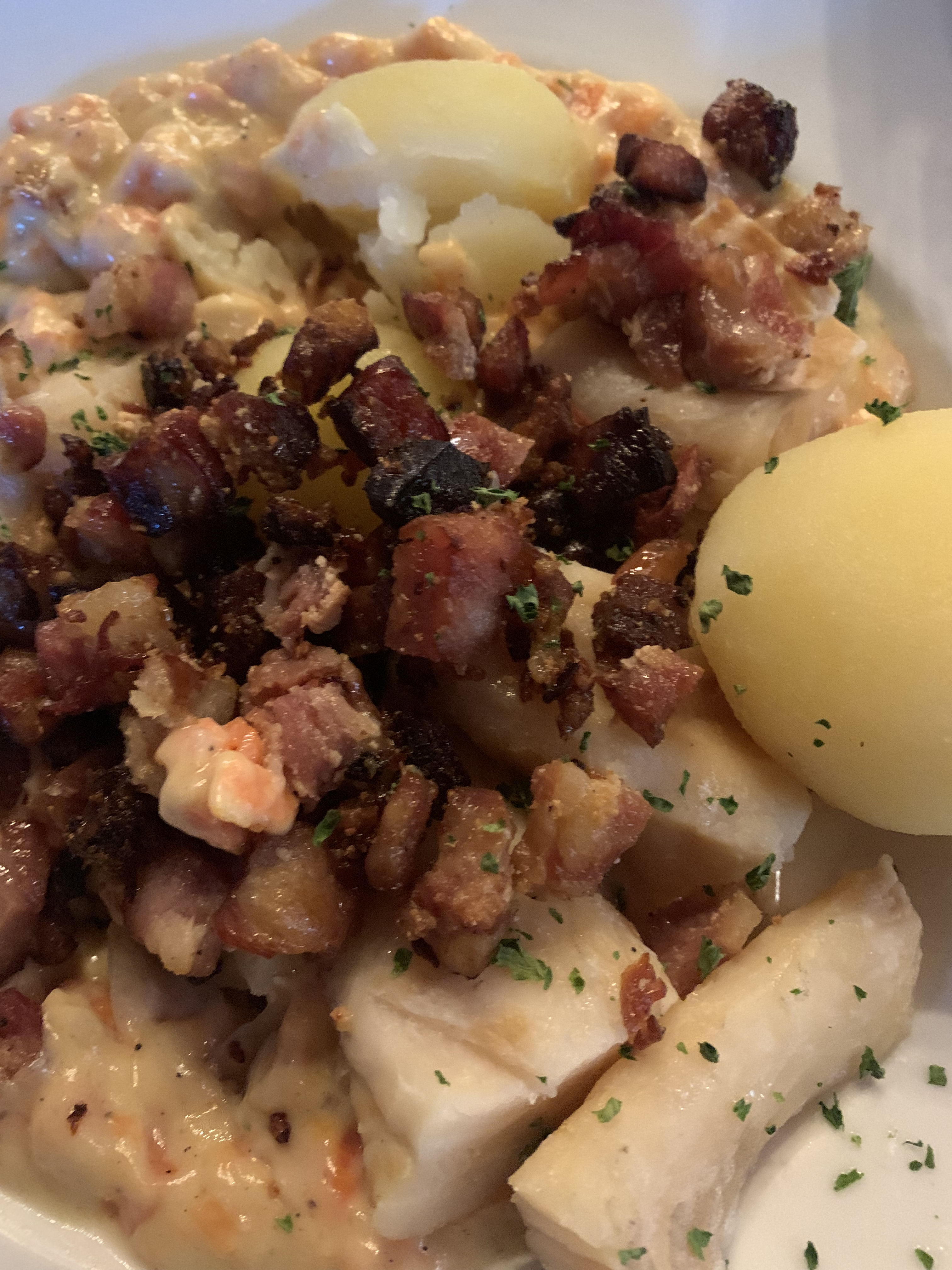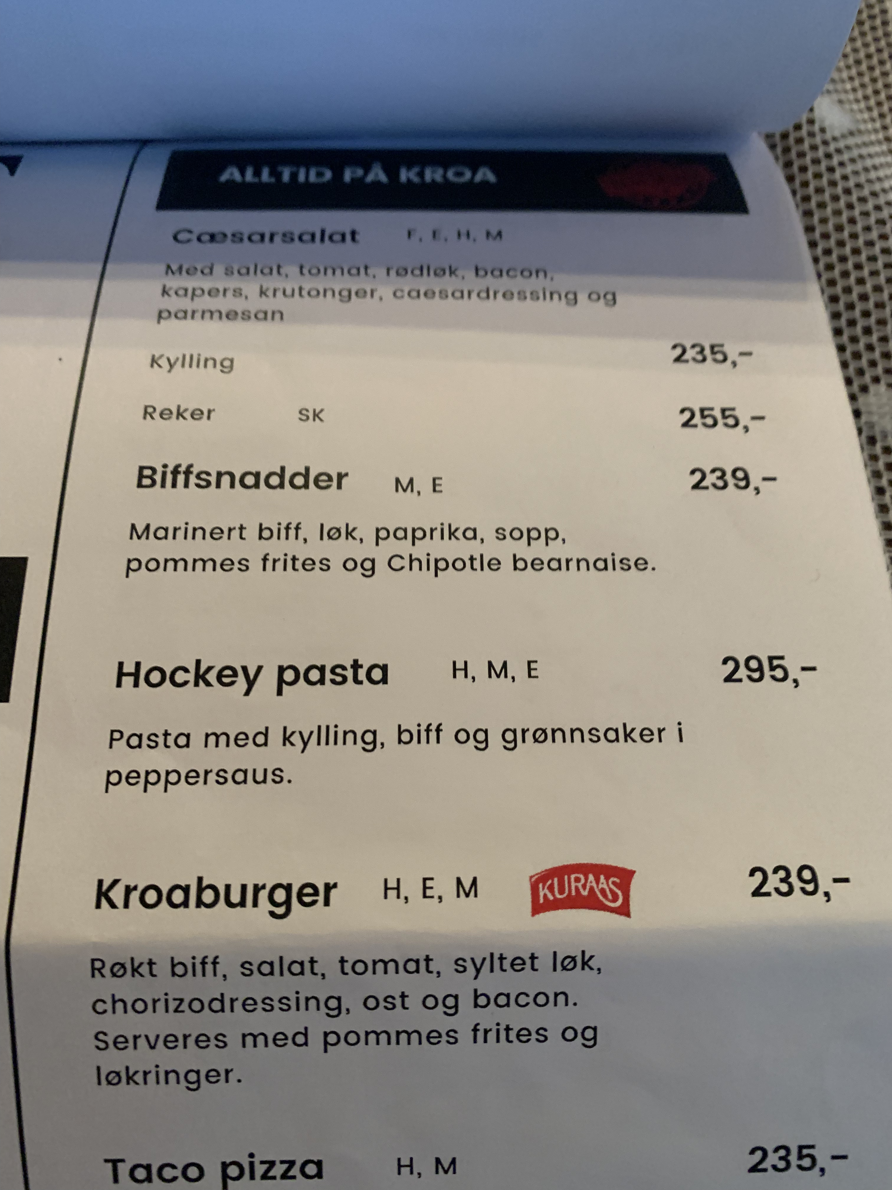 Jag beställer en öl och får in en Ringnes till den fiskrätt som jag beställer, som är något lutfiskliknande. Mycket, men gott. Notera att jag undviker menyns Hockeypasta.
