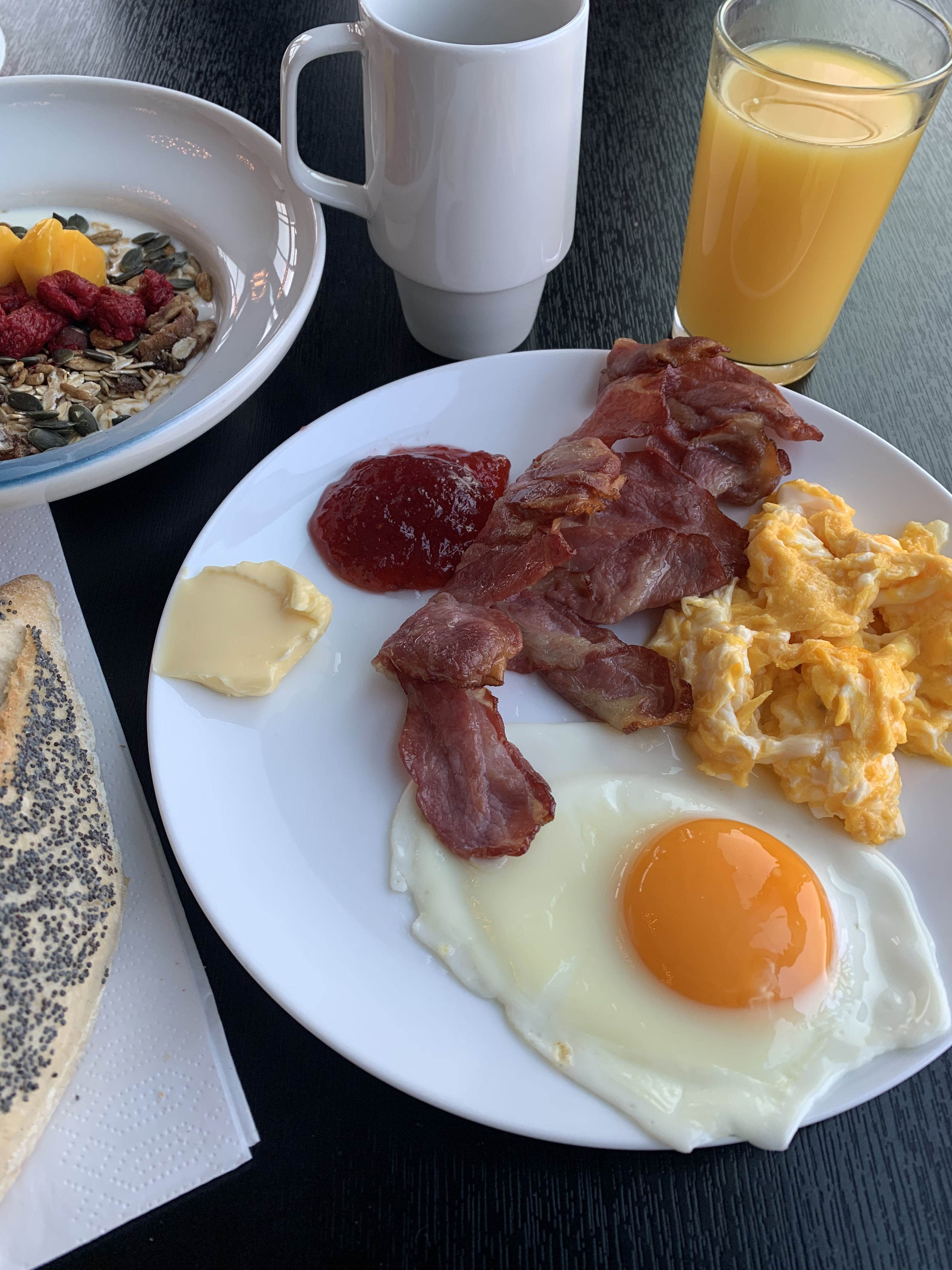 Klockan åtta står jag i kö för frukost och det är jag inte ensam om. Jag inleder med att sitta ensam, men matsalen fylls på och jag förvånas över hur vissa gäster breder ut sig som om ingen annan ska sitta bredvid dem, trots att behovet finns. Väskor och jackor blockerar, som på spårvagnen här hemma i rusningstrafik.