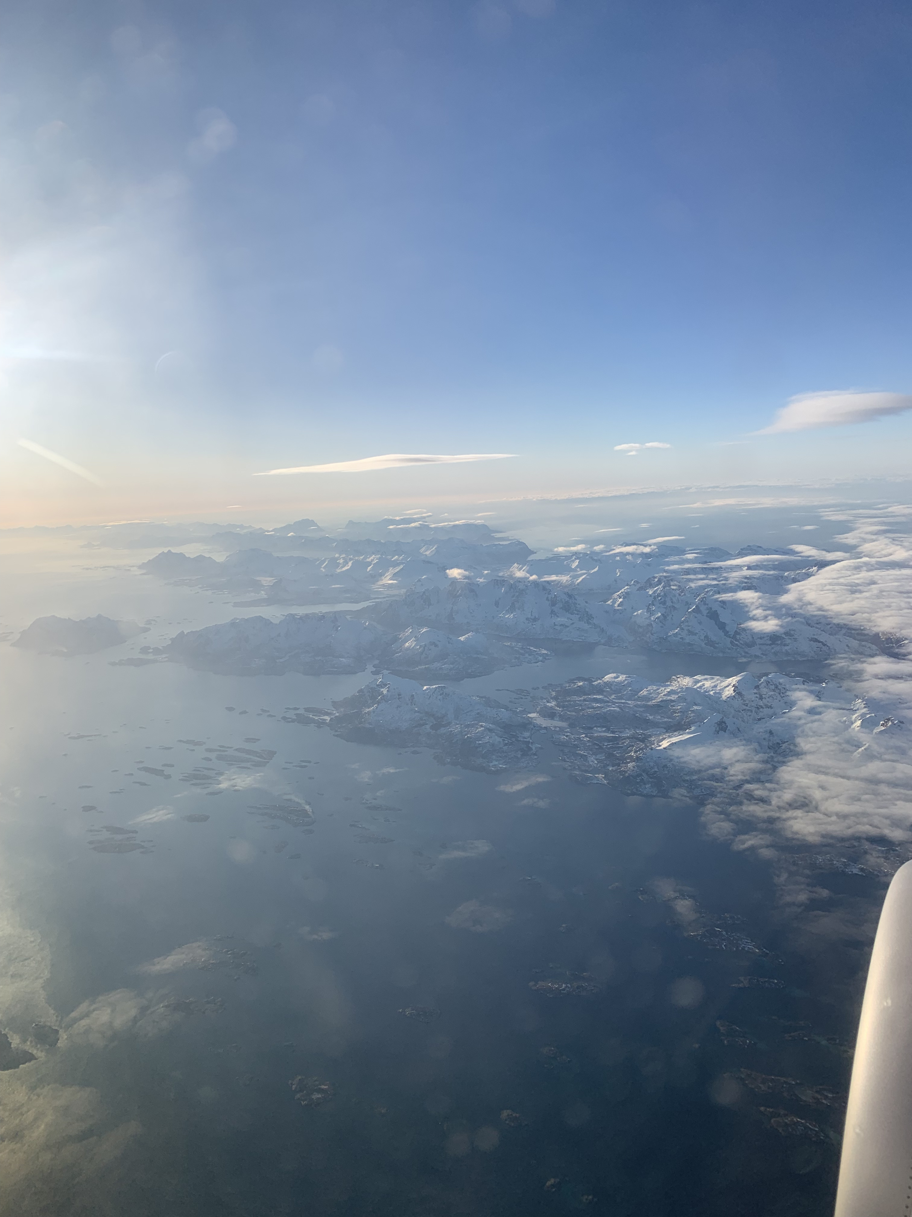 Efter en viss väntan får vi gå ombord på planet. Nu har jag fönsterplats med fönster och får, väl upp i luften, en fantastisk vy över Lofoten, siktar ön Skrova (första anhalten på vår segling sommaren 2019), Solvær (Lars Lerins hemvist under Lofotenåren, men dit vi aldrig kom), Kabelsvåg och Hennungsvær och de övriga hamnarna som vi gästade, som från luften är alltför små för att se. Sedan breder sig ett vackert, intensivt molntäcke upp, som emellanåt glesar ut och jag kan bara ana vilka fjordar vi passerar.