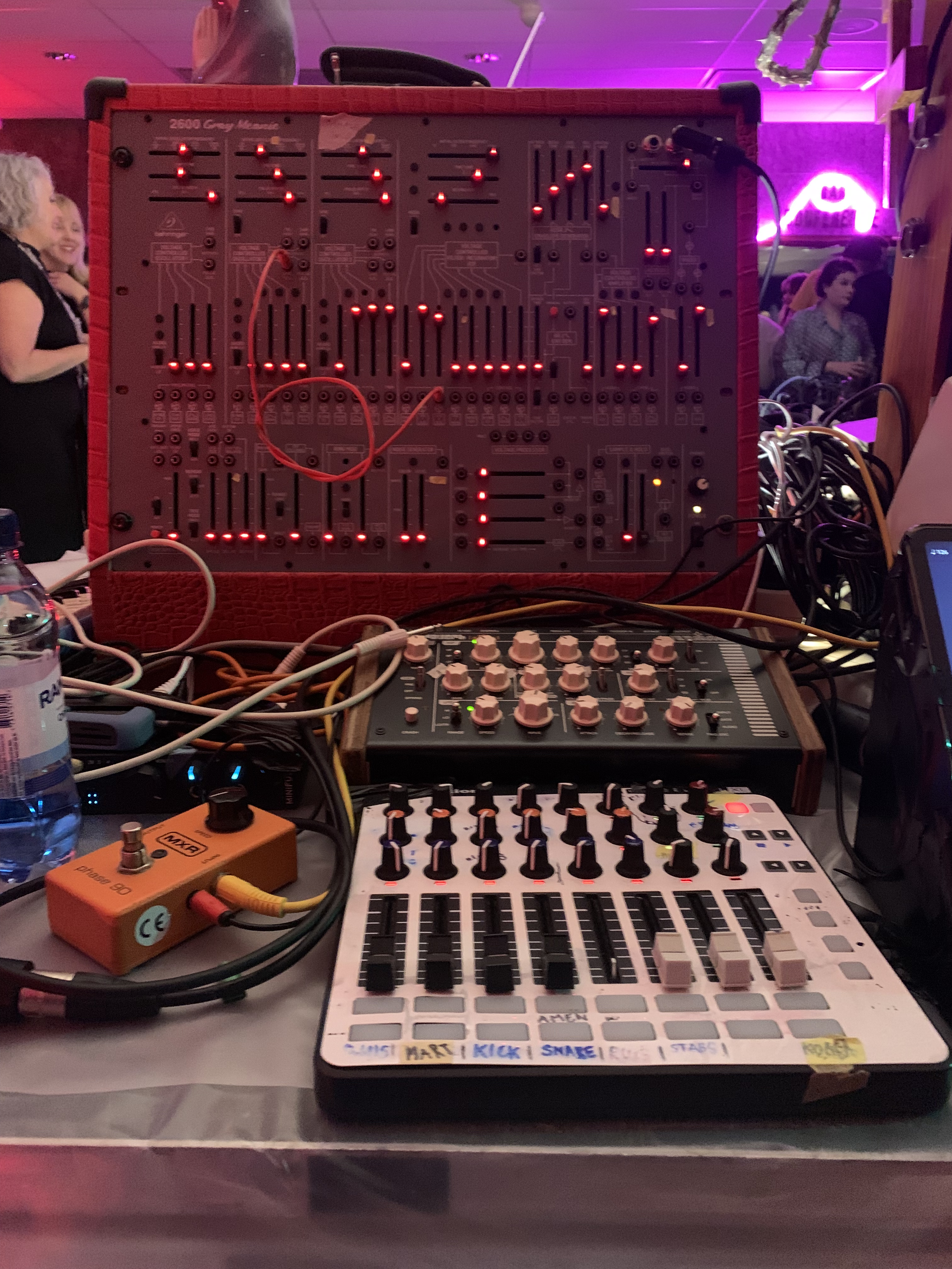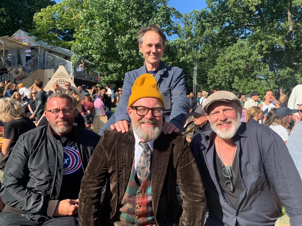 Ett meddelande om ”vi ser dig” gör mig brydd. Jag har gått i lovar runt området utan att upptäcka en enda webster. ”Till höger”, blir nästa meddelande. ”Parkbänken”, nästa igen. Ah, där sitter trummisen Ola Jameson. Snart ansluter gitarristen Sten Tjäder och sångaren Petter Eklund. Det blir uppdatering där på parkbänken. Om återföreningsprojektet där bandet under ett år gav ut en låt den 16 varje månad (lyssna här). Ett projekt som fortsatt med sommarsingeln ”Snabba små dagar”. Keyboardisten och producenten Janne Lundkvist saknas. Jag tar hans plats på bänken för ett foto innan Amyl & the Sniffers kallar. Men primärt är bandmedlemmarna här för Blur, andra dagens finalakt.