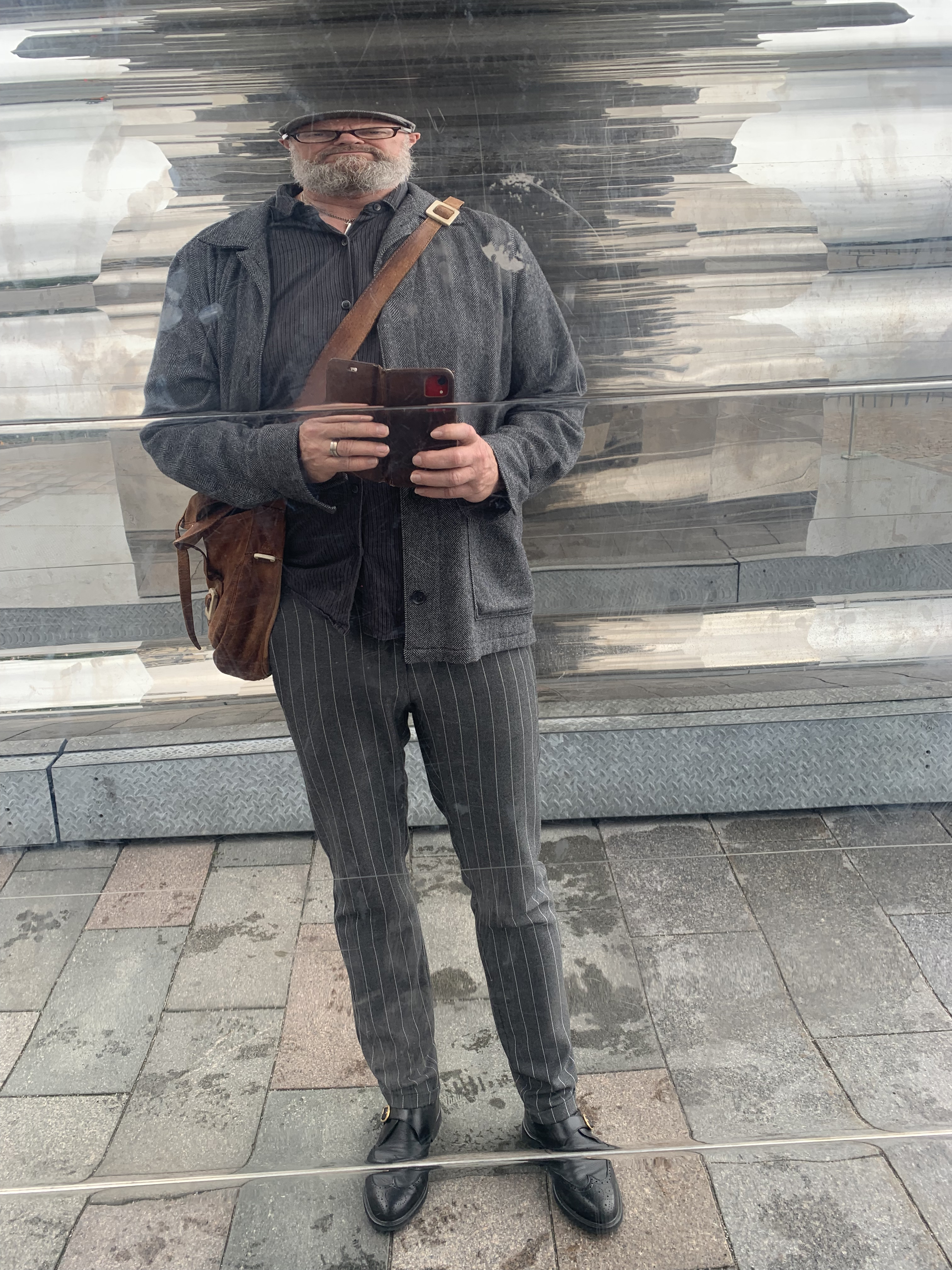 Lördag – Oscar Jacobson-kavaj (Erikshjälpen), Nudie-tischa (Erikshjälpen), Dockersbyxor (KFUM), Nudie-mössa (Ragtime herr) samt Tretorn-stövlar (Afound). Senare på kvällen regnjackan Regatta (inhandlad i Reykjavik, nyköp).