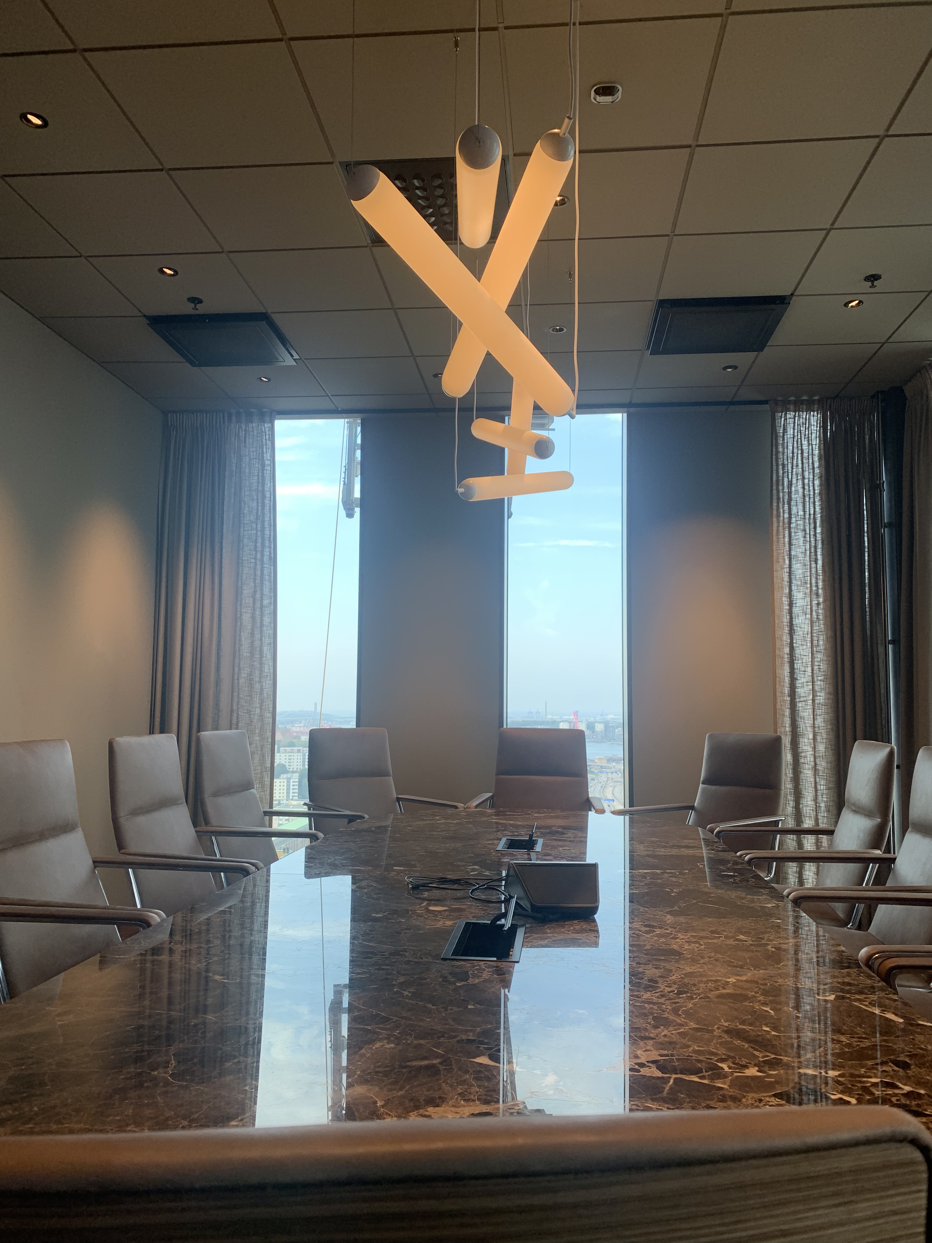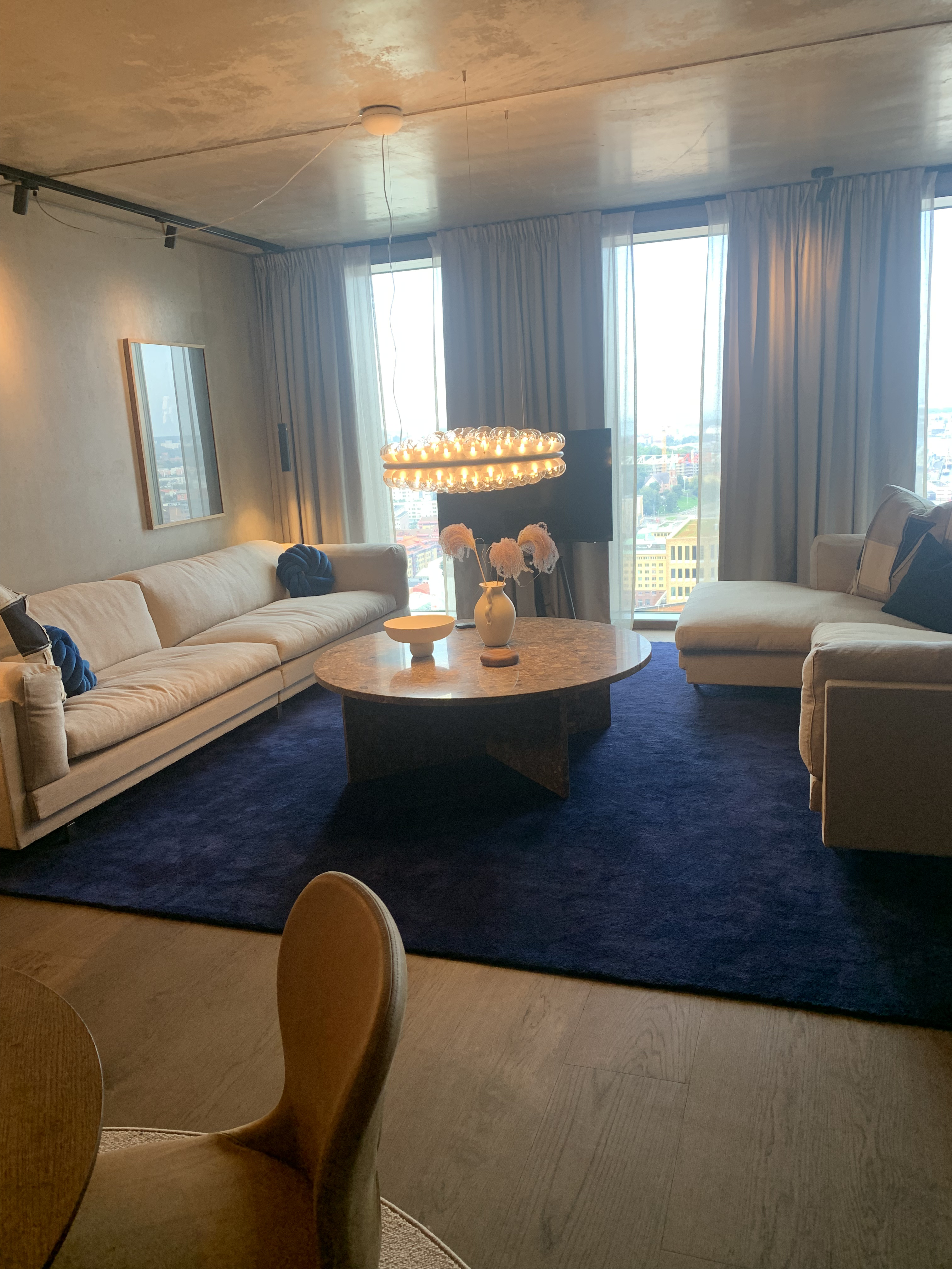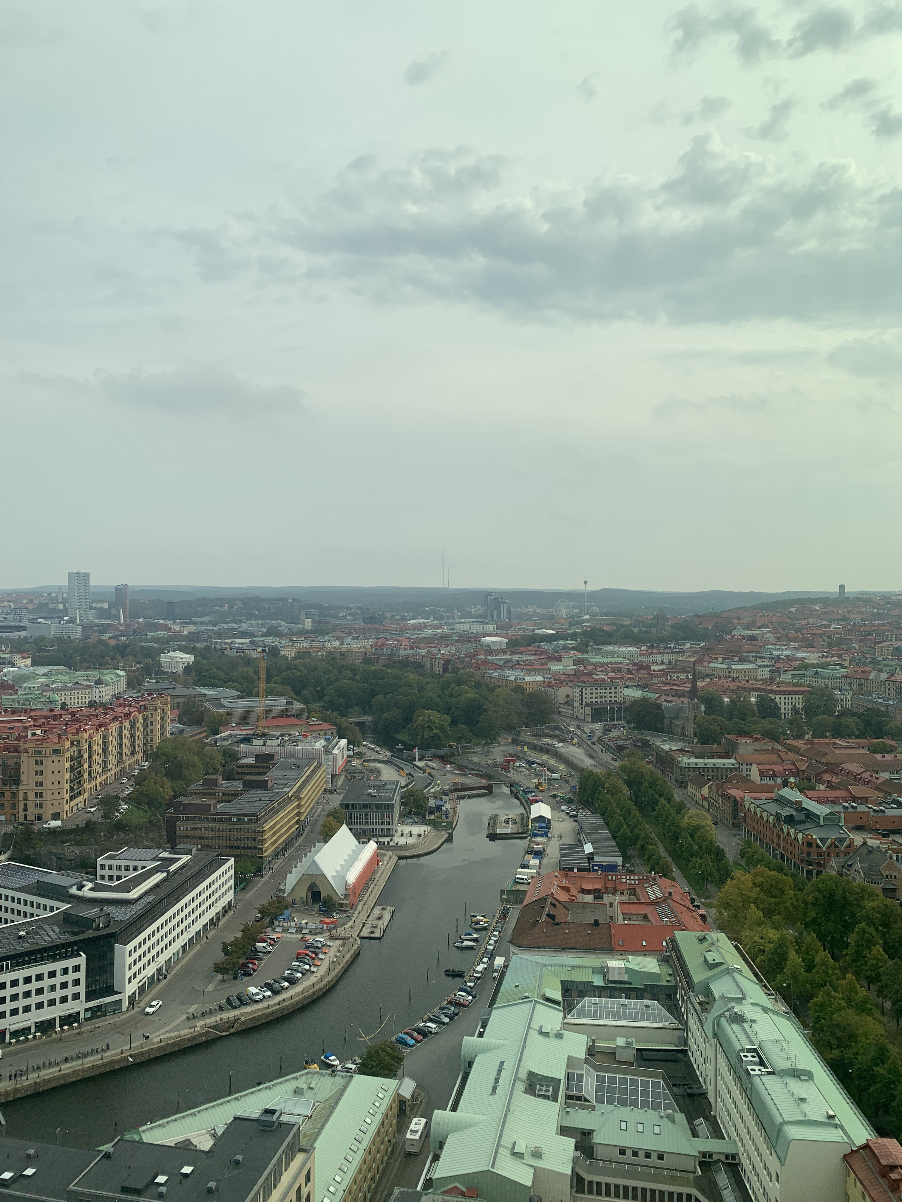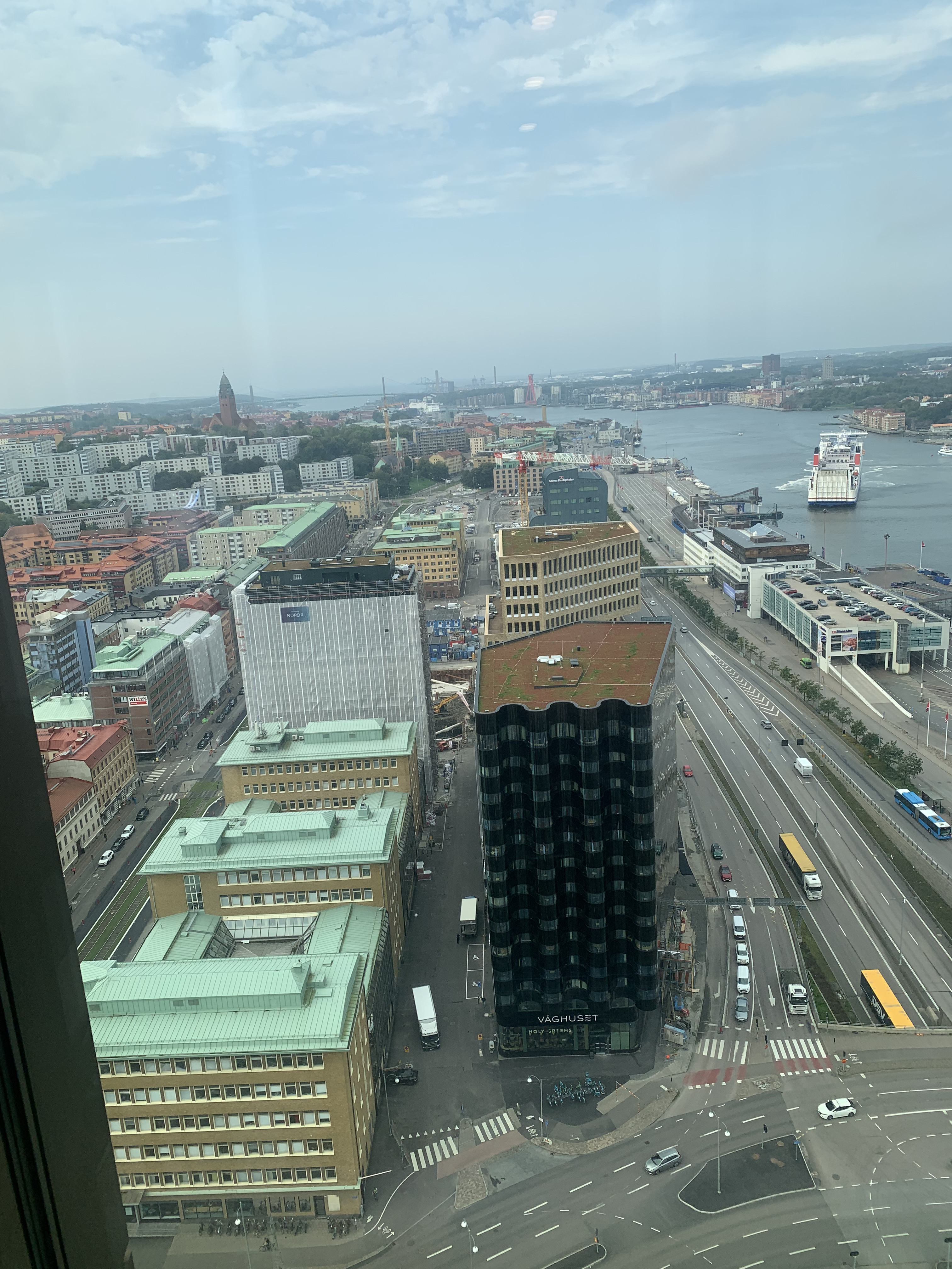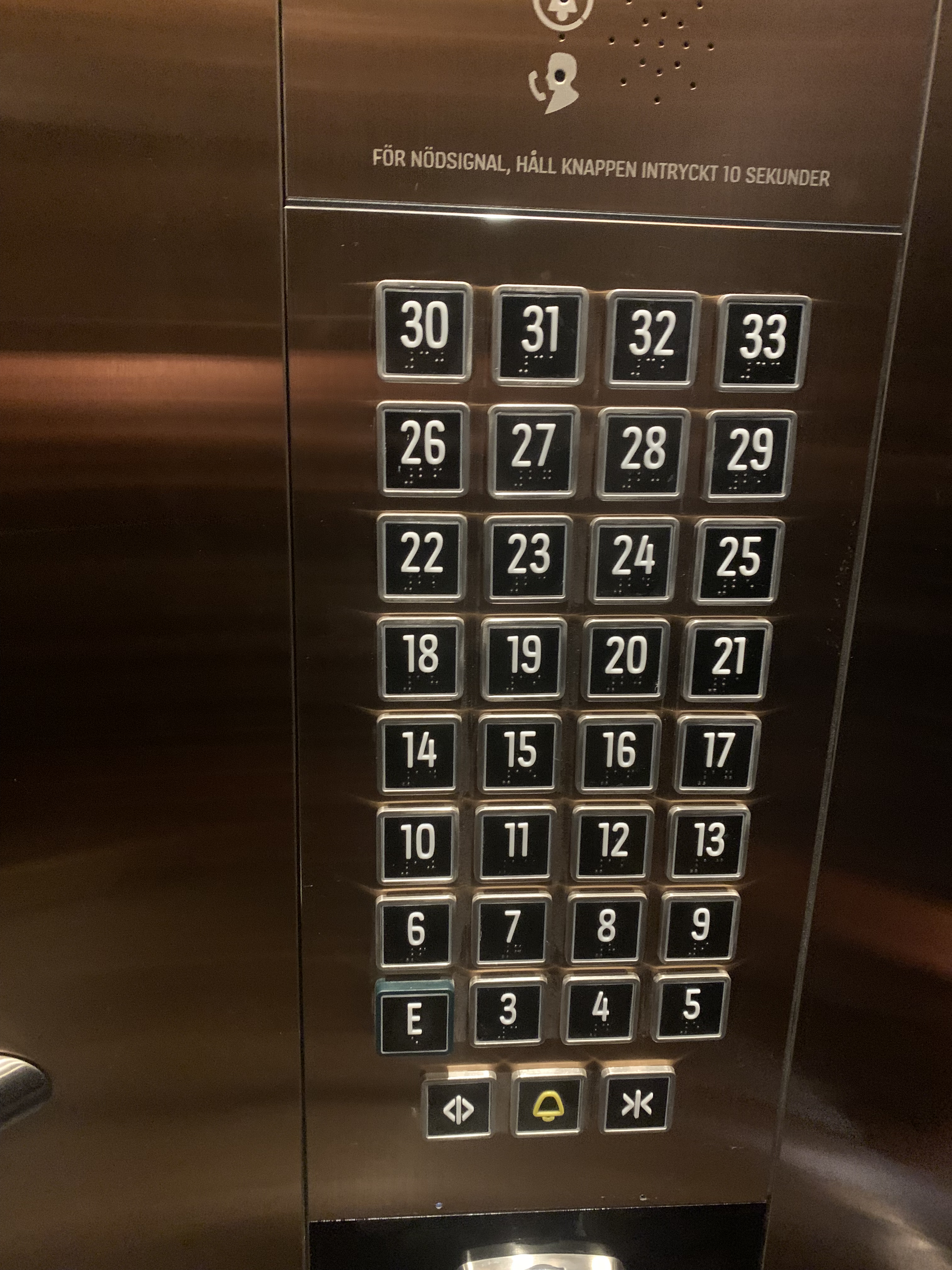 Jag hamnar i en uppåtgående hiss tillsammans med mannen från Balder, som var ansvarig för resandet av byggnaden. Han som jag åt lunch med under pressträffen då jag fick förmånen att gå husesyn. Han kom inte ihåg mig alls, var mest intresserad av sin hustru/flickvän/älskarinnan och blir påtagligt störd då jag lite vill går av vid 29:e våningen där han och hans sällskap går av. Jag ber om ursäkt och frågar om det går att ta trappan, blir visad mot en anonym dörr (var det verkligen inga skyltar om nödutgång…?), kämpar mig upp stegvis upp till den 33:e våningen där Brasseriet ligger. Utsikten är som alltid svindlande. Jag ställer mig vid hovmästaren bara för att ta mig en kik. På 34:e våningen är baren och full fest. Jag avstår.