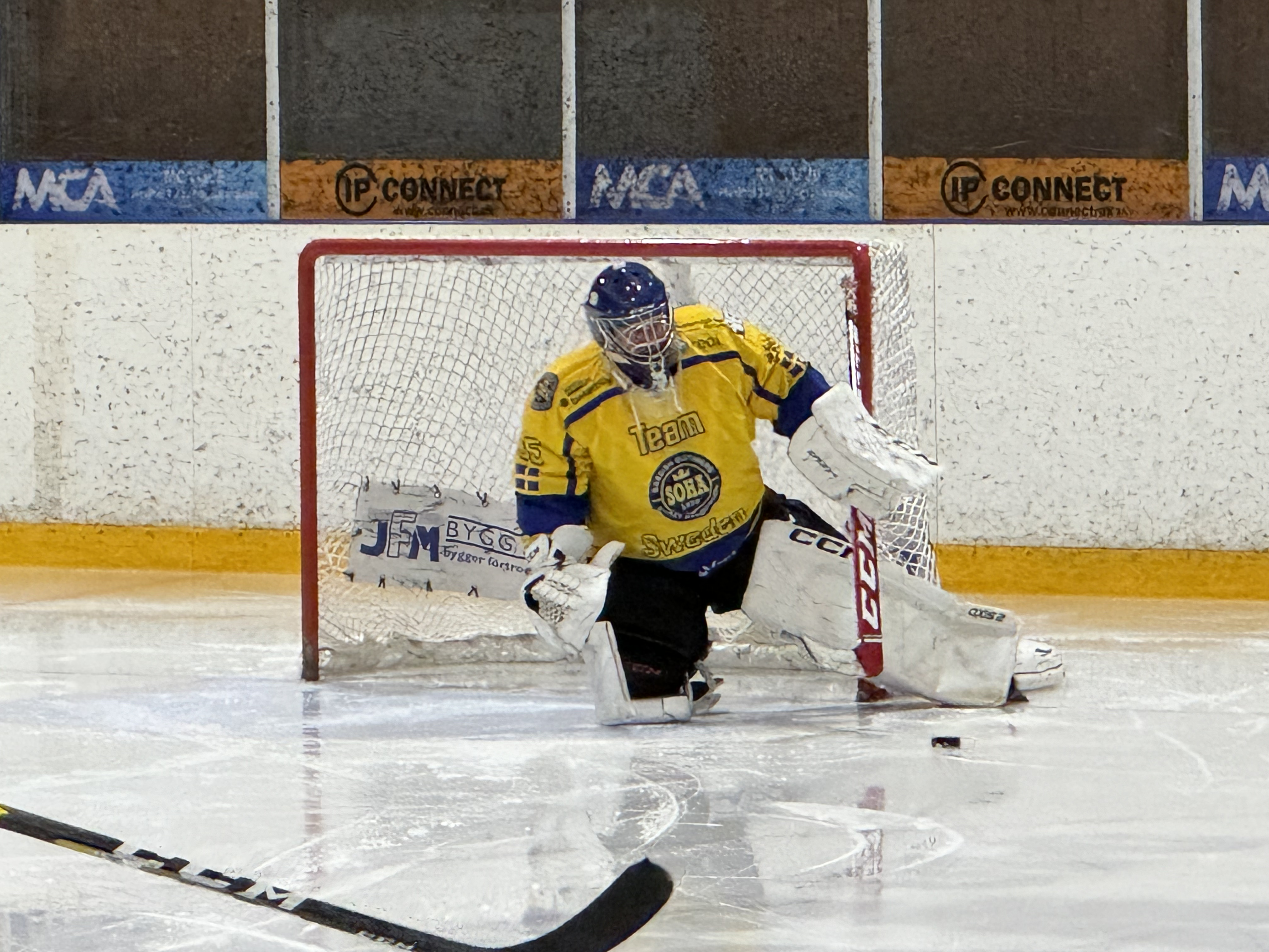 Vallentuna dominerar, men vi lyckas utmana och jag lyckas rädda. En puck slås in i zonen till vänster om mig och jag visar att min högerback ska ta ansvar för den. Jag skiftar från vänster- till högerstolpe för att höra att motståndarna jublar och domaren blåser.
