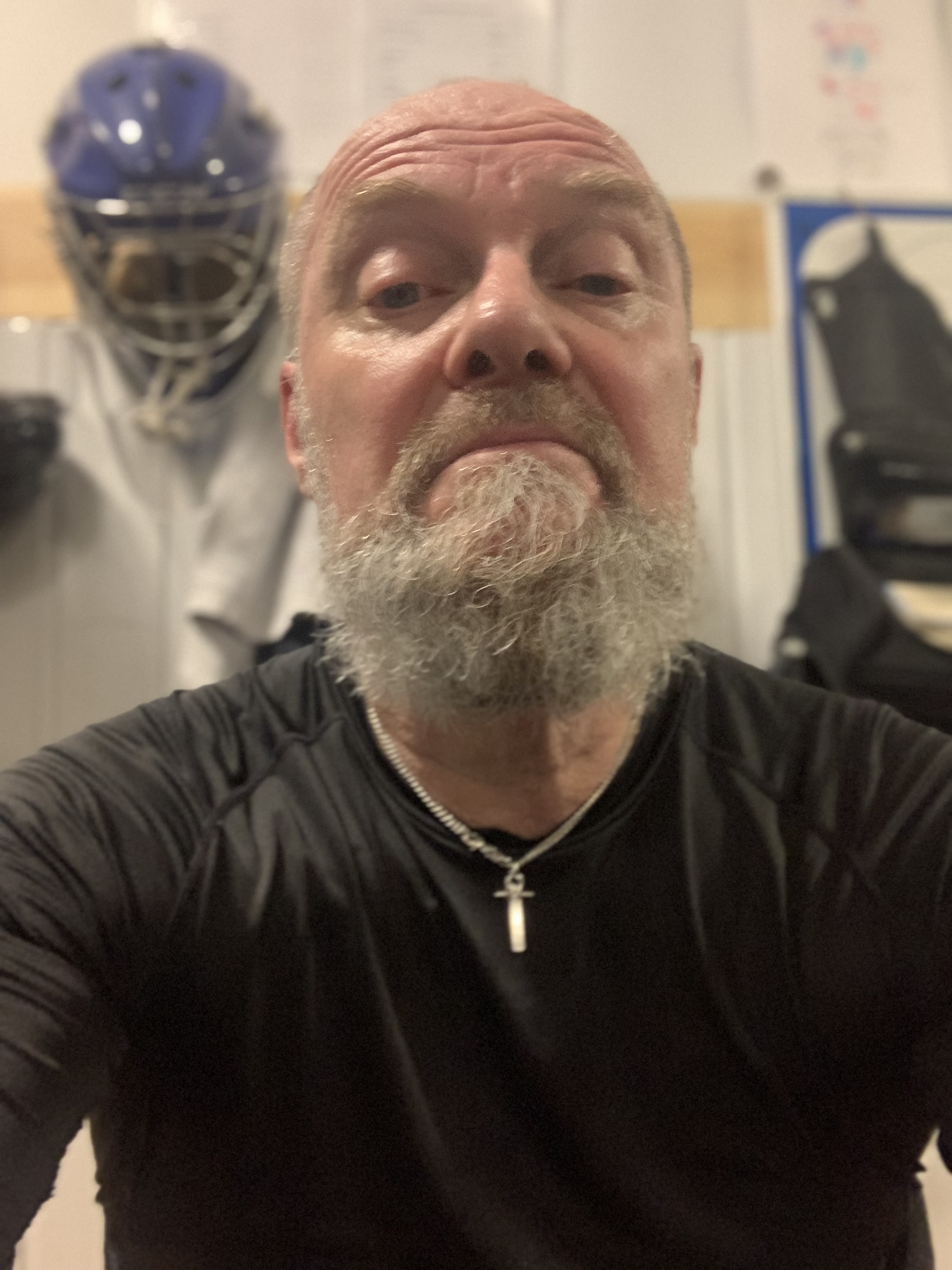 Mina grejer är torra sedan i fredags. Ska ju inte stå annat än som backup för Ove, som skötte sig fint mot Kringelstaden. Jag är ombytt tidigt och ställer mig på läktaren i överdragströja, men utan kombinatet, och tittar på matchen innan. Får en förfrågan om att låna ut min mask till en målvakt vars egen gått sönder. Hämtar den. Men väl på isen har han en vit; jag har en blå.