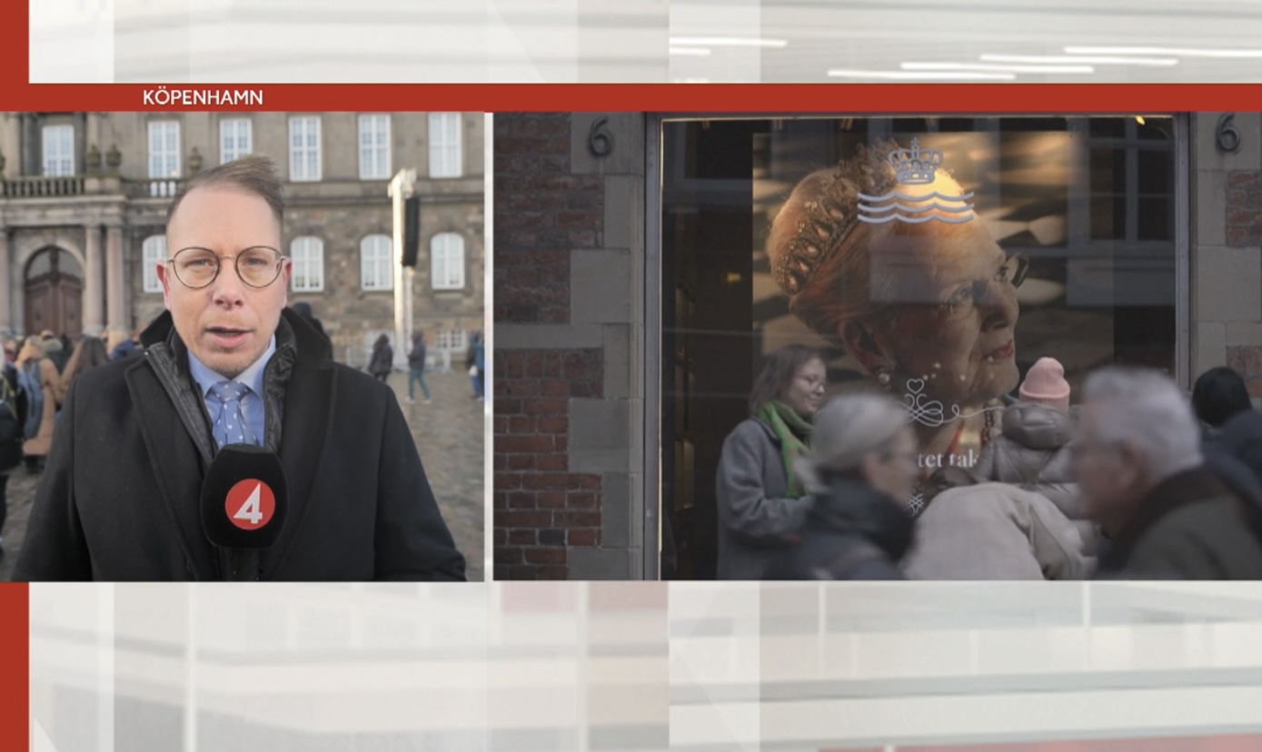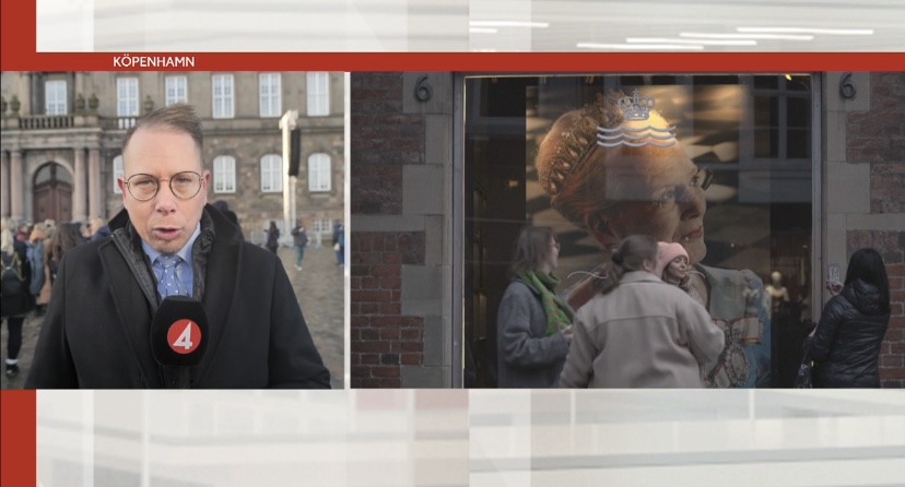 Nu är TV4 i Köpenhamn för att berätta om tronskiftet och står på plats centralt i den snart kungliga huvudstaden. Inslaget är en smula längre än vanligt och plötsligt ser jag Z med dotter på bild. I och för sig i bakgrunden. Jag skriker till så att Per ryggar tillbaka och undrar vad som försiggår. Men då är inslaget över.