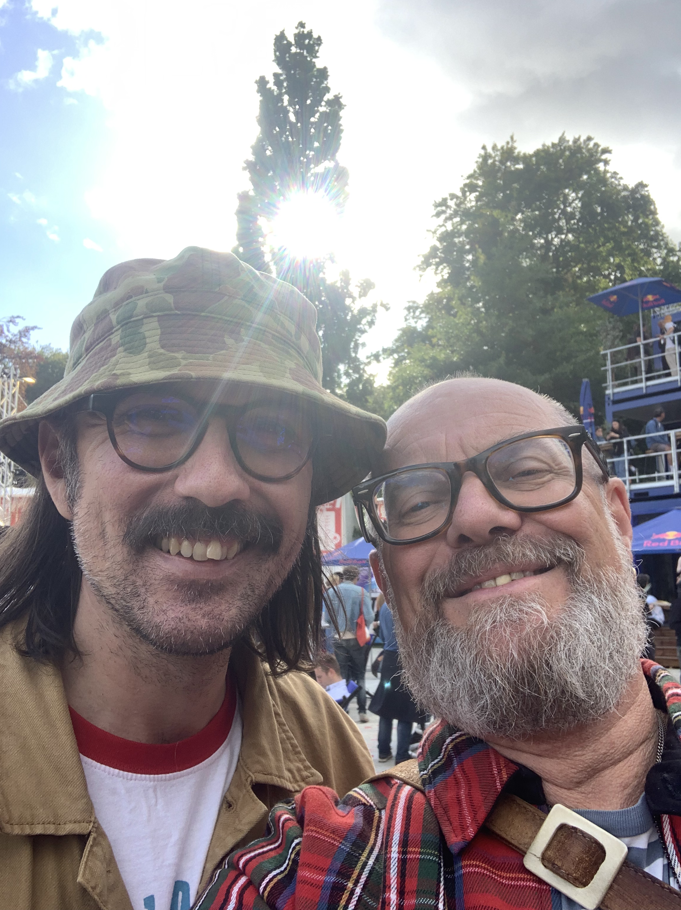 Vi får gå i en vid U-sväng på Ringvägen för att komma in, men ingen större fara. Vi är nära på där då portarna öppnas. Vi kan med andra ord ställa oss ganska så bra när resten kommer. Jag försöker få kontakt med någon som kan hjälpa mig med Gaffatejp, så att jag kan bristfälligt fixa klacken. Men det funkar så där. Z smiter iväg för att köpa mat och jag stannar vid en rektangel där en kamerakille står för sitt uppdrag. Skyddad av staketet kan vi slippa stök bakom oss och se bra. Z dröjer. Men först kommer Henrik Wallgren, allkonstnären från Brännö som precis fått Lasse Dahlquiststipendiet, sedan Kalle Malmstedt, som är på plats med sin fru. Göteborgare, förstås. de första jag känner som jag stöter på. Den förstnämnde är inte bara allkonstnär utan också en fixare av rang. Han har – tillsammans med Gustav Martner (kreativ chef på Greenpeace) – fixat den stora Bob Hunden med pipa i mun så att pipan ryker när bandet kliver på scen och hunden sedan stiger upp mot scenhimlen. Klart han kan ordna Gaffatejp till mig. Han lovar återkomma.