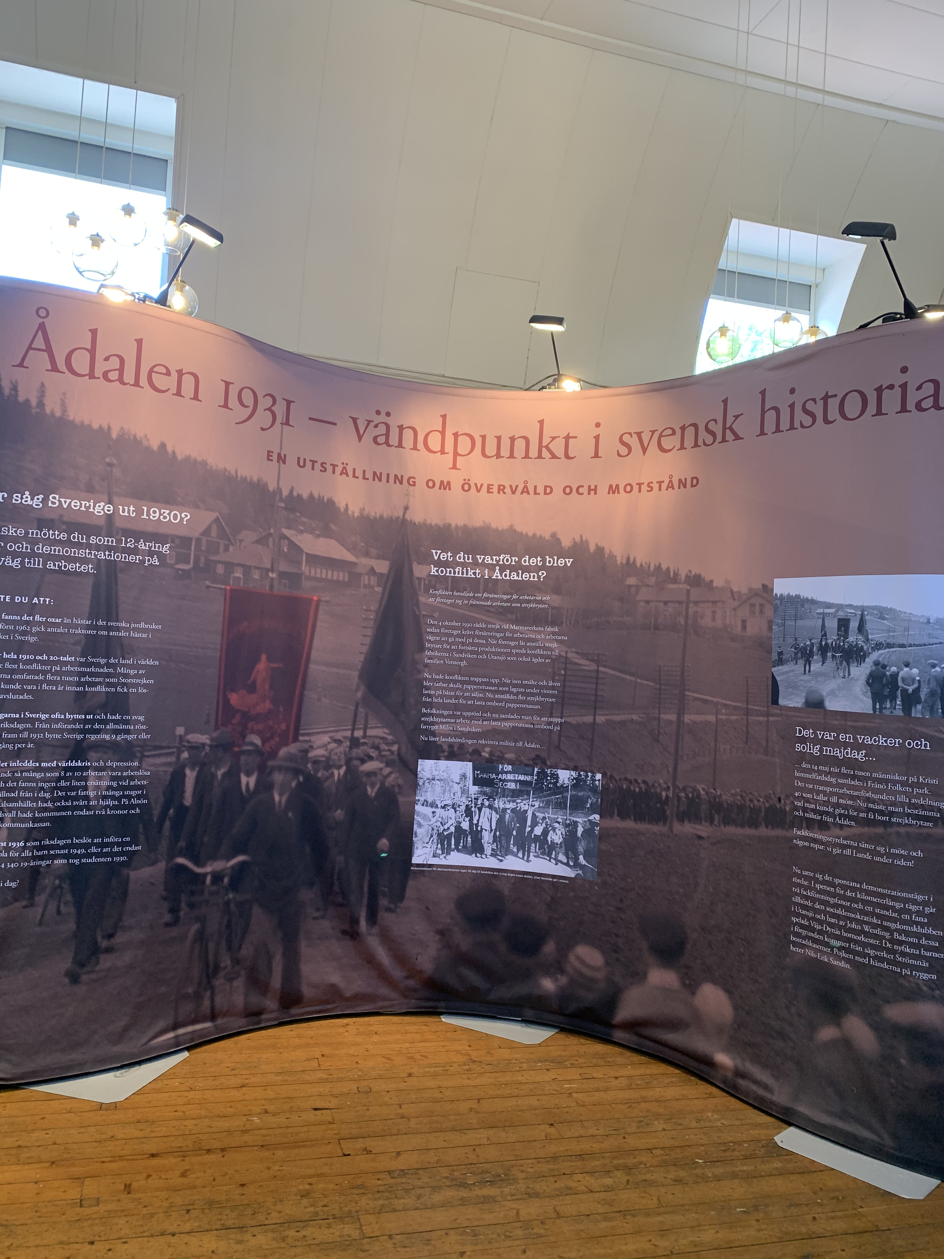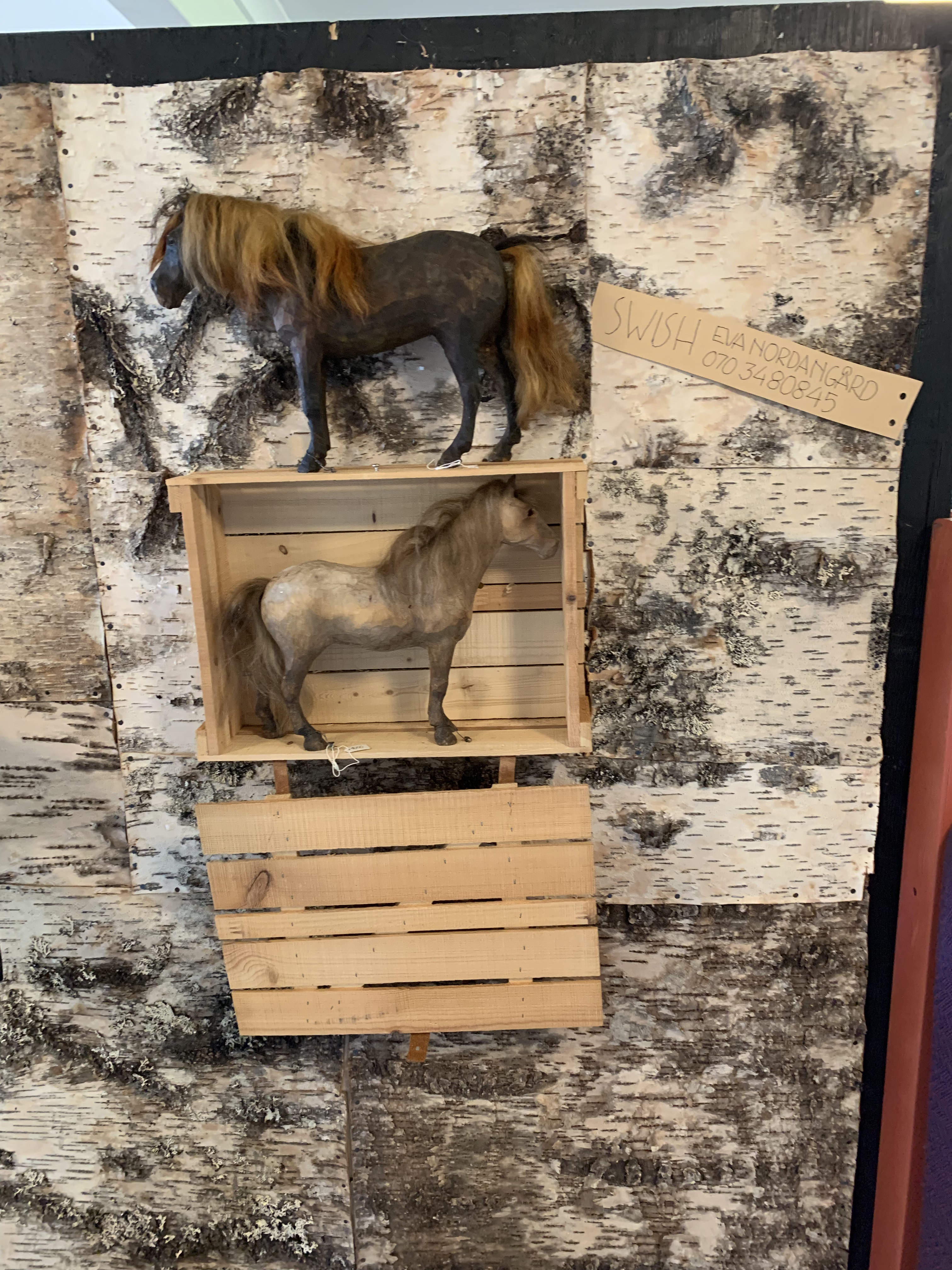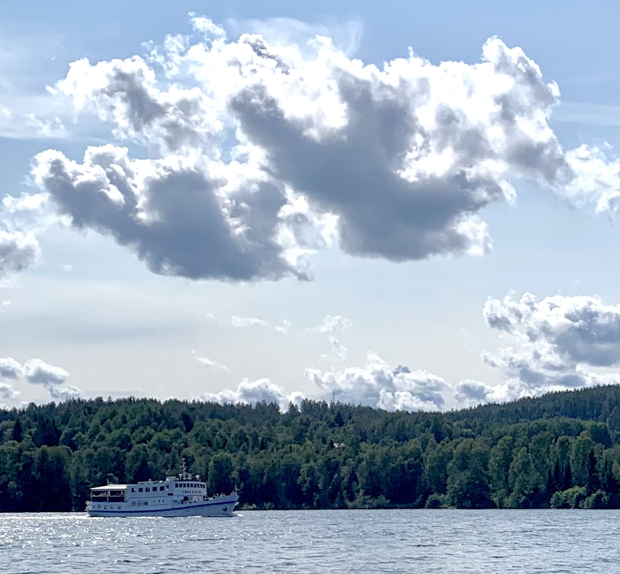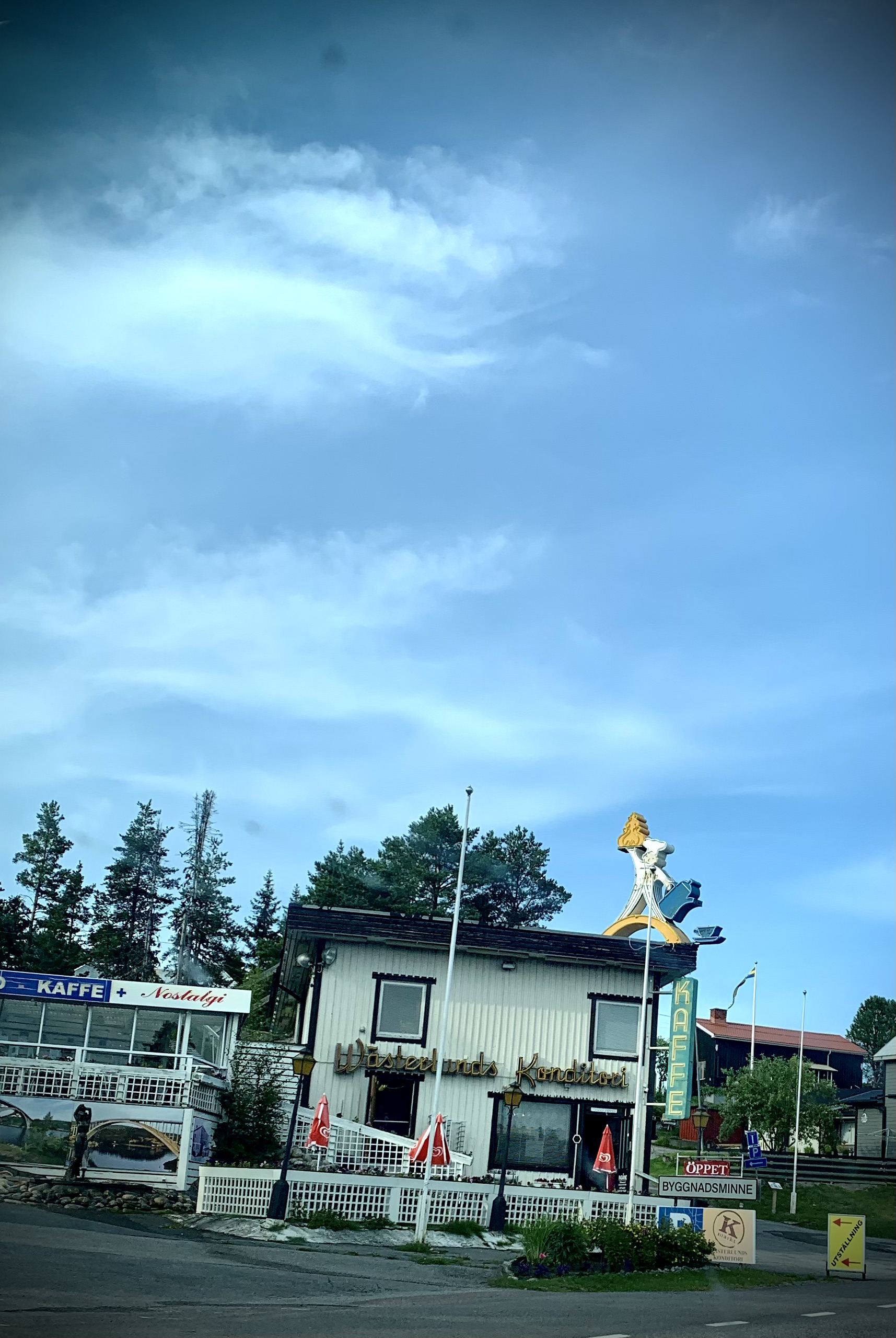 Vi går till den väldiga byggnaden på Hålludden vid Baggensfjärd. Går in, snokar runt lite, betalar entré – där vi får reda på att på promenaden i skulpturparken ingår – och kliver sedan in i Lars Wallins värld. Den som skildrar han skapande från starten, genombrottet till nu. Det är fantastiska kreationer och fantasifull sömnad av hög klass. Oerhört fascinerande, men också en smula beklämmande. Alla modellerna tillhör människor med smala midjor. Få, om ens någon, är för kvinnor med former i den större skalan. Och herrkläder…? Nja, någon smoking. Trist och det, tycker jag/vi, tar ner upplevelsen.