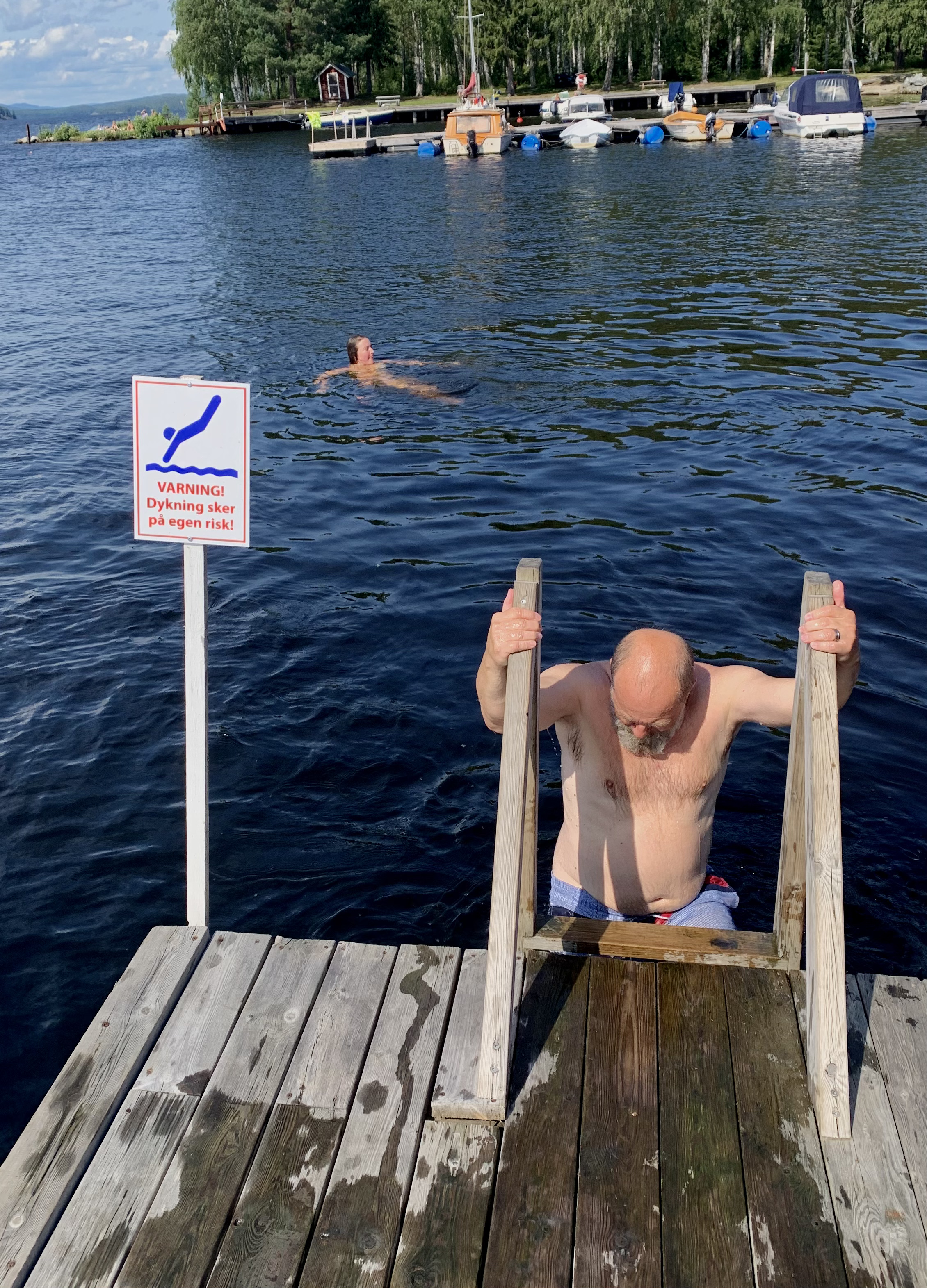Vi vaknar. Tar handduk och badkläder för en lite annorlunda väg ned till Klipporna i Vinterviken och Örnbergets bryggbad för ett morgondopp. Strandpromenaden är flitigt använd av promenerande och jobbare. Det är fler än vi som badar, men vi gör oss plats. Mälarens vatten är friskt, kallare än på västkusten. Men vi njuter ändå. Z alltid lite extra, som flyter avslappnat i vattnet länge för full avkoppling.