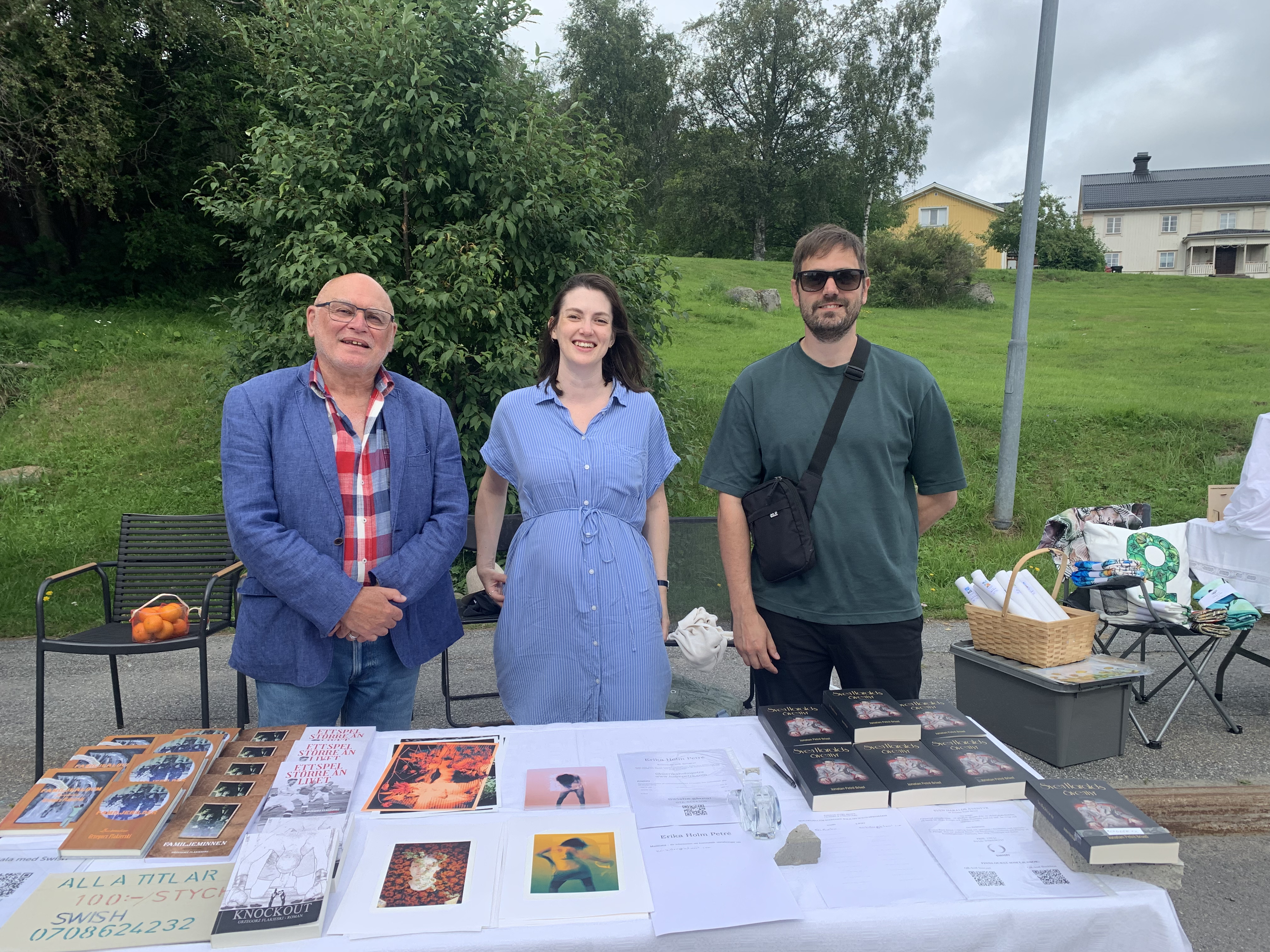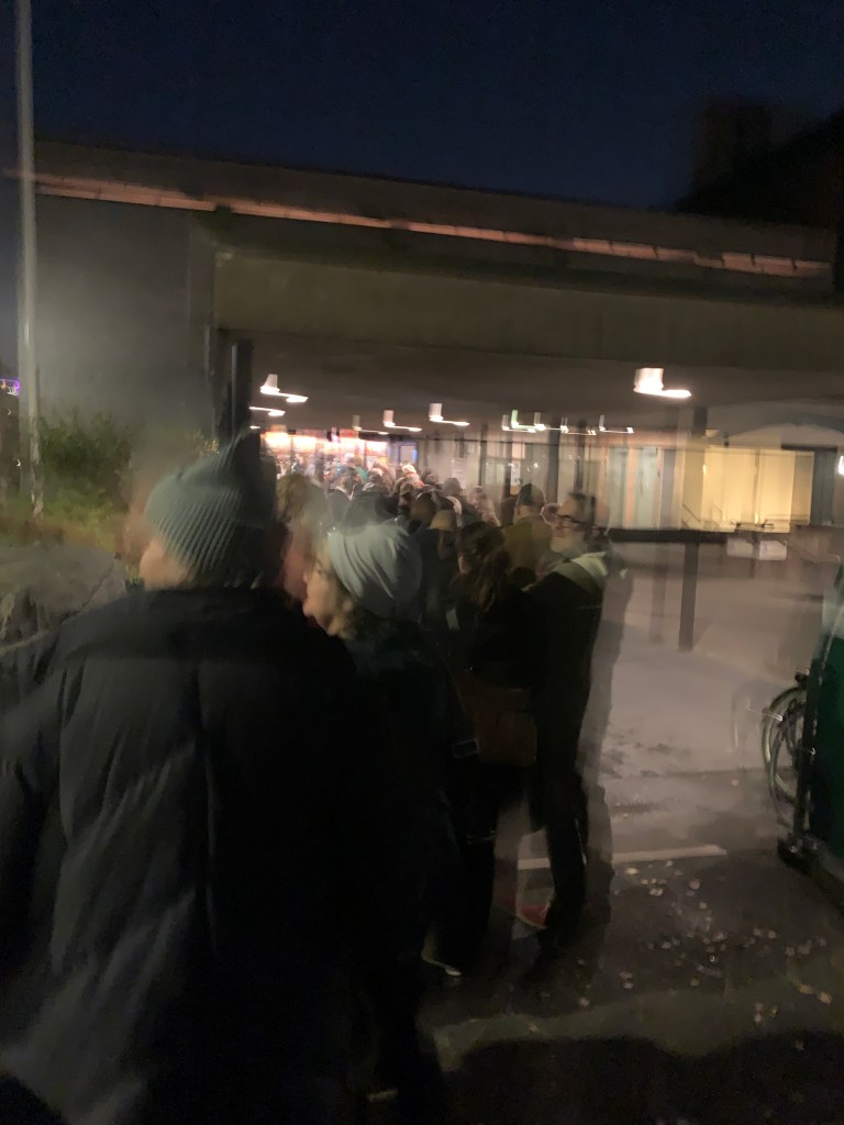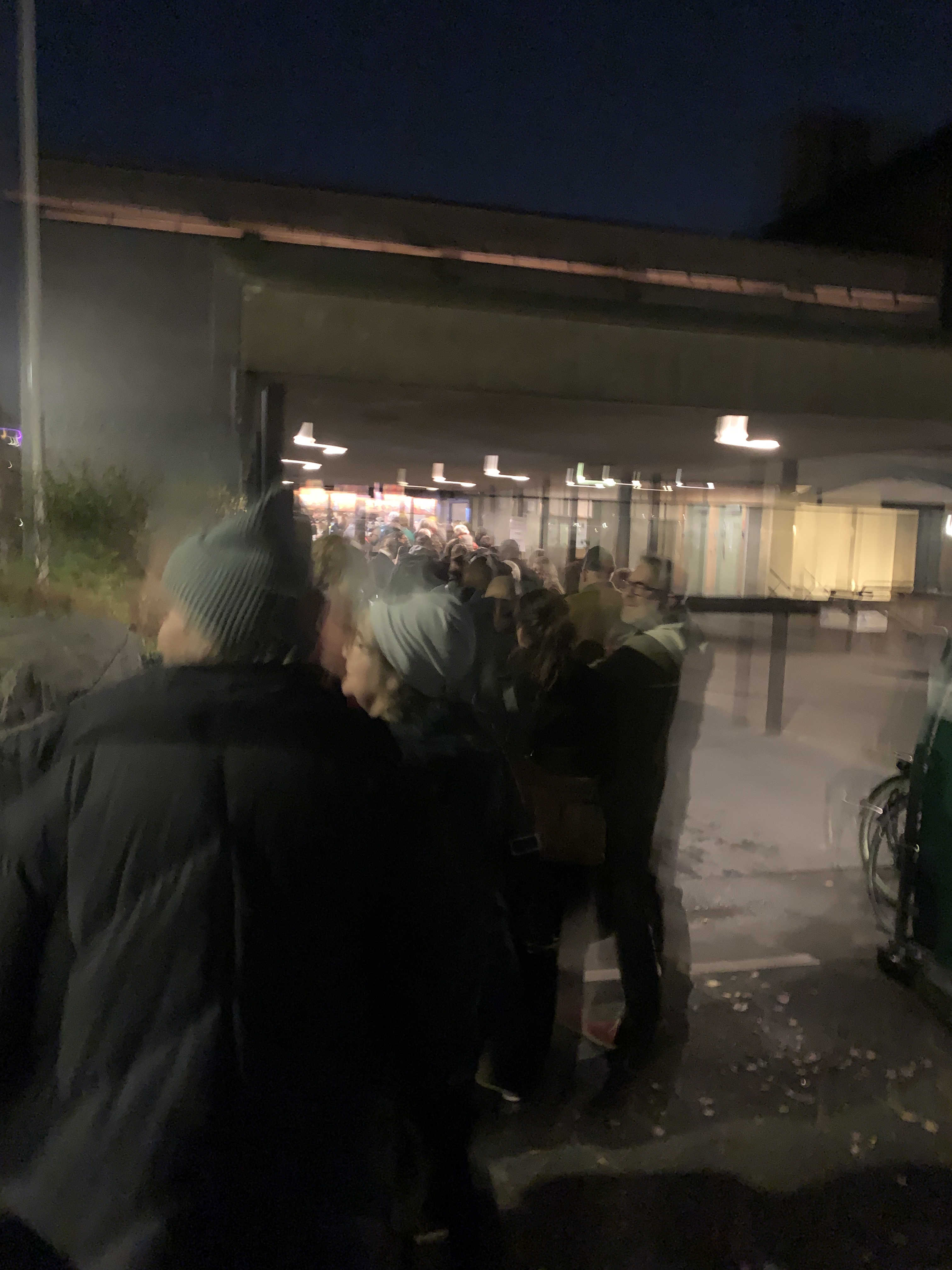 Vi tränger oss in till utställningen. Tränger oss ut igen. För mycket folk för att få ordning på någonting.