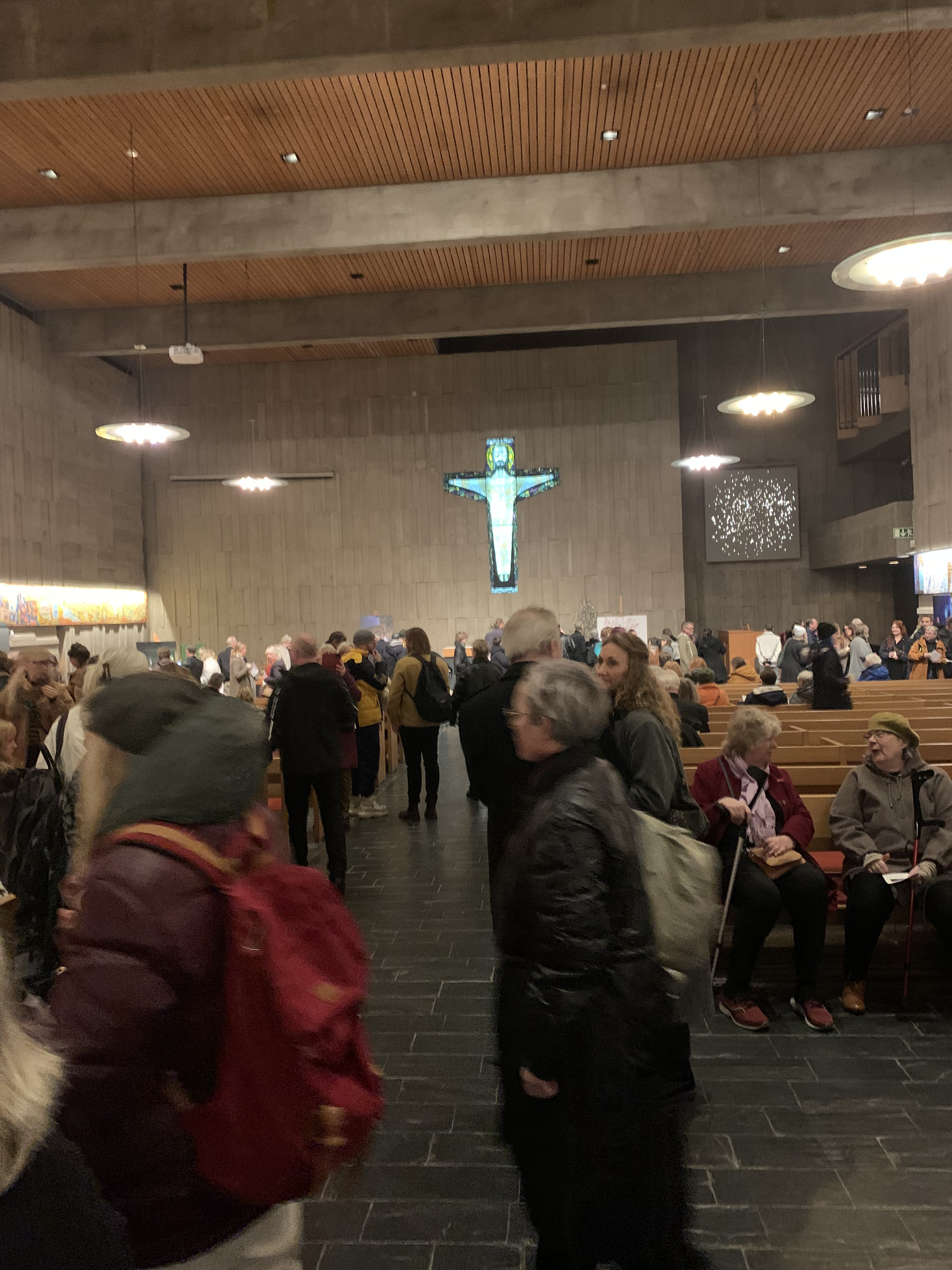 Nu har hon gått ur tiden, men hennes verk lever kvar. Vid vernissagen i måndags, som startade klockan sex på kvällen, var kön långt ringlande utanför Högsbo kyrka. Polis var på plats, men stämningen var god. I sakta mak rörde sig kön in i kyrkan och från foto till foto i samklang med Knut Irwes vackra mosaik som klär väggarna.